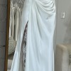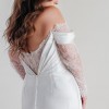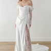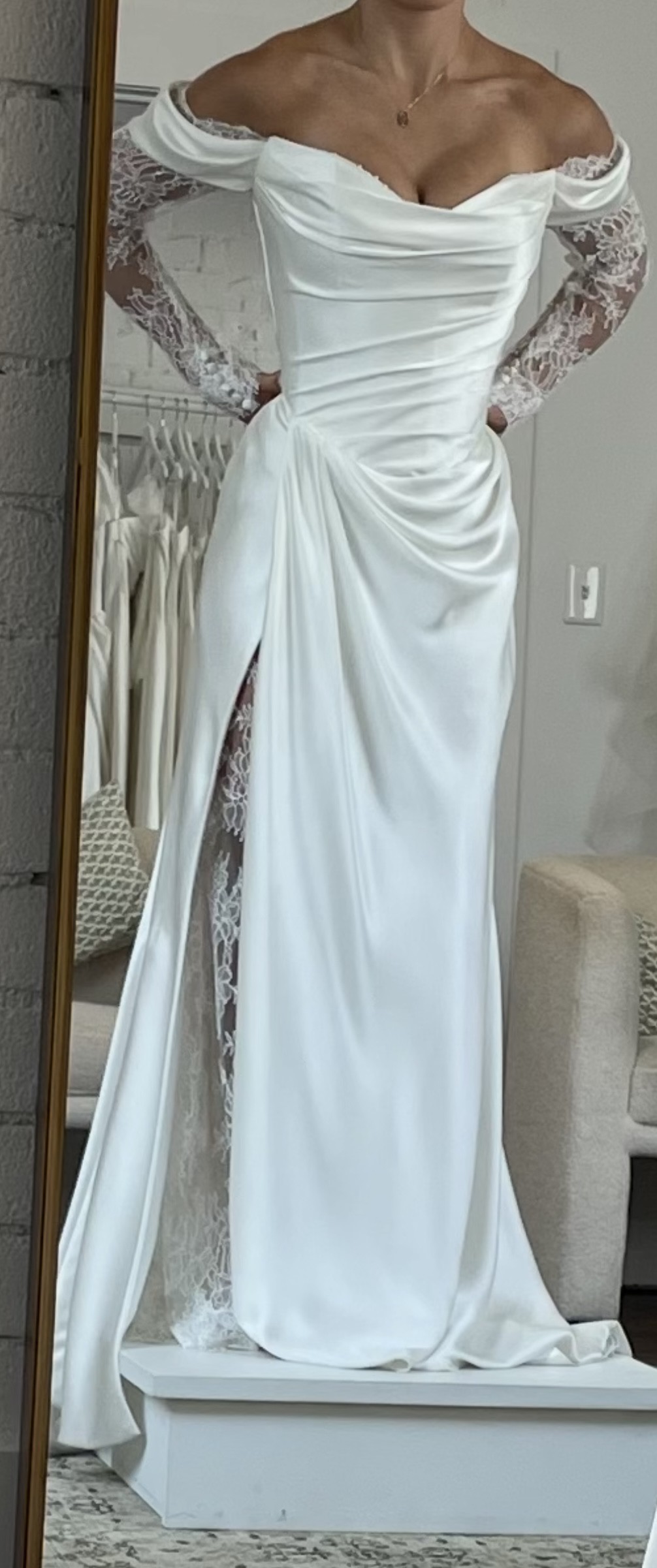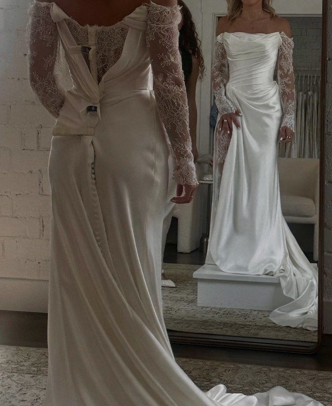 This is a satin gown with a lace underlay which peaks out beneath the slit, and is shown on the sleeves. The off the shoulder sleeves and lace sleeves can both become removable if desired and be worn separately (pictured without off the shoulder sleeves in photo #1).