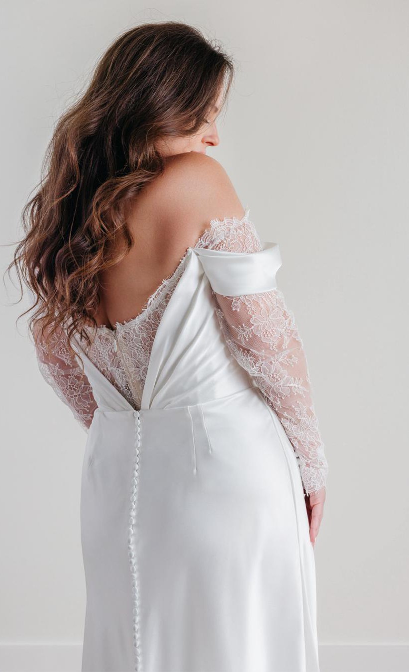 BRAND NEW STRAIGHT FROM DESIGNER. Never even tried on. Made from Polished Satin, Highclere Lace, Soft Netting, and Polished Satin Buttons.