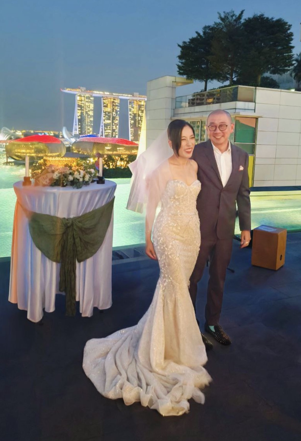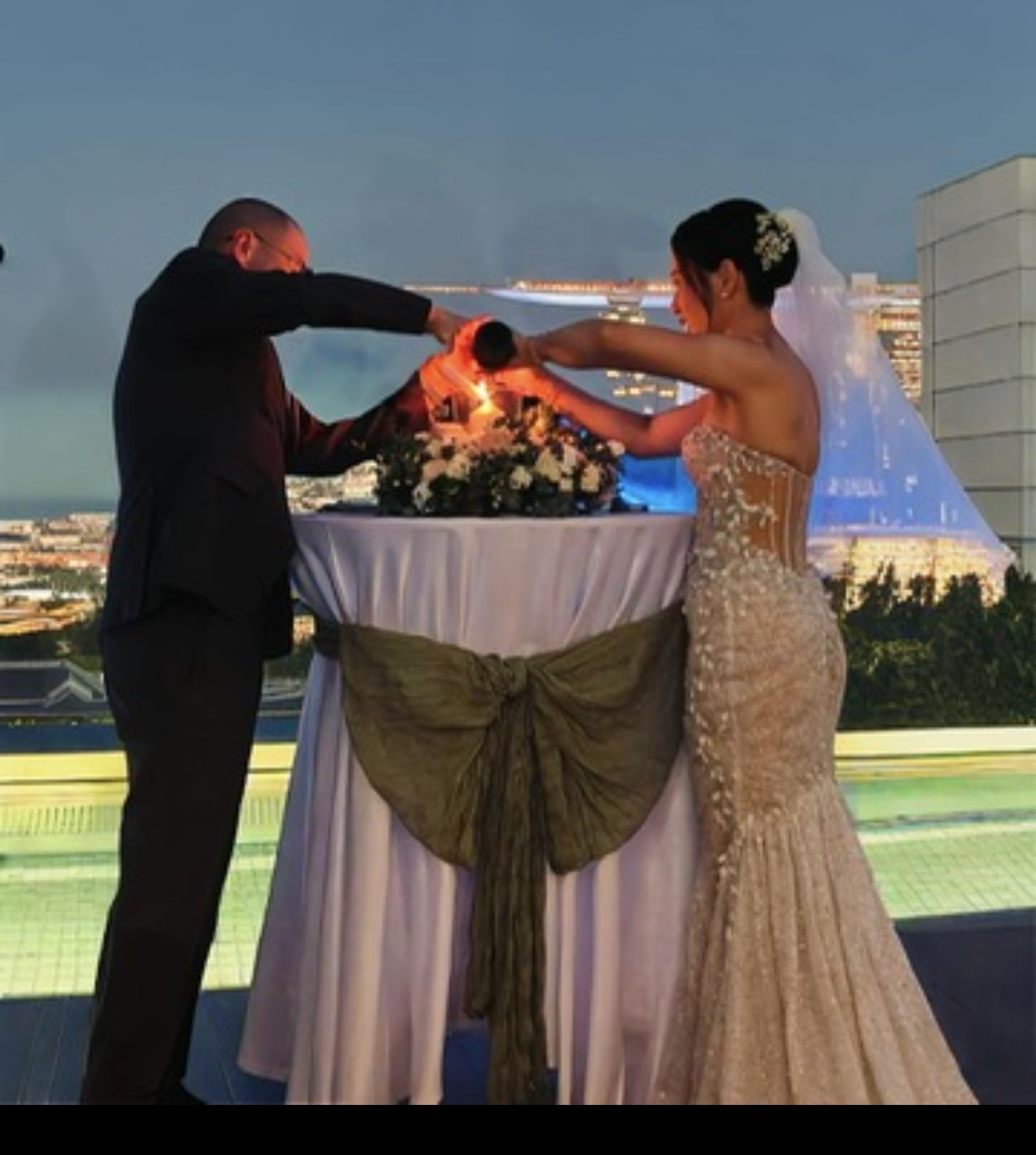The low back design provides just the right amount of allure, complemented by the delicate beading, crystals, and intricate embroidery that catch the light with every movement. The front hem is taken in for a high-low length that offers a unique twist, allowing me to showcase my bridal shoes while maintaining a classic feel.