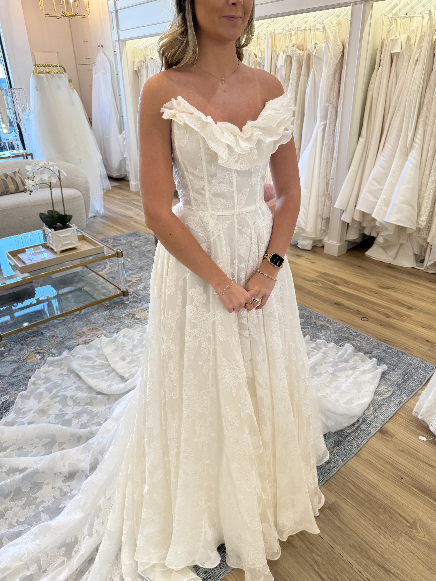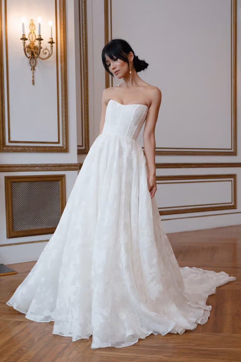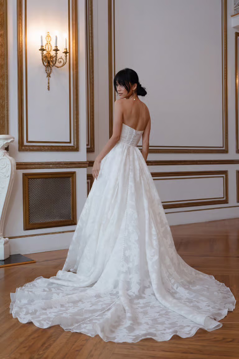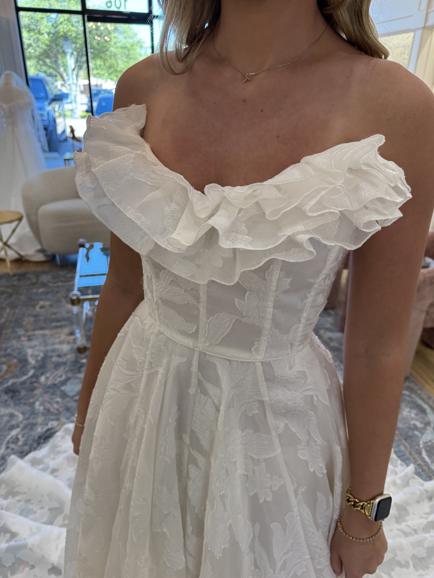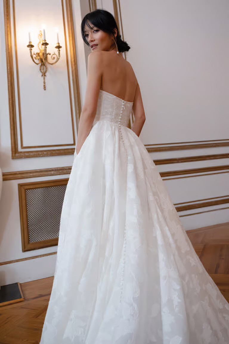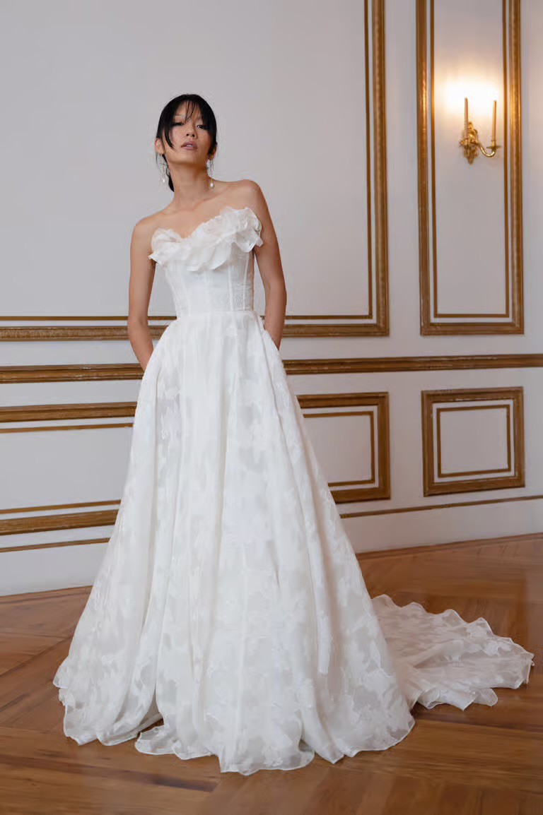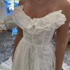 Store sample - no alterations - detachable ruffle detail at the neckline - The Willa gown, cut in our beautifully lustrous textured Florian burnout jacquard fabric is a true romantic. Featuring an endlessly flattering corset bodice with exposed boning detail, and a dramatically organic ruffle at the sultry scoop neckline. The light as air fabric moves beautifully in the full ball skirt, and covered buttons to the hem finish the gown with a classic bridal detail.