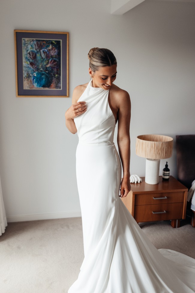 The Rafferty dress by Chosen By KYHA is truly the perfect combination of sexy and sophisticated. The halter neck is classic and allows for a beautiful backless moment which is really flattering in photos. The top features cups for support in the bust so no bra is needed, and the beautiful material has a slight stretch to it making this dress as comfortable as it is beautiful. Perfect for the more casual bride still looking for elegance.