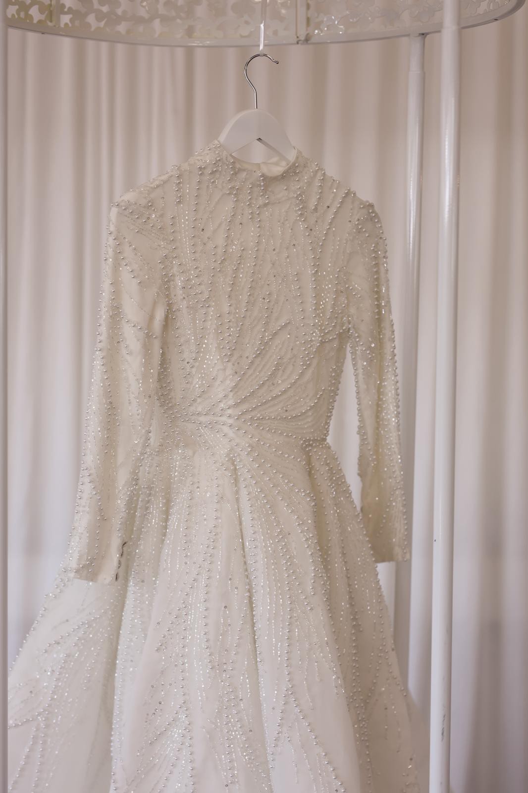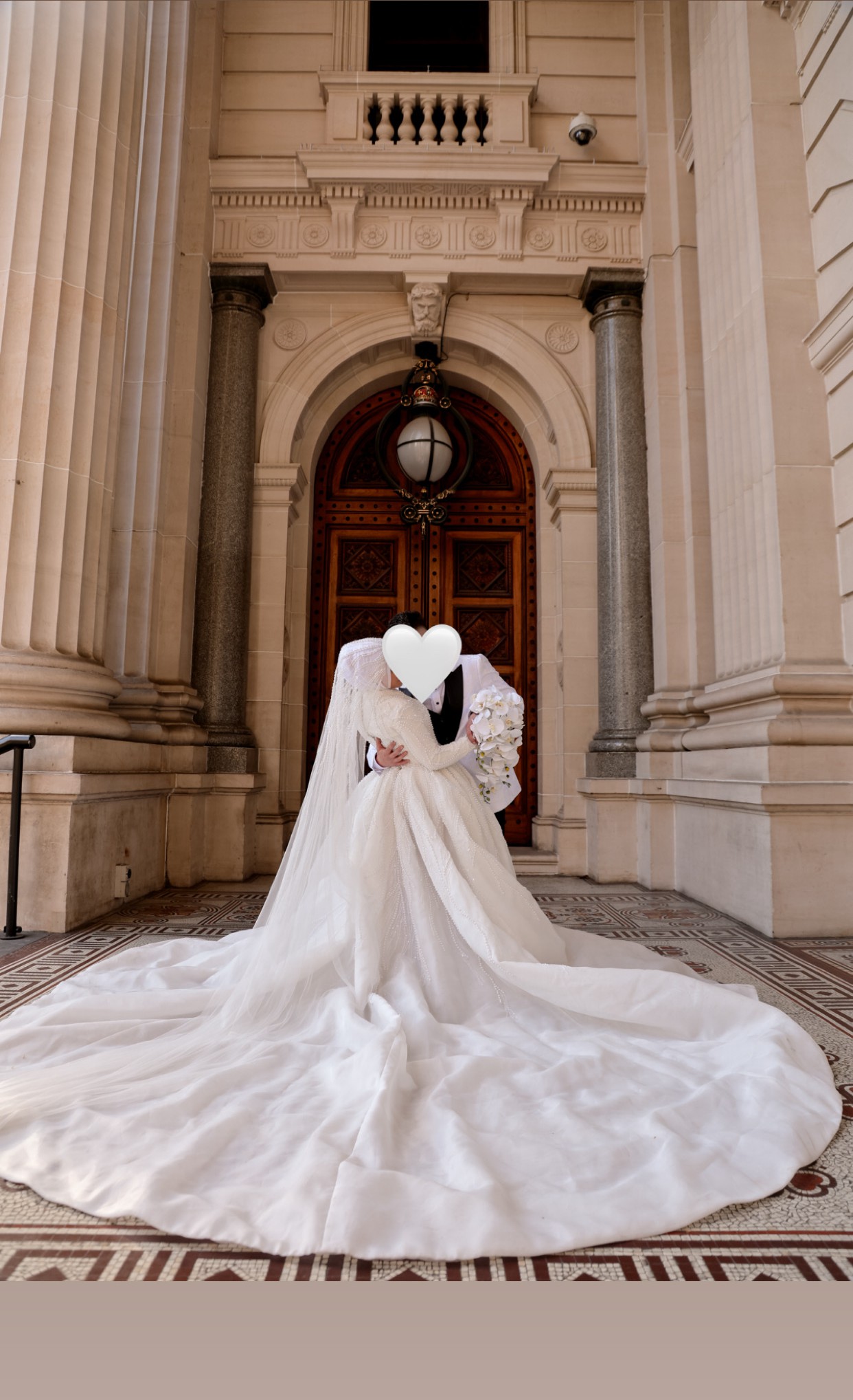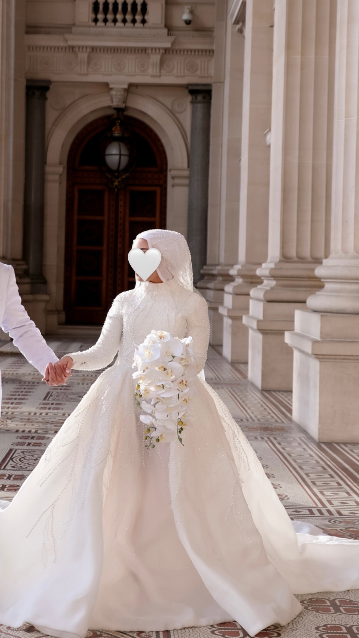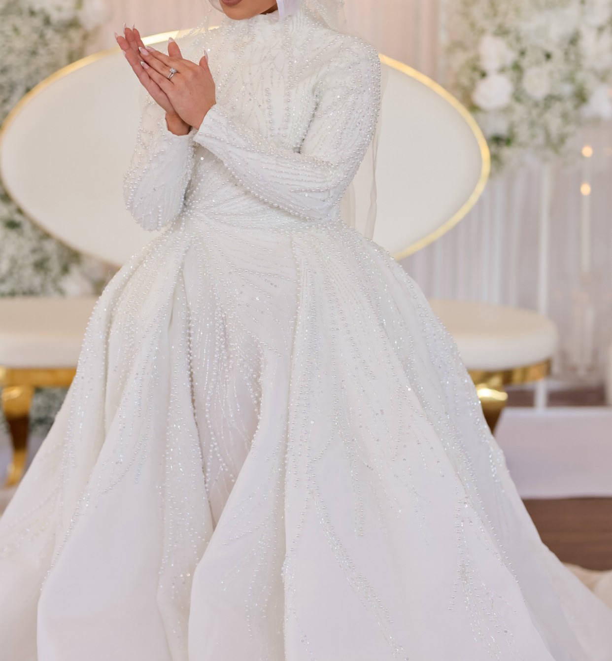 This is a hijab friendly beautiful wedding dress made by Fatima K and remains in excellent condition!! Very comfortable!
