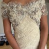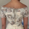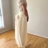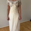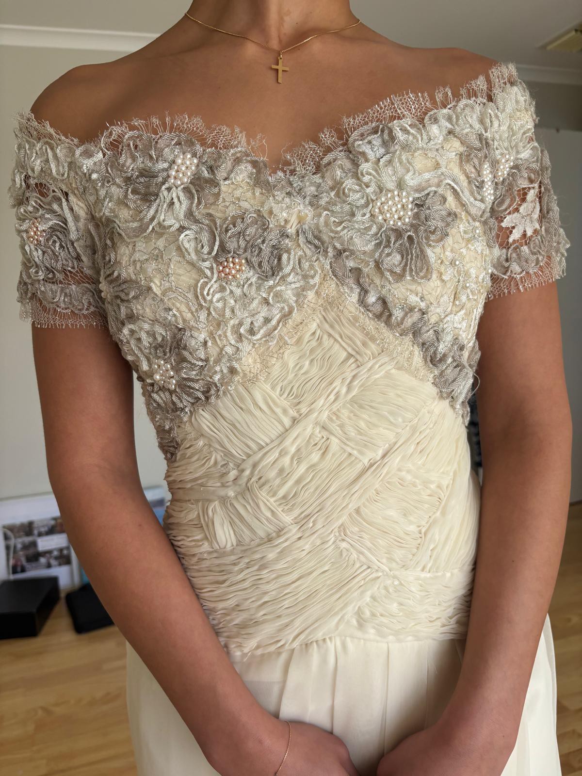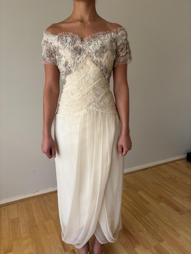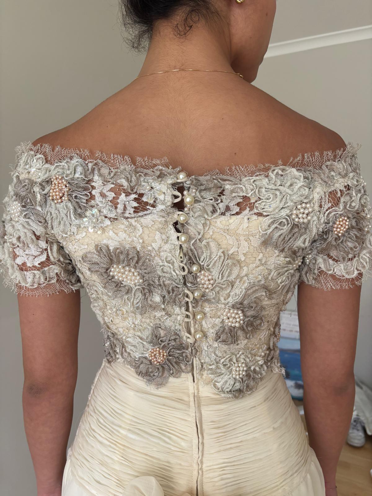 An elegant and romantic aesthetic, high-end couture custom made by an amazing French designer overseas .. it's got with its combination of heavy embellishment, delicate sheers, and unique look & feel. The dress has a lovely shade of ivory & cream, with a luxurious feel. The skirt is made of a flowing, sheer chiffon fabric over an opaque lining, creating a soft, ethereal drape. The bodice is featuring two distinct sections: Top Section: This off-the-shoulder section has short, sheer sleeves and is heavily embellished with lace appliqué, beading, and pearls. The lace has a floral or organic motif in shades of ivory and soft taupe, giving it a rich, multidimensional look. The neckline has a delicate lace trim. Mid-Section/Waist: Below the embellished top, there is a tightly ruched gathered fabric that crisscrosses across the waist and midriff in a woven, basket-weave-like pattern. This section provides structure and contrasts beautifully with the ornate top and flowing skirt. Skirt and Back Details The skirt is full-length and flows from the ruched midsection. Front Skirt: The front has vertical pleating or draping, giving it a soft yet structured look. Back Detail: The back features a prominent, romantic detail where the bodice meets the skirt. There is a large, multi-layered fabric flower or bow appliqué sitting on a draped/ruched band across the back waist. Ribbons cascade down the center back, flowing over the skirt. The sheer outer fabric of the skirt drapes loosely, pooling slightly near the floor in the side view, suggesting a slight bubble effect to the hemline. Price negotiable