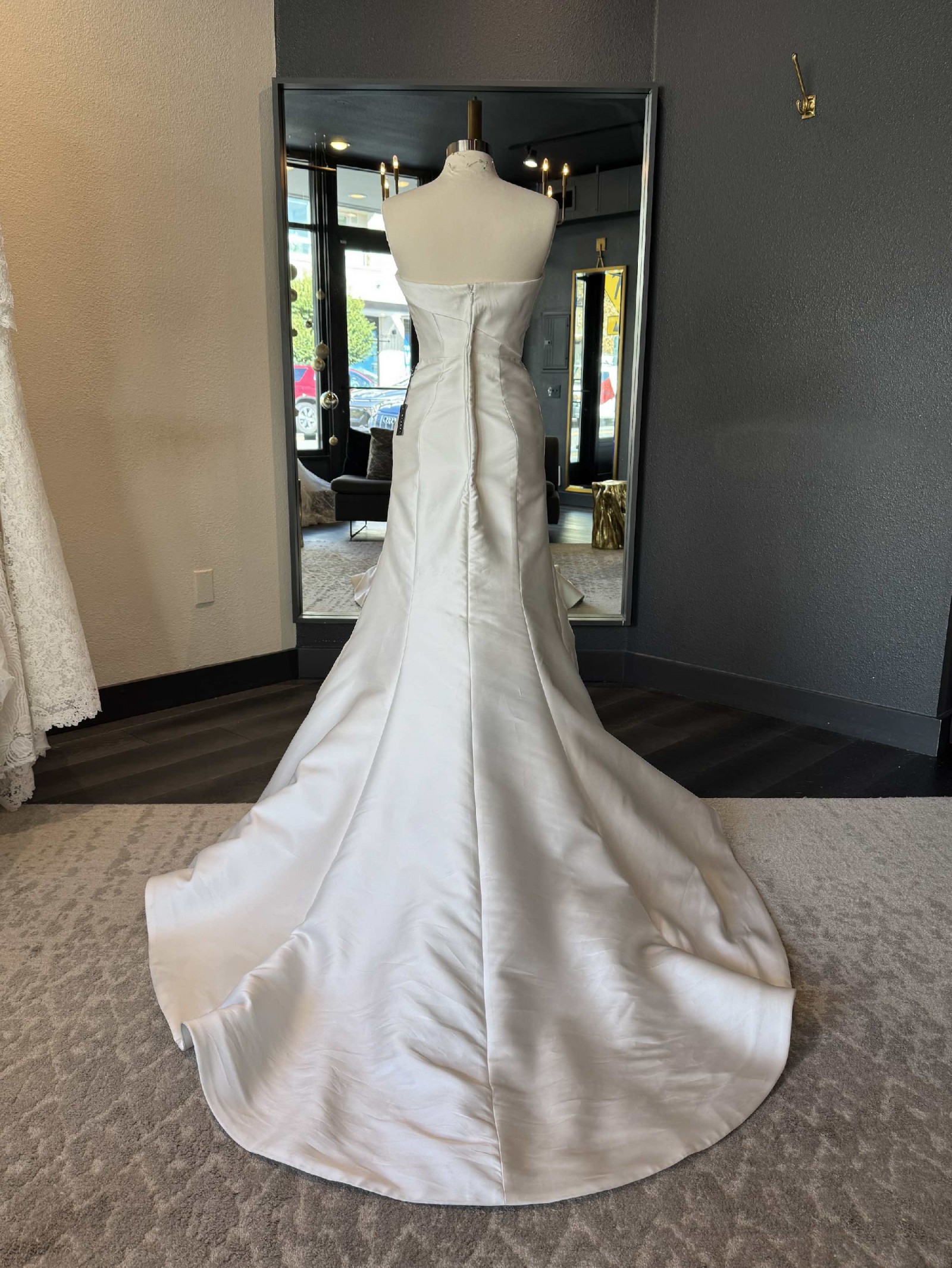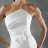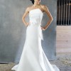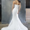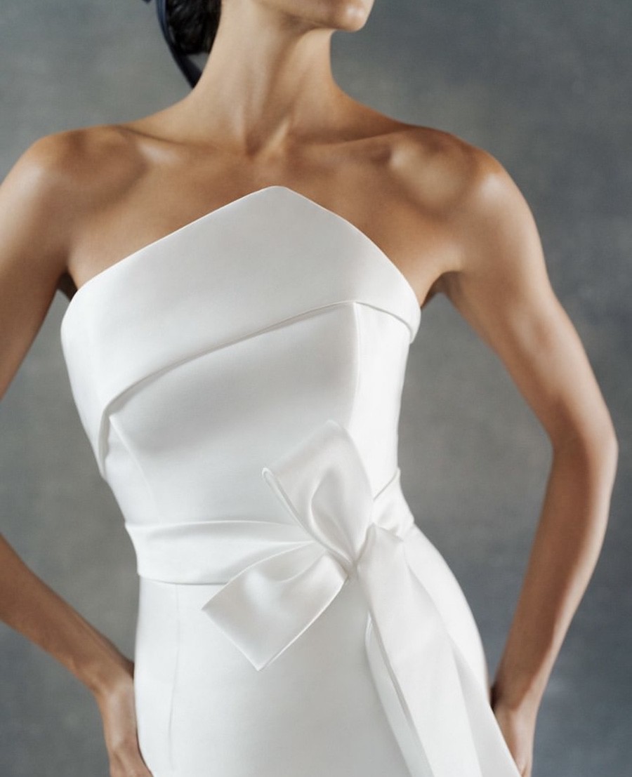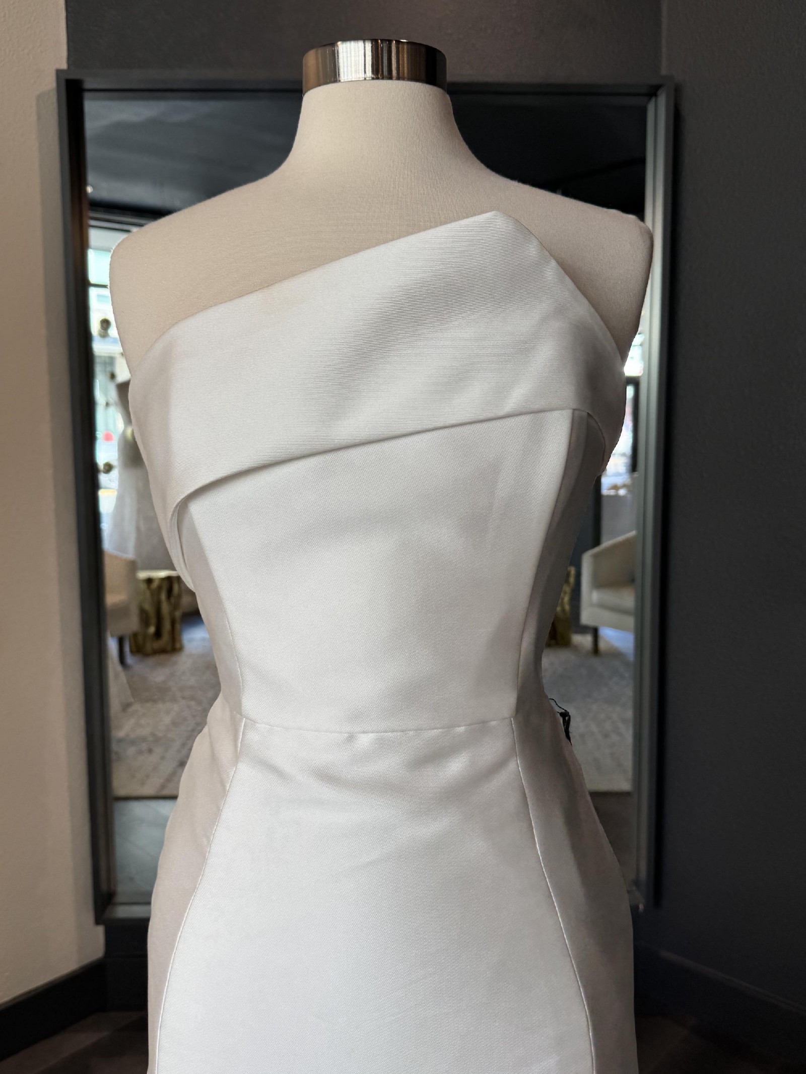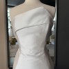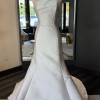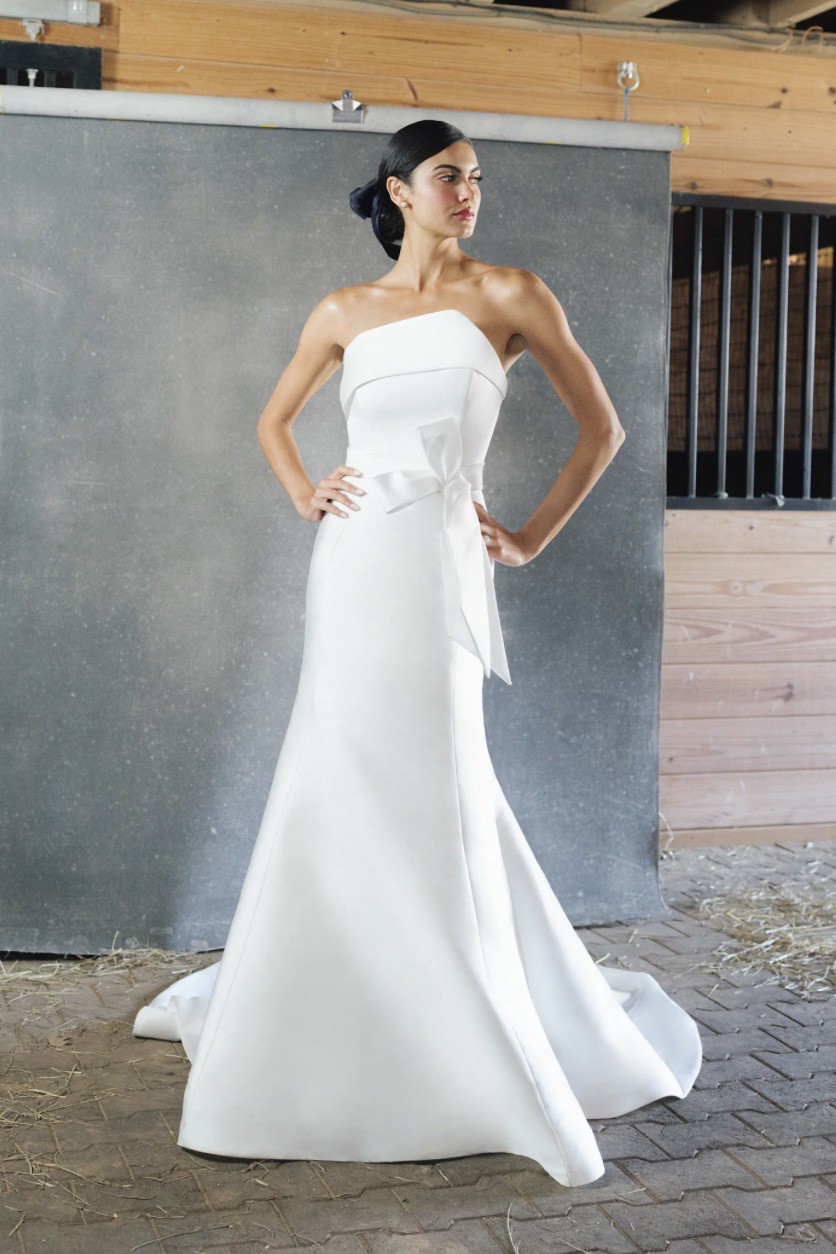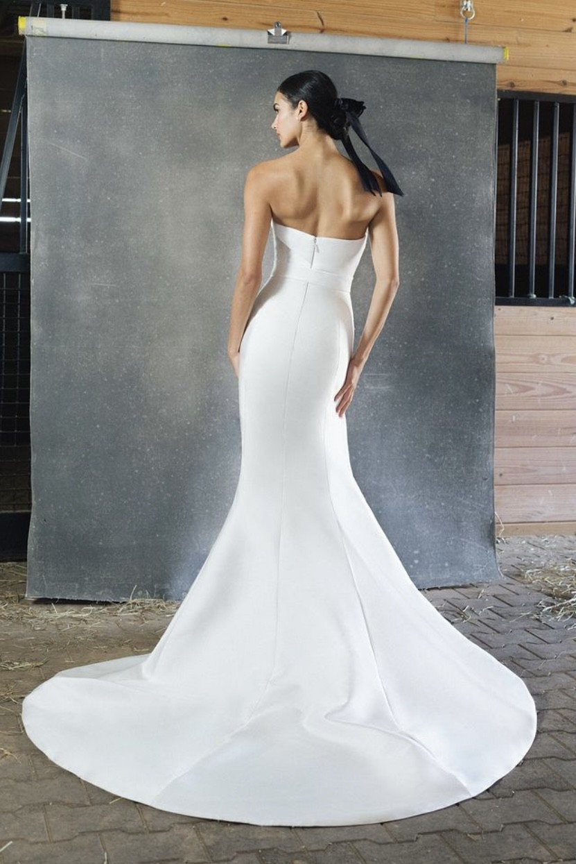 A strapless scuba mikado trumpet gown featuring a cuffed asymmetrical neckline, natural waistline, architectural seaming and a fluted skirt with chapel-length train. While the gown was officially photographed by the designer with an optional/detachable bow belt, this sample is being sold without it.