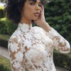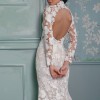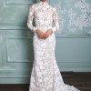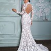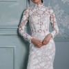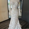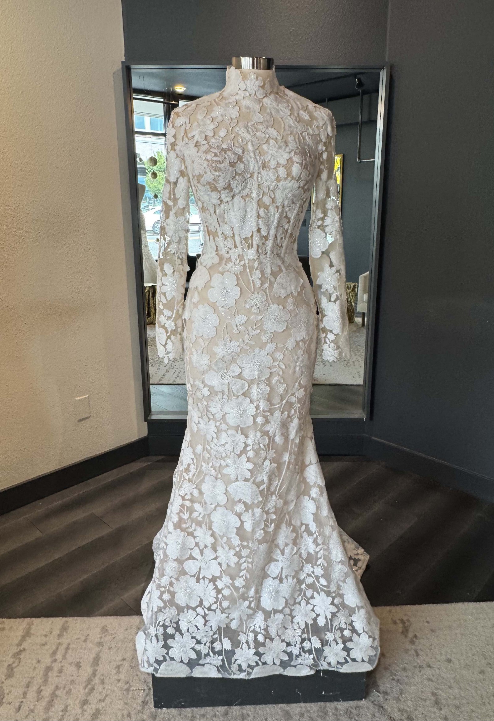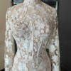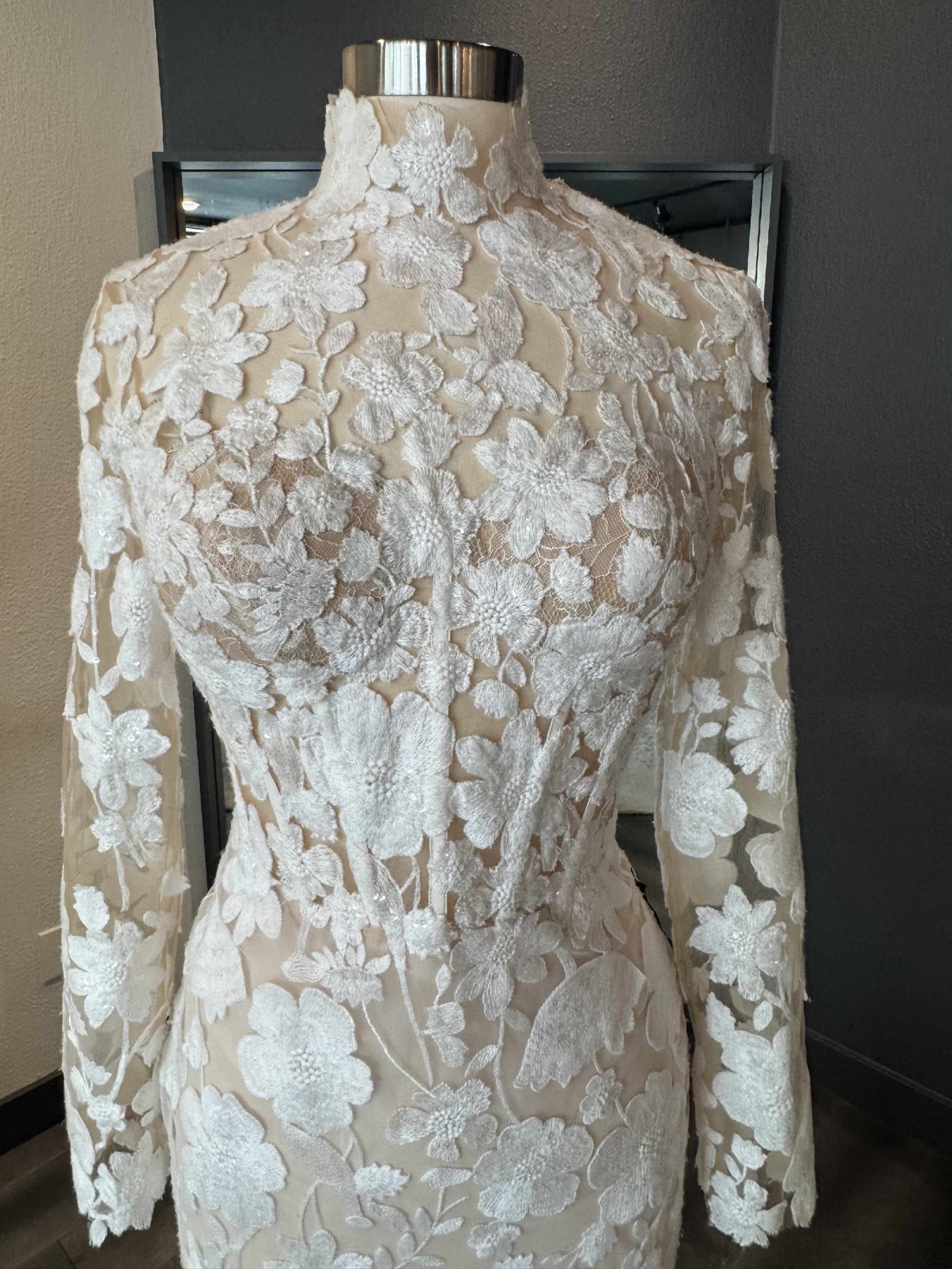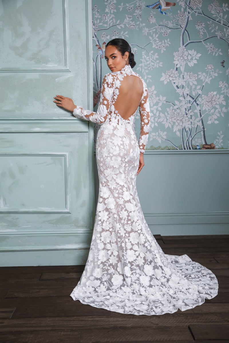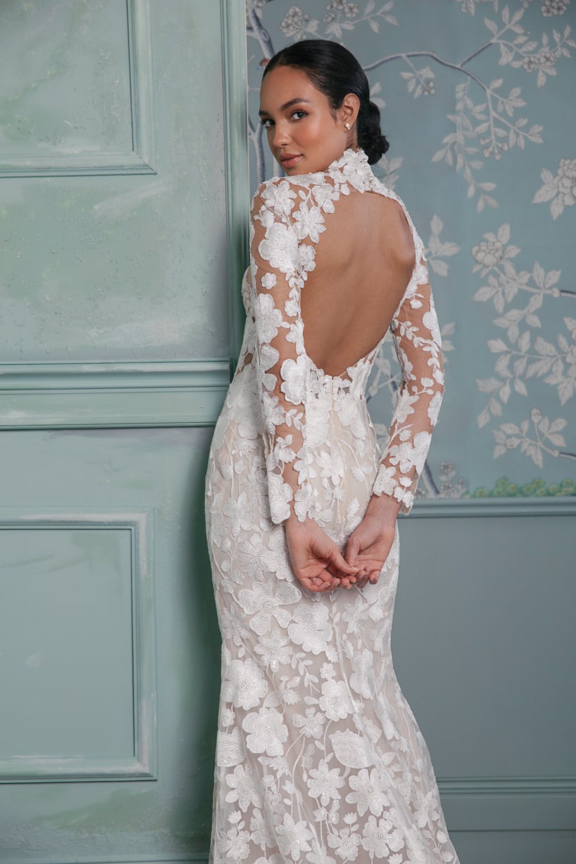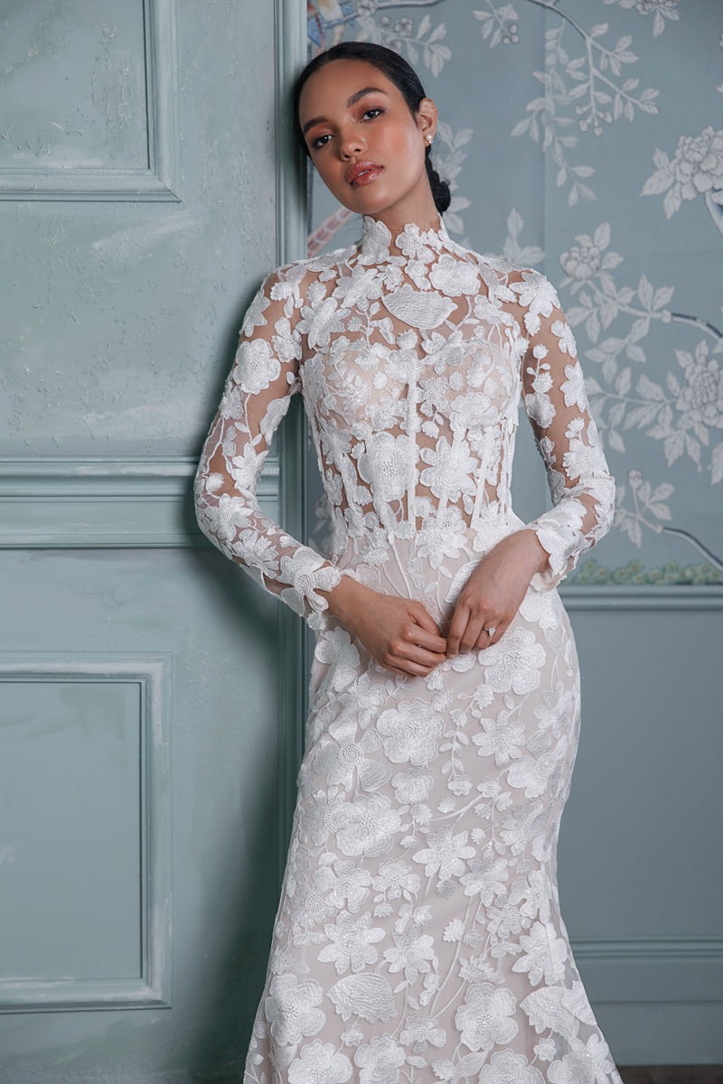 A long-sleeve trumpet gown made of sequined floral embroidery; the gown features an illusion corset bodice with mock-neck and open keyhole back, with fluted skirt and chapel-length train. The gown is sampled in the color exactly as photographed by the designer: silk white embroidery over a nude lining. (The gown has a standard hollow-to-hem of 60".)