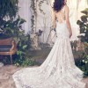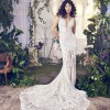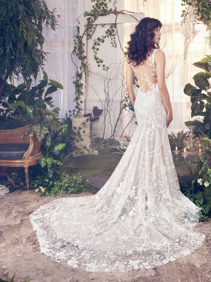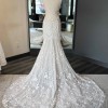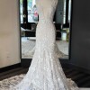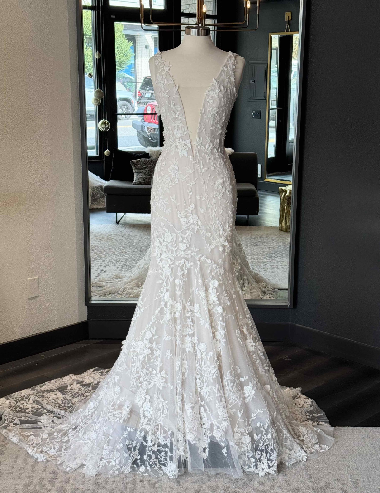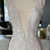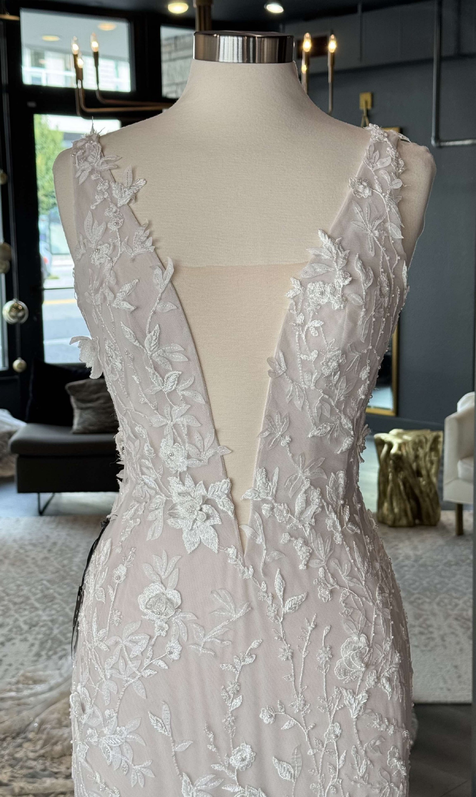 A sleeveless draped trumpet gown made of re-embroidered lace featuring a plunging illusion v-neckline with illusion low back, a fluted skirt and chapel-length train; the gown features delicate beading and 3D floral accents throughout. Gown is sampled in the exact color as seen in the designer's official photo: off white lace/embroidery + cameo pink lining. (Gown has a standard hollow-to-hem of 59.5".)