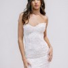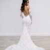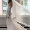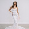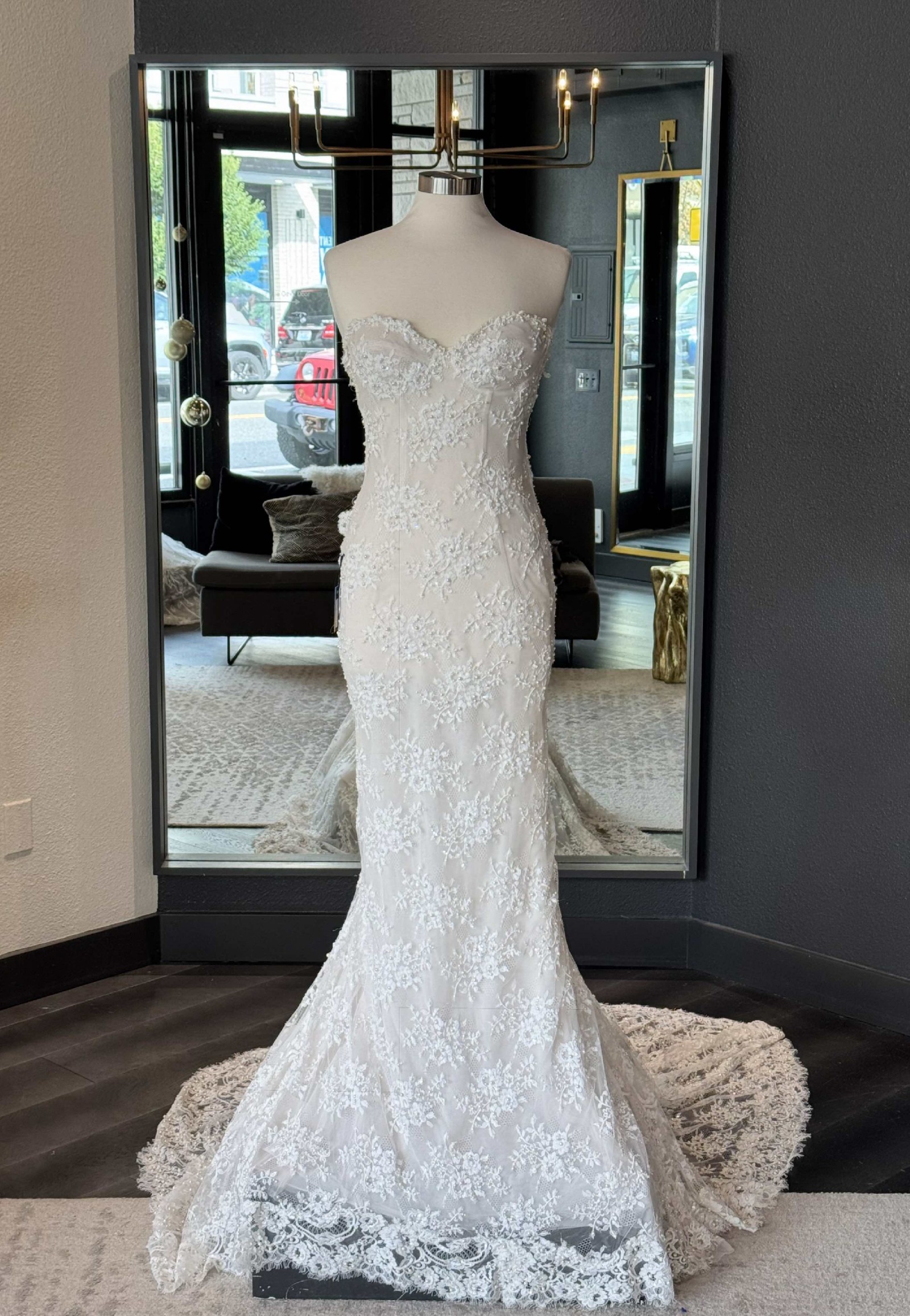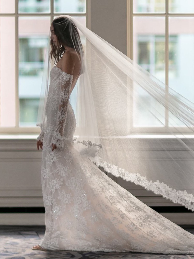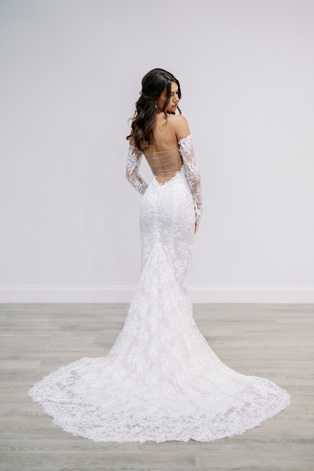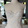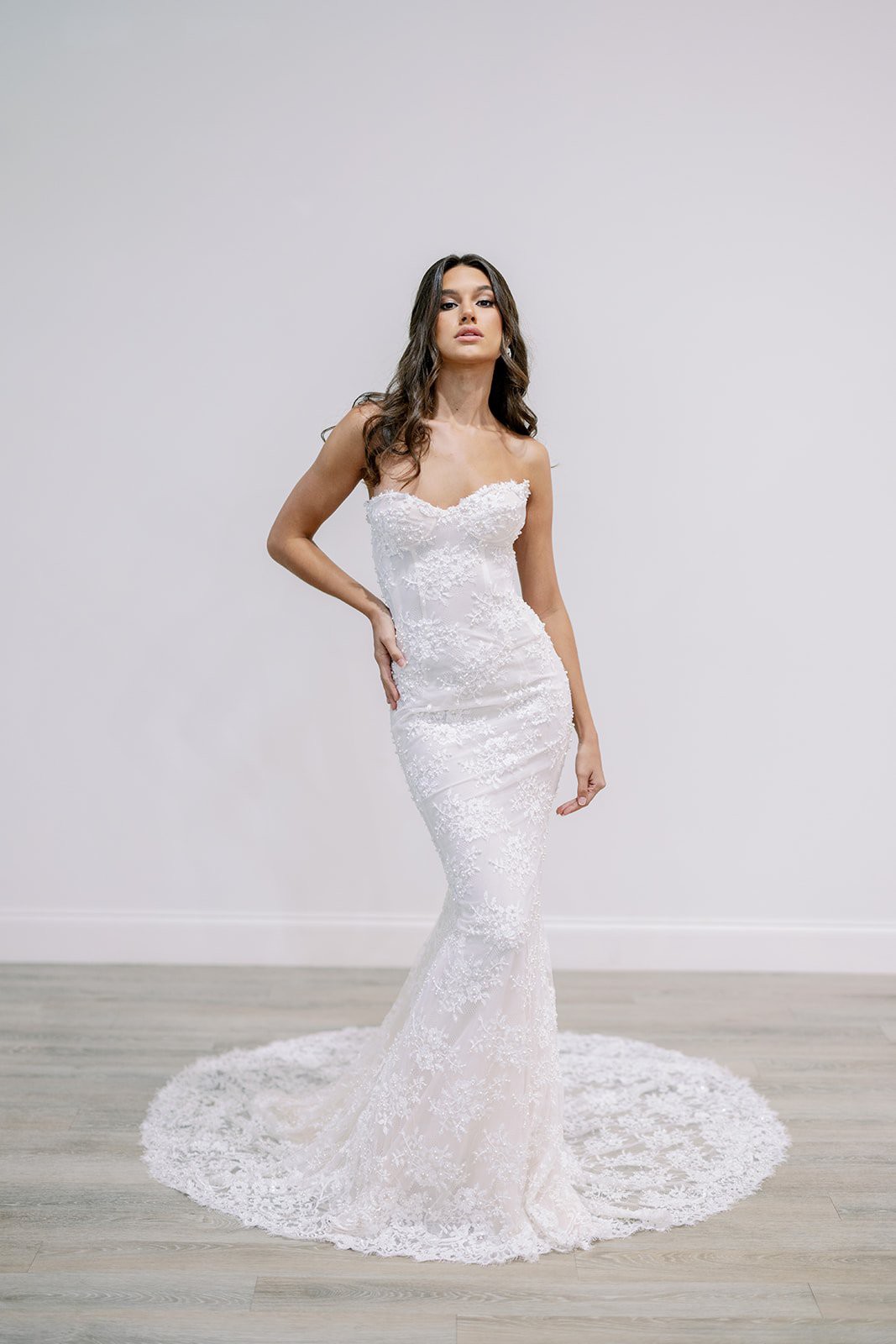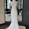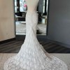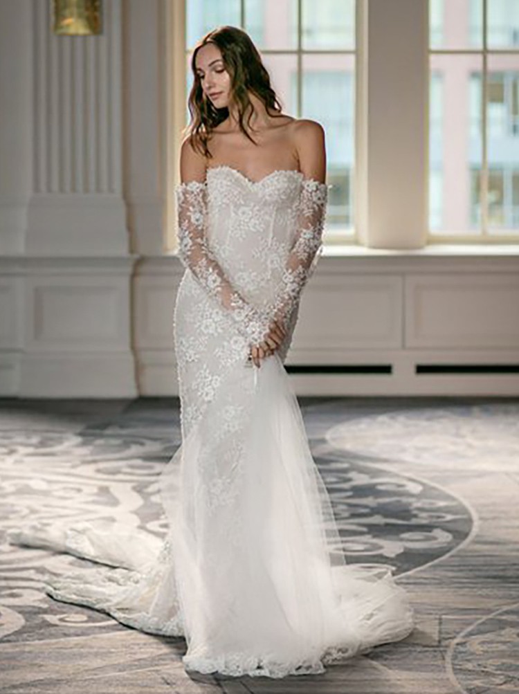 A strapless, draped trumpet gown made of a delicate pearl-beaded lace featuring a modified sweetheart neckline, detachable off-the-shoulder long sleeves, a low illusion v-back, and a fluted skirt with chapel-length train. The dress is sampled in the exact same color as photographed by the designer: blush. However, the dress is really an off-white lace + pale blush pink lining. (Gown has a standard hollow-to-hem of 59.5".)