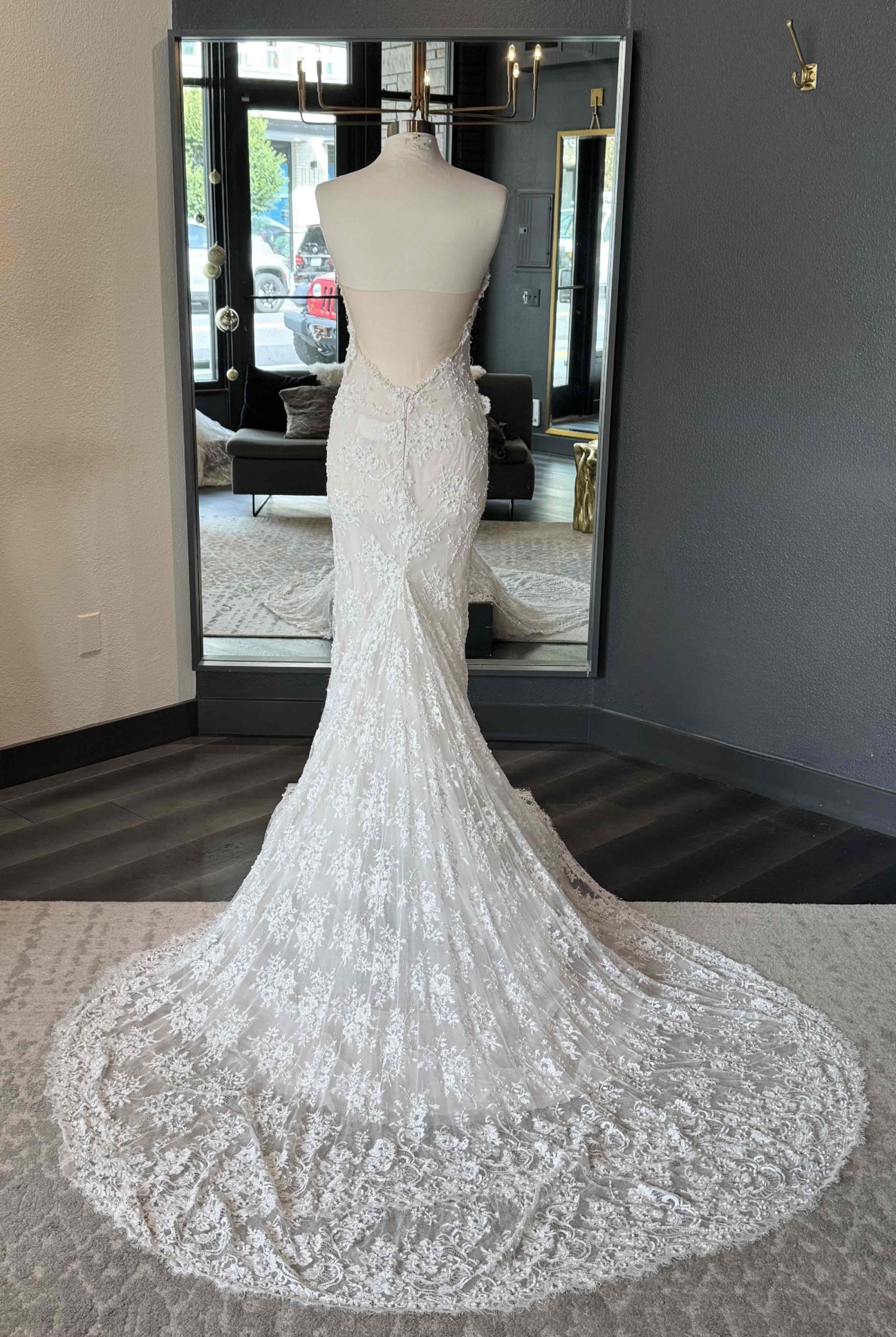 - Gown is a size 12, but as a floor sample frequently tried on, it's important to note that it may have stretched and fit slightly bigger in places