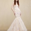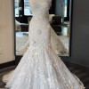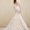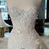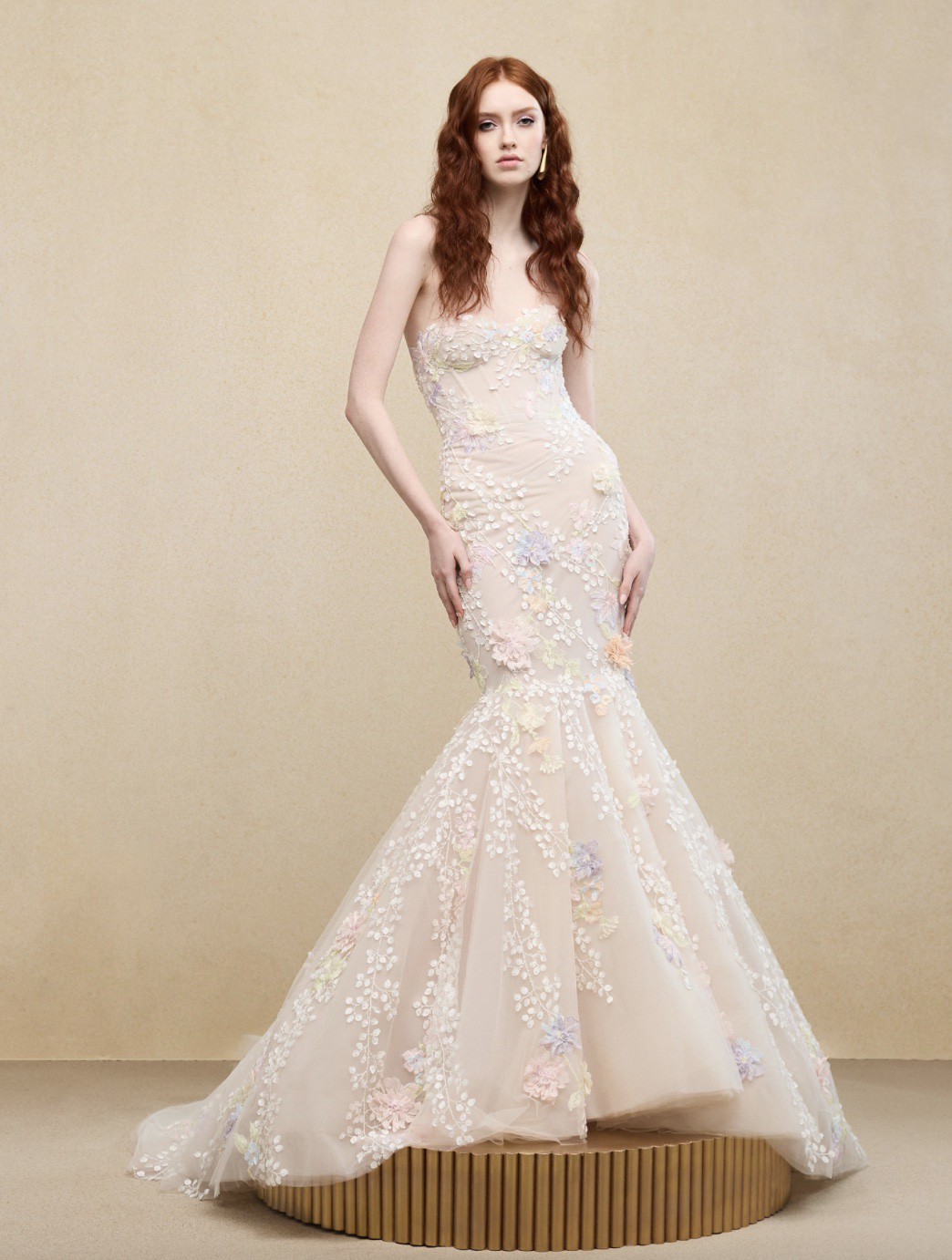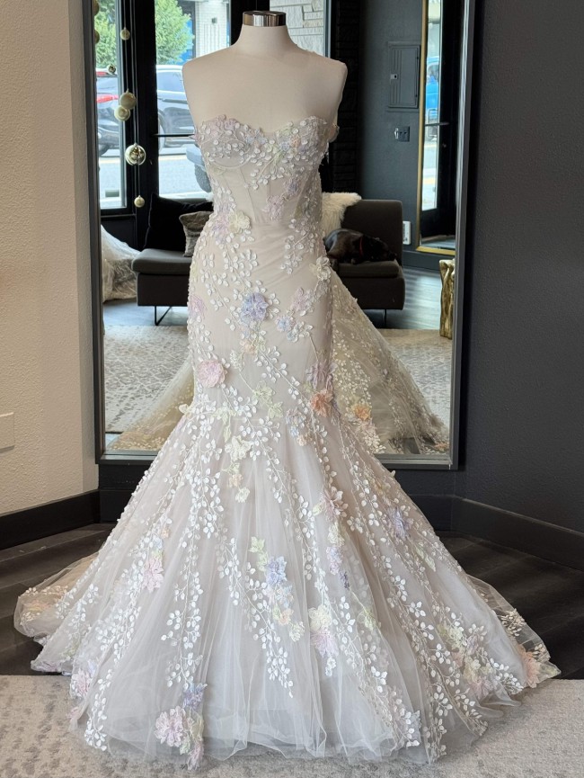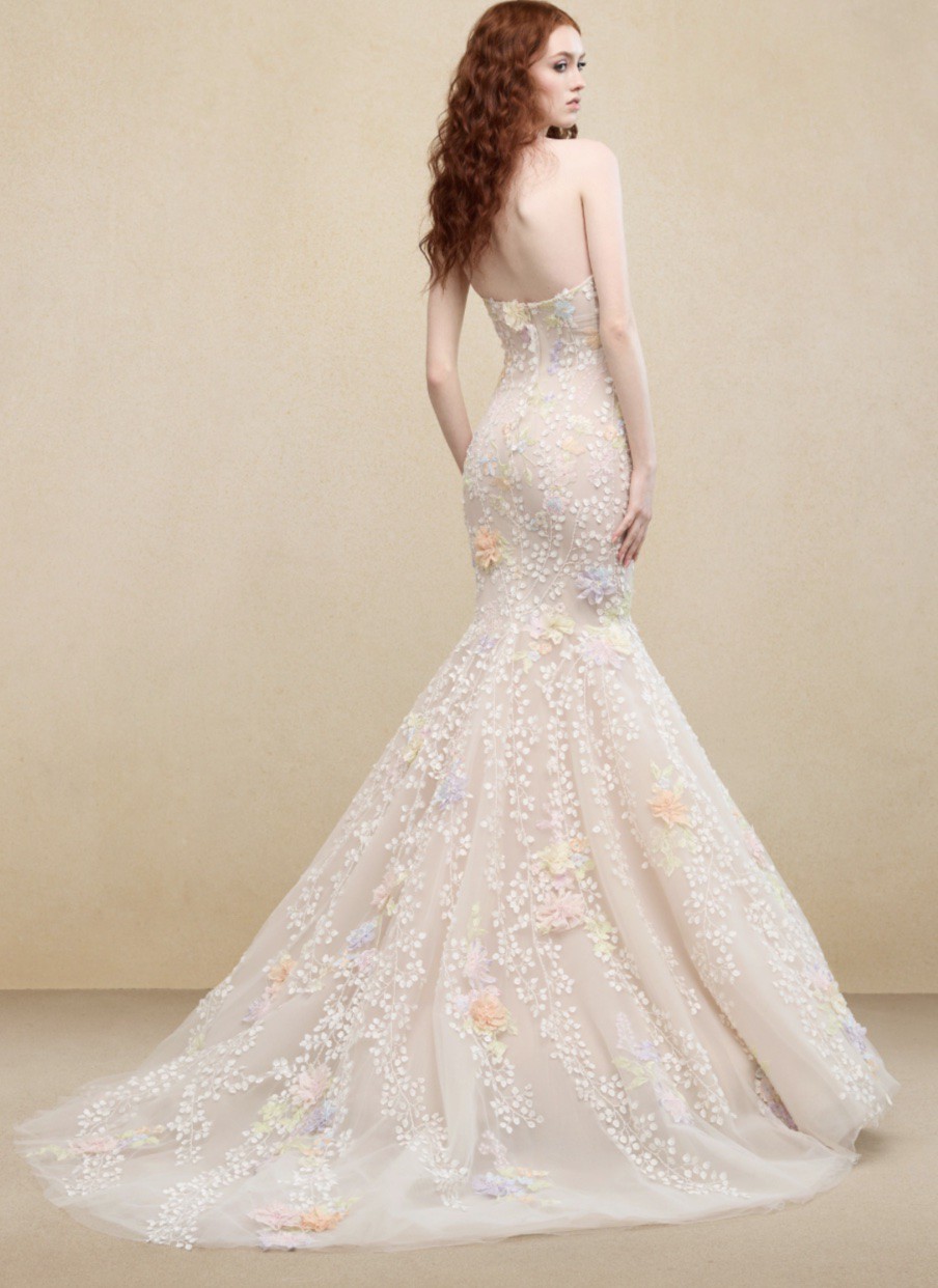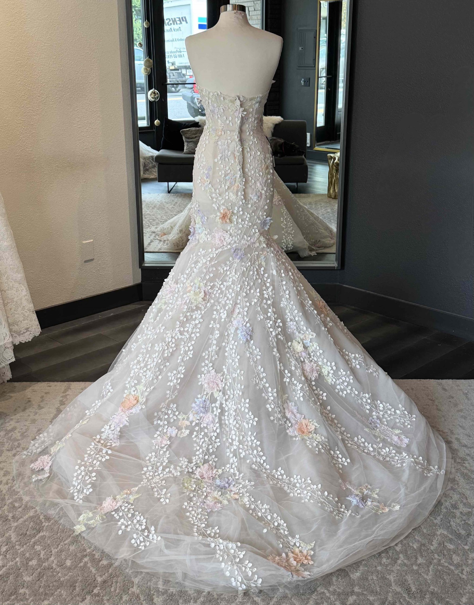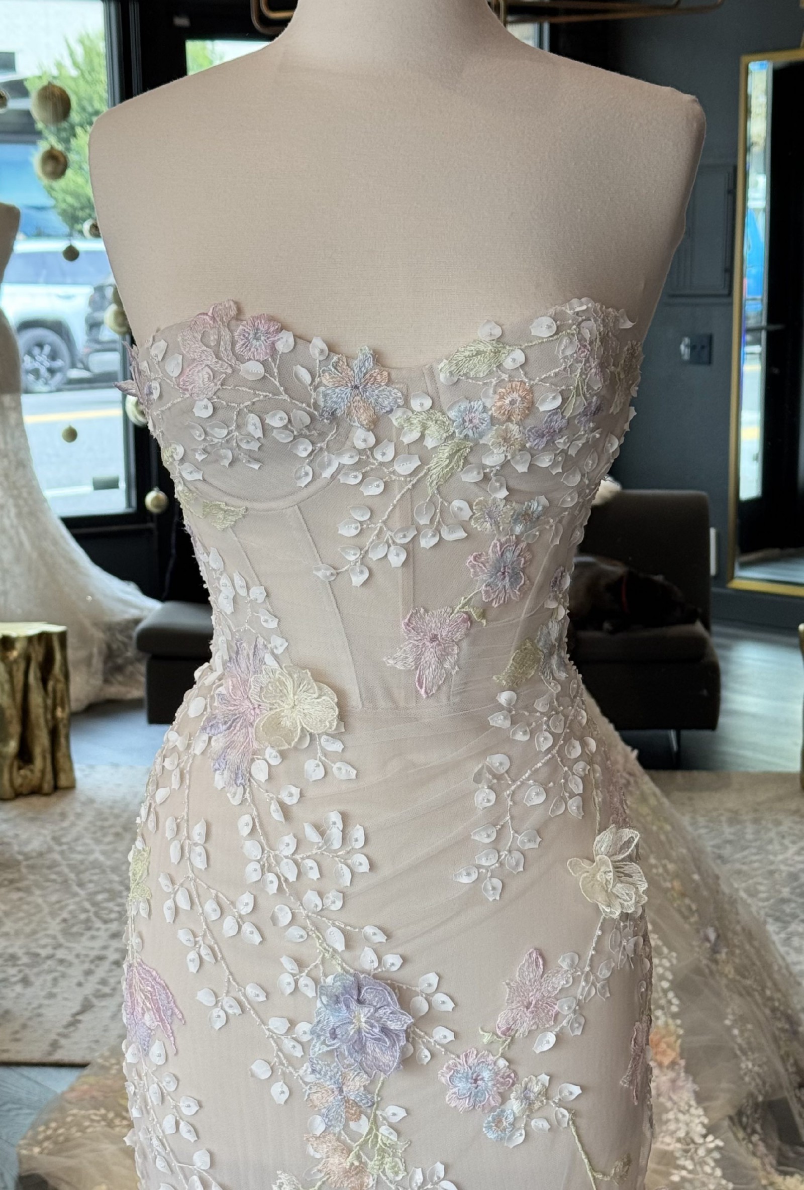 A strapless tulle trumpet gown with a molded corset bodice, modified sweetheart neckline, a natural waist, and a fluted skirt with chapel-length train; the gown features a 3D lace and lace appliqué overlay. The gown is sampled in the exact same color-way as was shown in photos by the designer: pastel sherbet (specifically the multi-color pastel lace) + nude lining. (Gown has a standard hollow-to-hem of 59.5".)