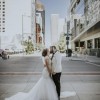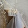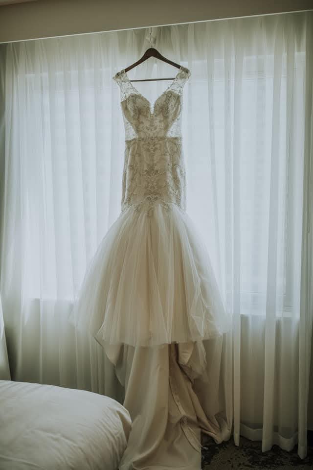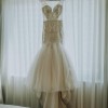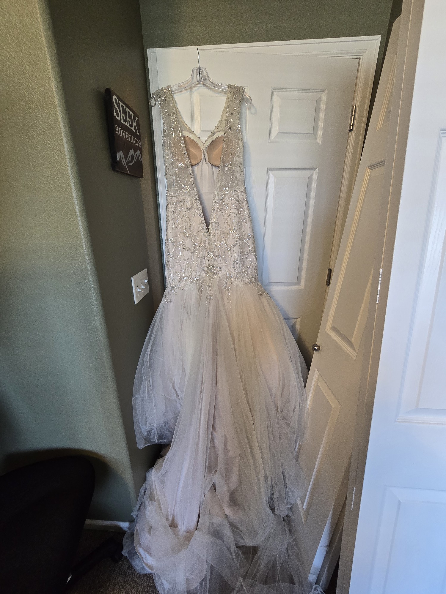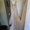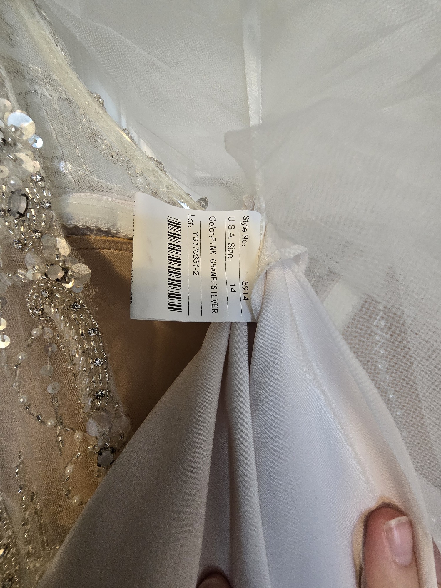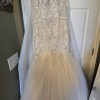 Chantilly lace and tulle skirt fit and flare. Heavily beaded with sequins, pearls, and crystals. Has ivory tulle over pink champagne skirt, so very faintly pink. Needs minor repairs with beading. Otherwise in great shape. Has many bustle points and was professionally altered. see photos for details.