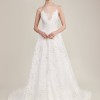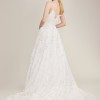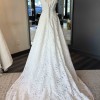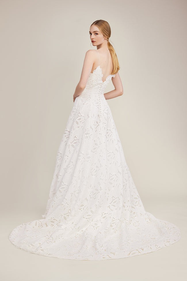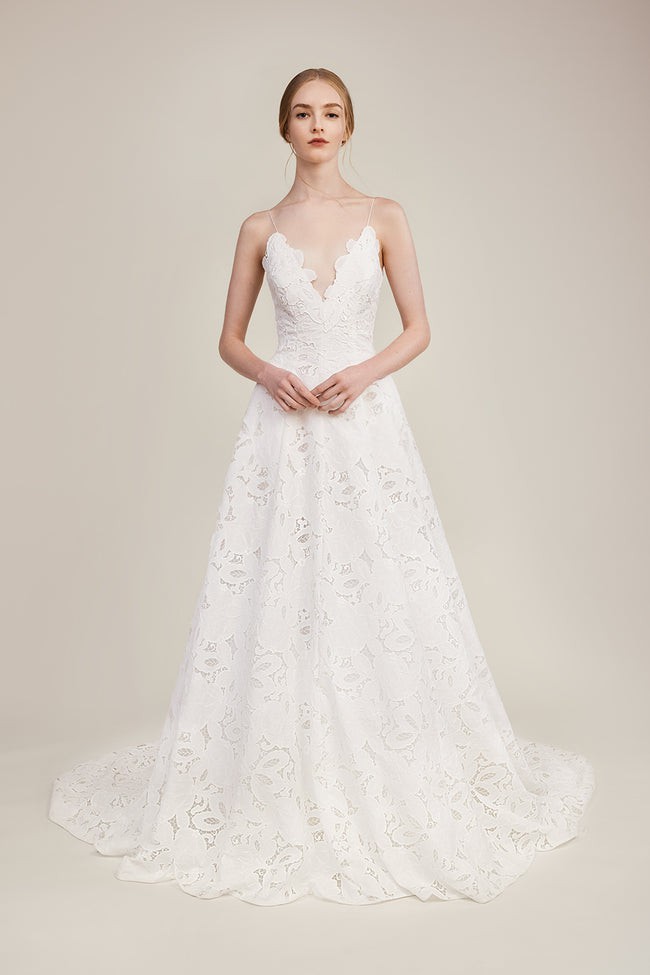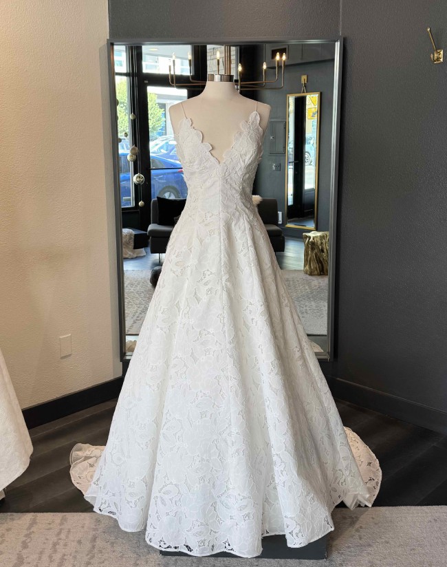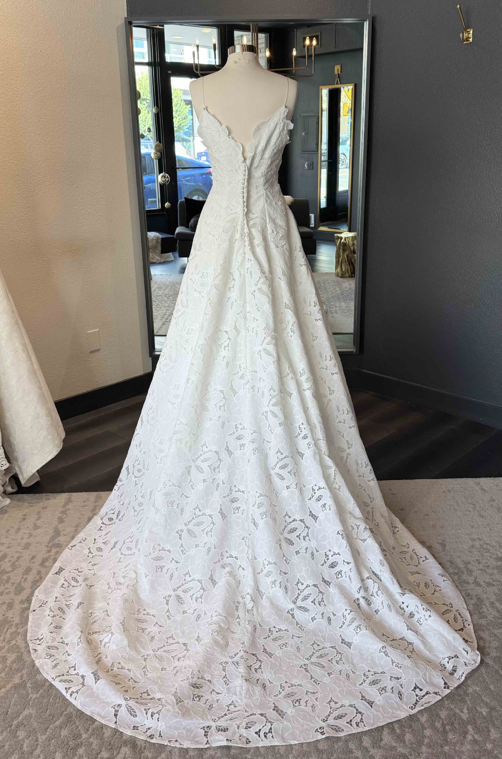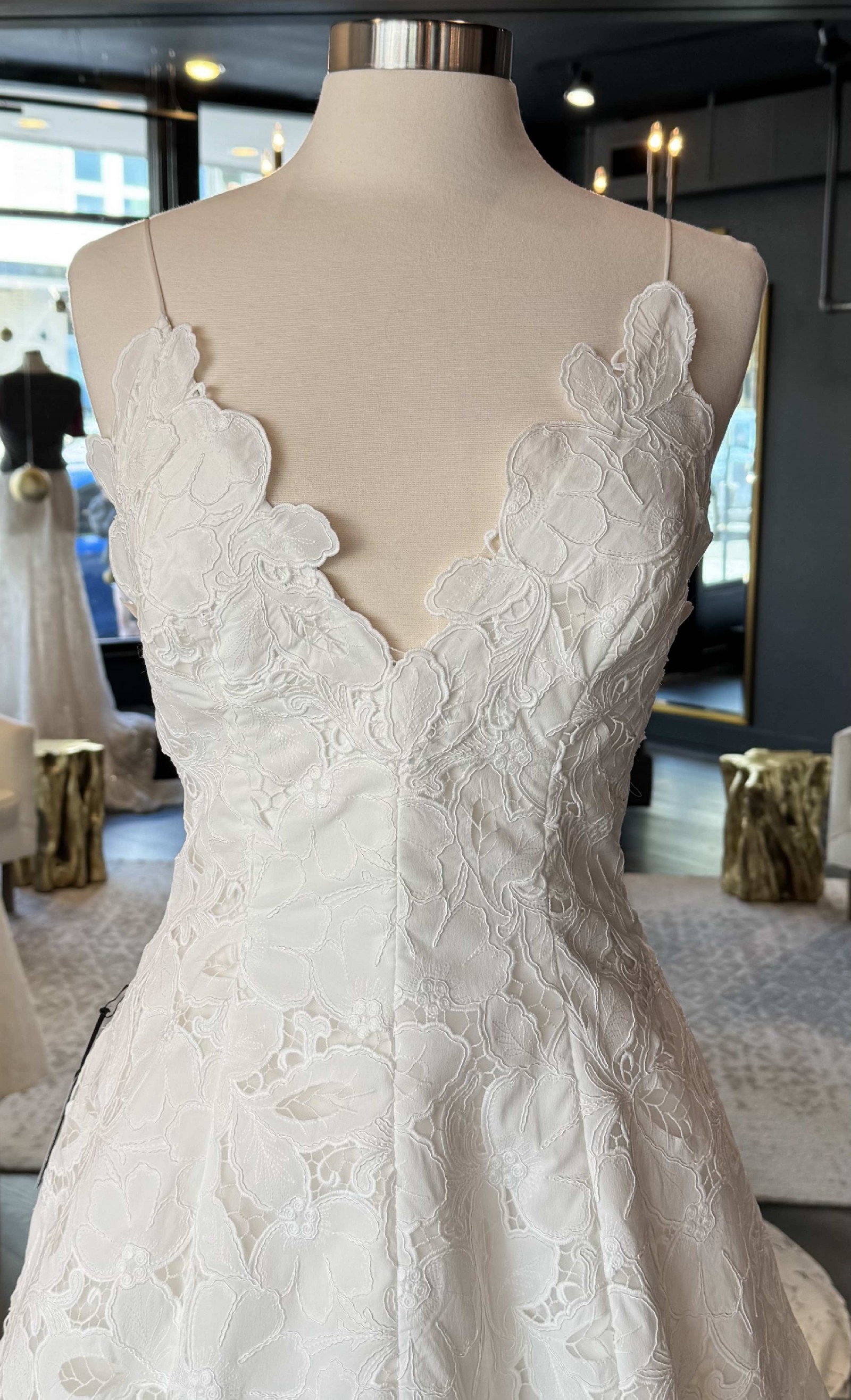 A sleeveless corded lace embroidered gown featuring a deep, scalloped v-neckline with delicate spaghetti straps, a v back, and a modified a-line skirt with chapel-length train. The gown also features hidden pockets!