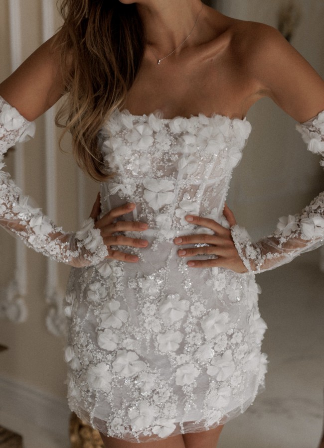 Brand new, bought directly from Rosie Etienne. This dress has never been worn except for try-ons, and it's in perfect condition. I bought two sizes of the Isabelle (a US 4 and a US 2). They fit almost identically, and I ended up wearing the US 2 at my wedding. Everyone loved the dress! It was a show stopper.