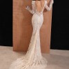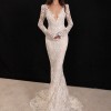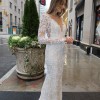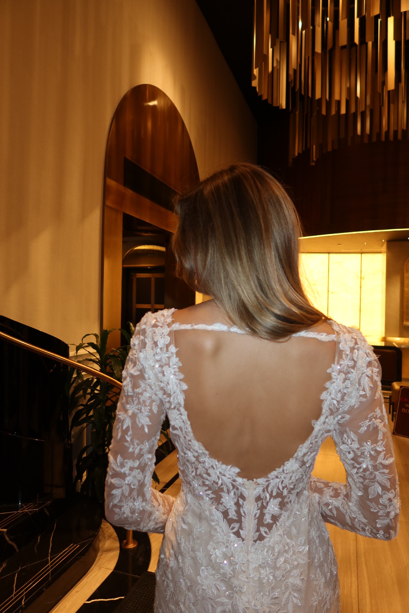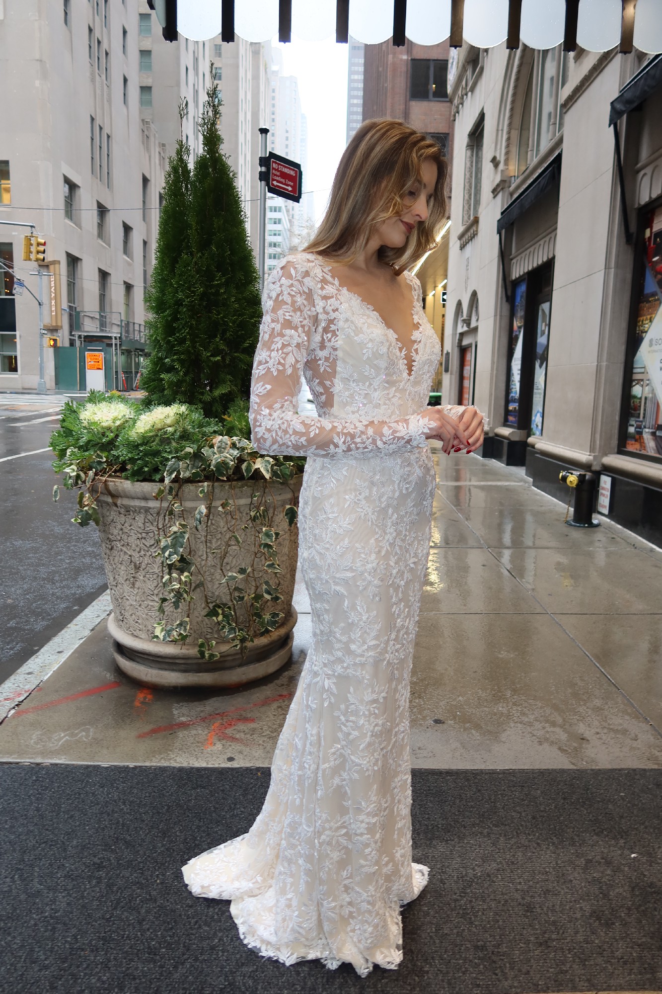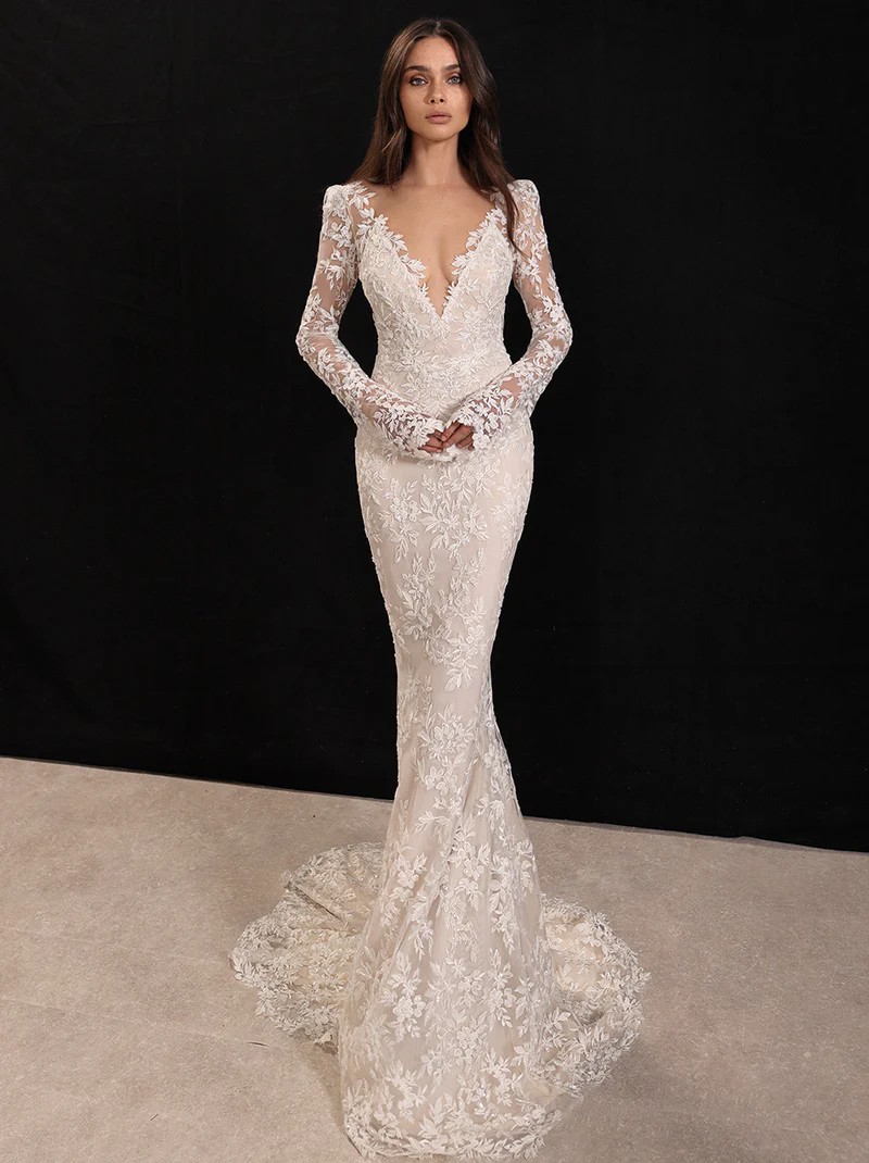 Bay is an elegant fitted, fully embroidered lace gown featuring a discrete low plunging neckline, sheer tailored long sleeves, and a sheer low back.