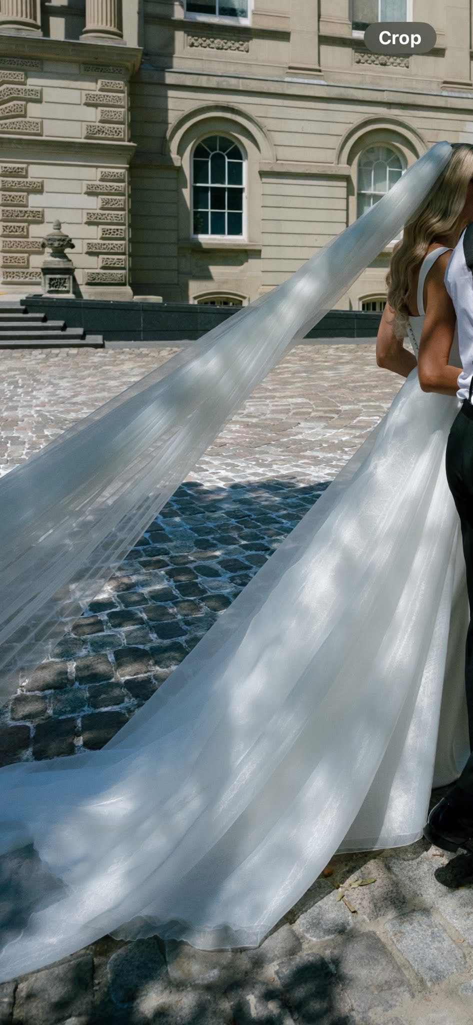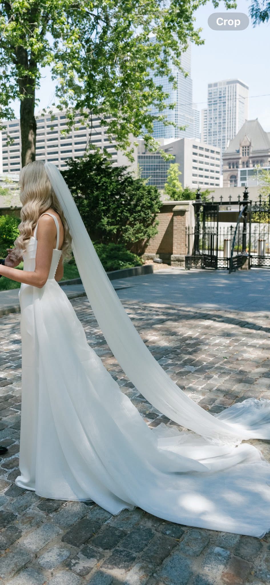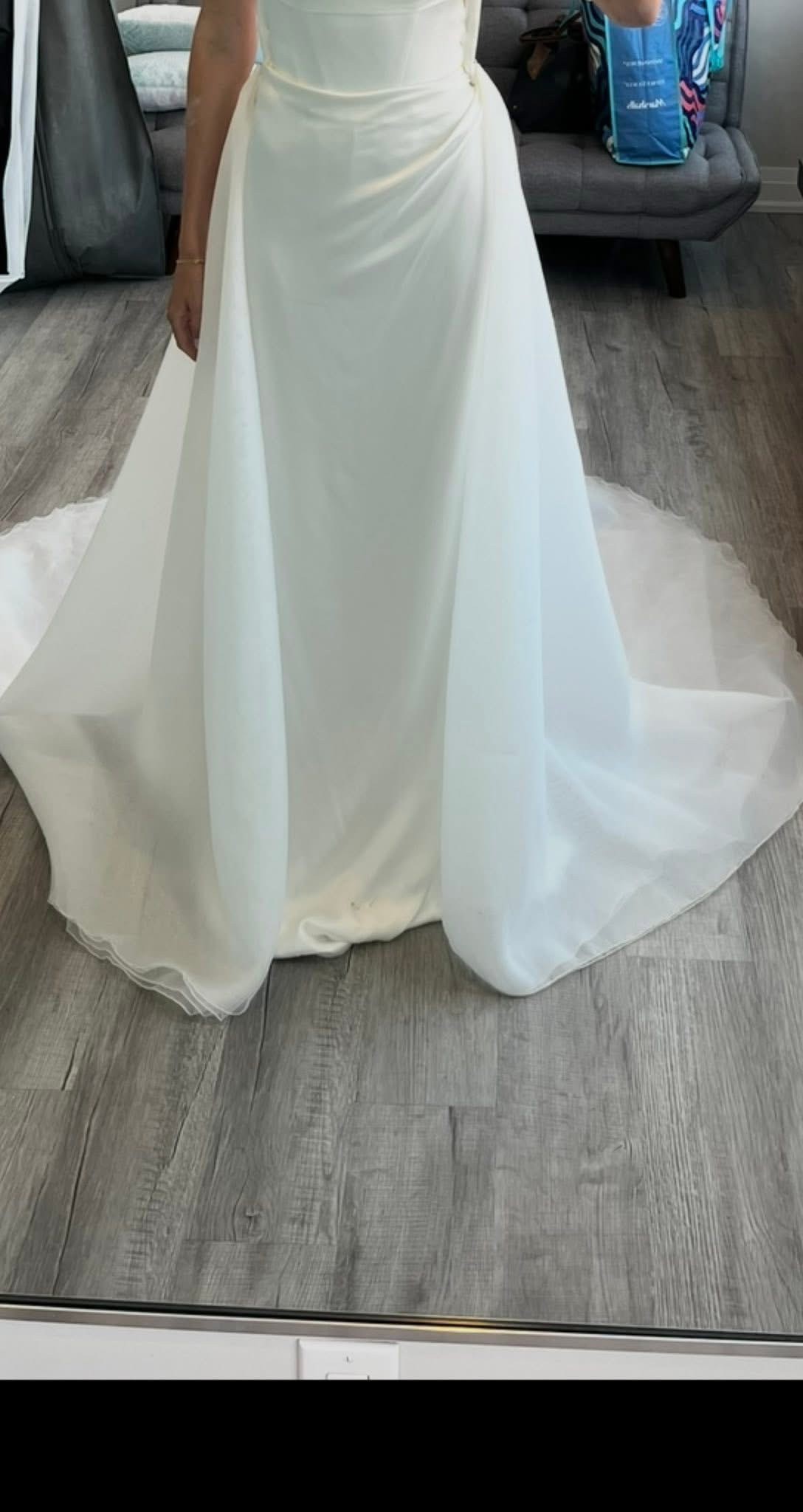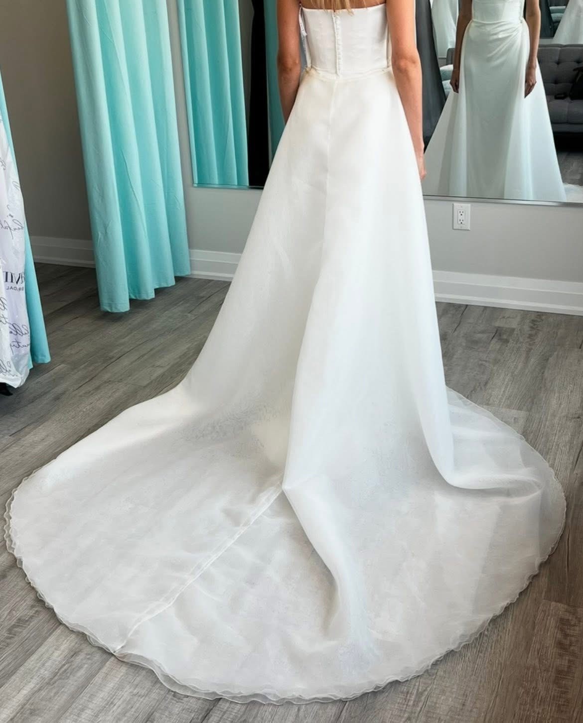 Detachable wedding dress over skirt with finished trim and hooks & clasps to attach to wedding dress. 100% organza in colour ivory. The waist can be adjusted smaller or bigger as needed. Length is long. In perfect condition and only worn for a few hours. Looks brand new and been cleaned.