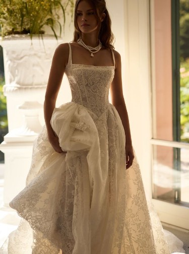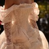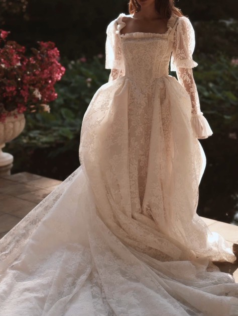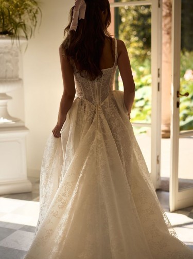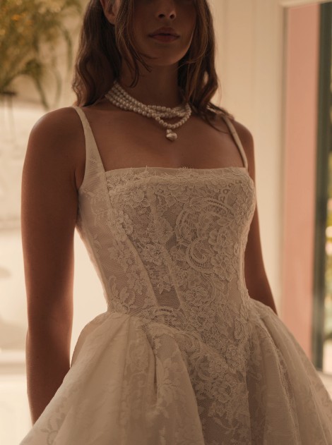 The square neckline sets the stage for an unforgettable silhouette, flattering and timeless, making it perfect for any bride eager to make a statement. The delicate embroidery and whimsical ruffles give the gown a unique charm that brought my vision to life. I still remember how the overskirt flowed gracefully with every step I took, capturing the attention of everyone in the room.