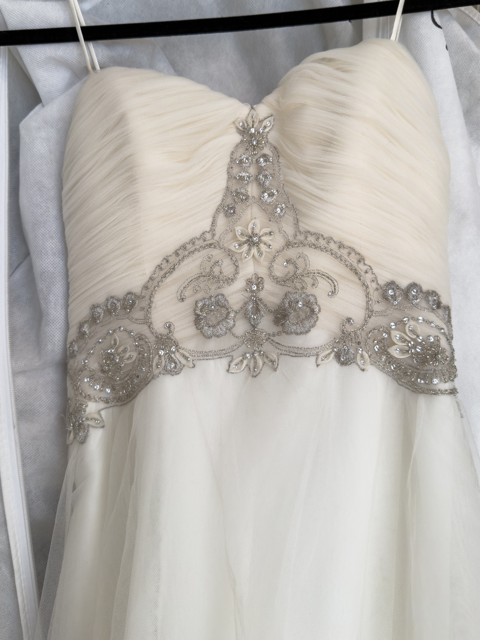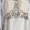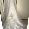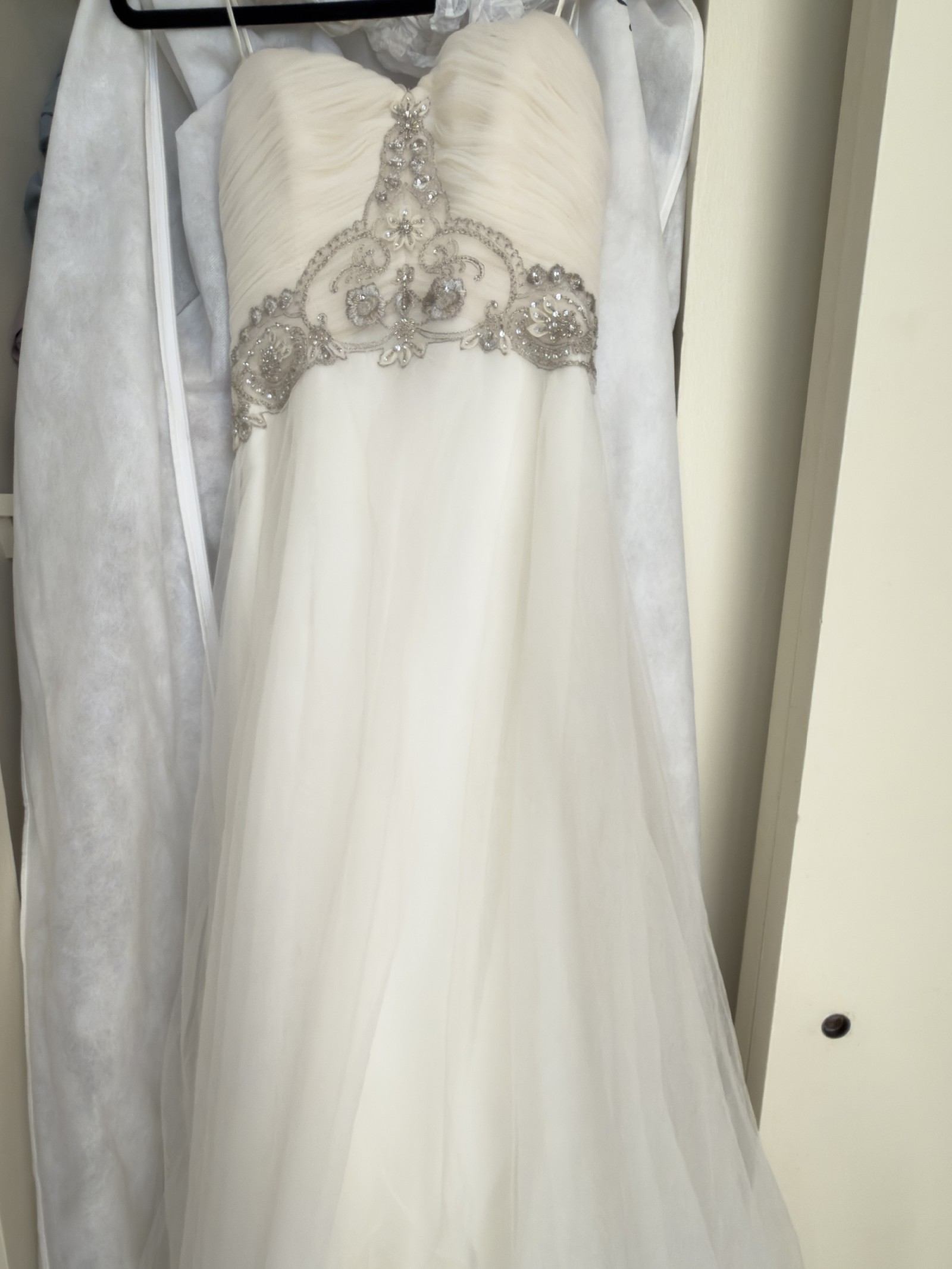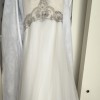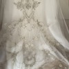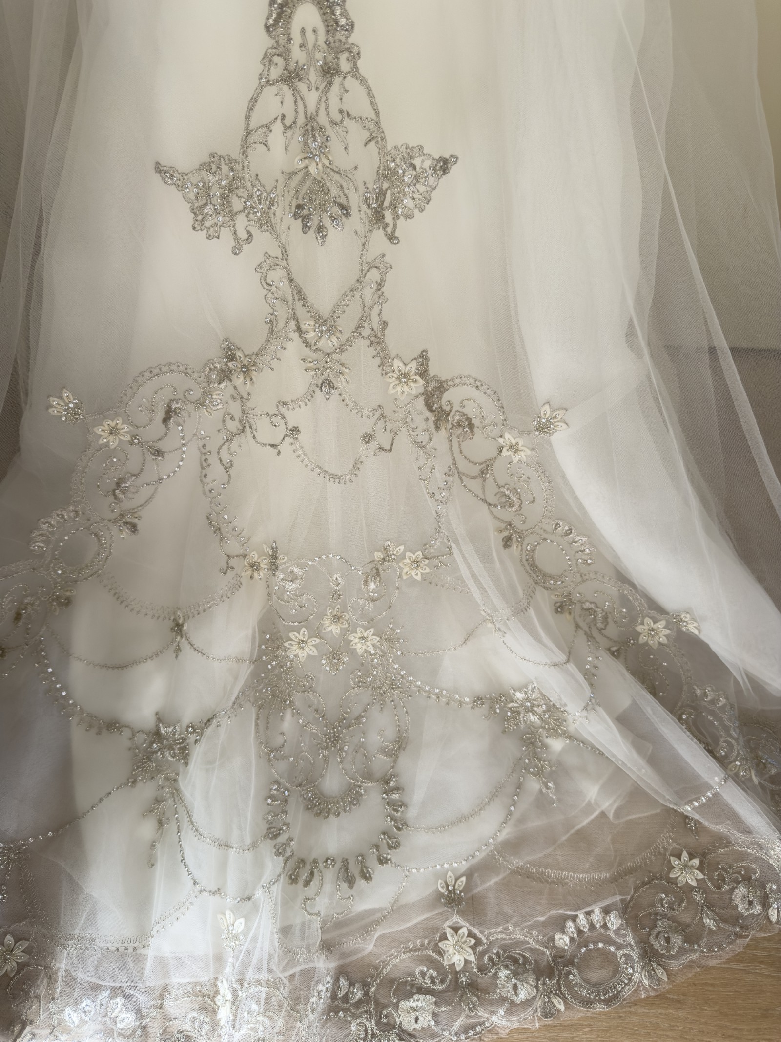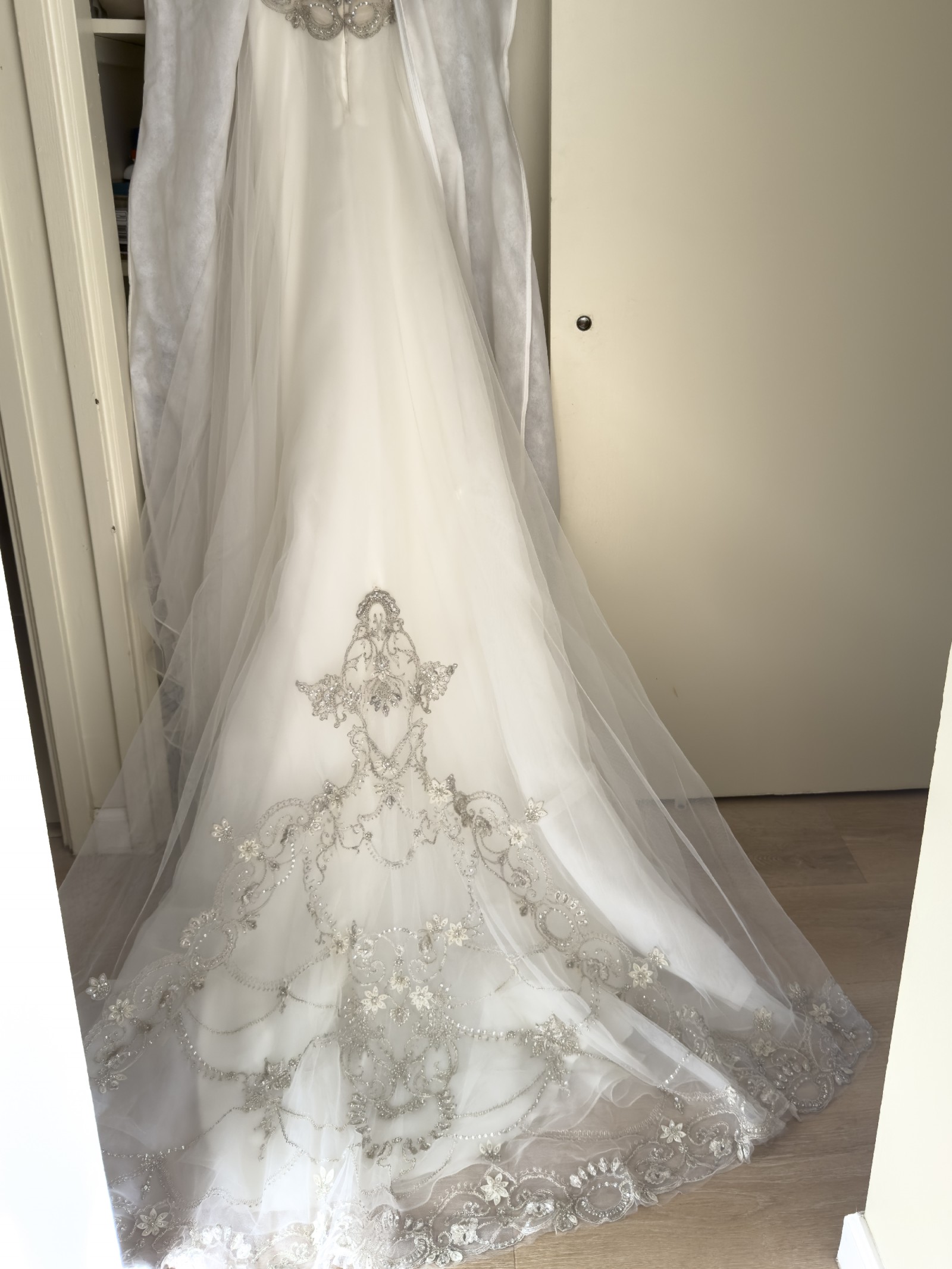 Beautiful dress that was originally very big ballgown and I had a lot of the tulle removed so it would lay flatter in the front and would now be considered Has a 6+ foot train that is to beautiful but gussets easily in two spots to form an equally nice back with how the design lays. Happy to send a video or more info with detailed shots of the intricate bead and design work! So much hand done detail put into this dress and it deserves another home! It was originally a size 10 and last one in the store so I had it made into about a size zero. comes with little straps to hang that you can just tuck in.