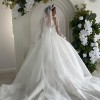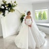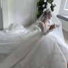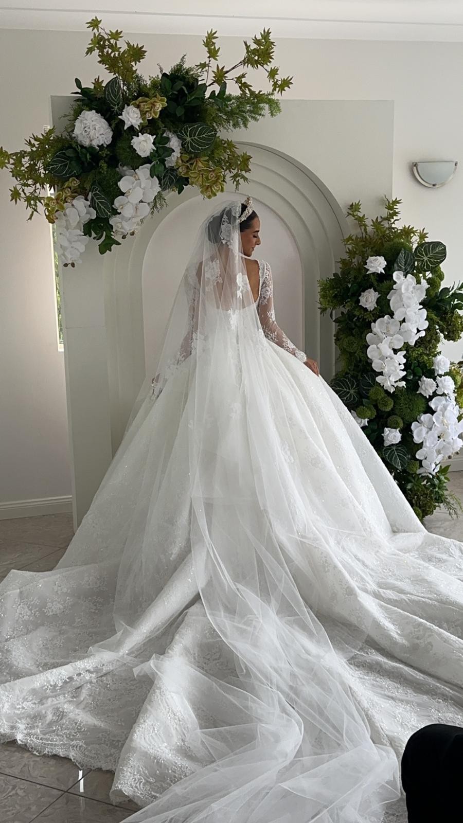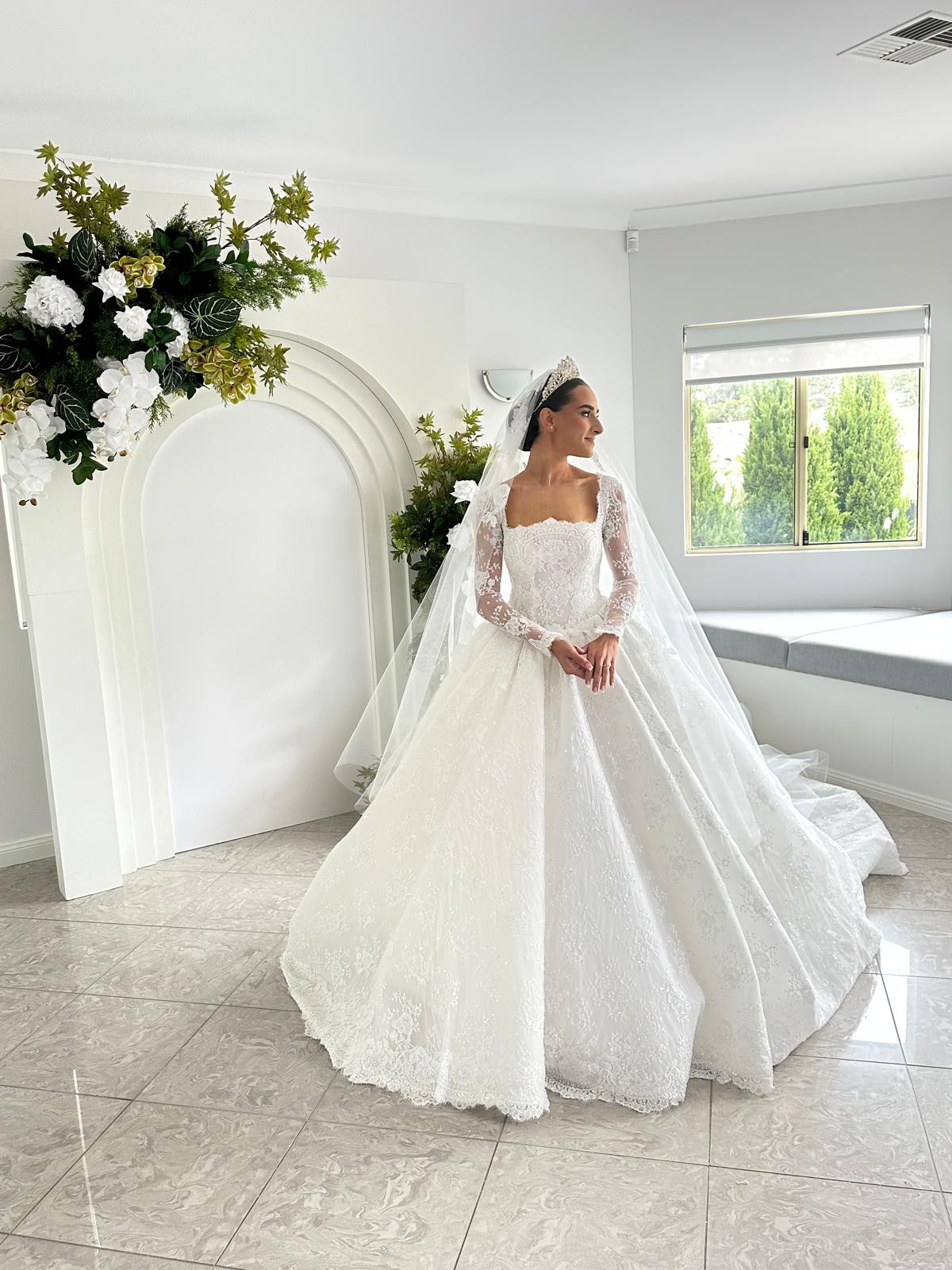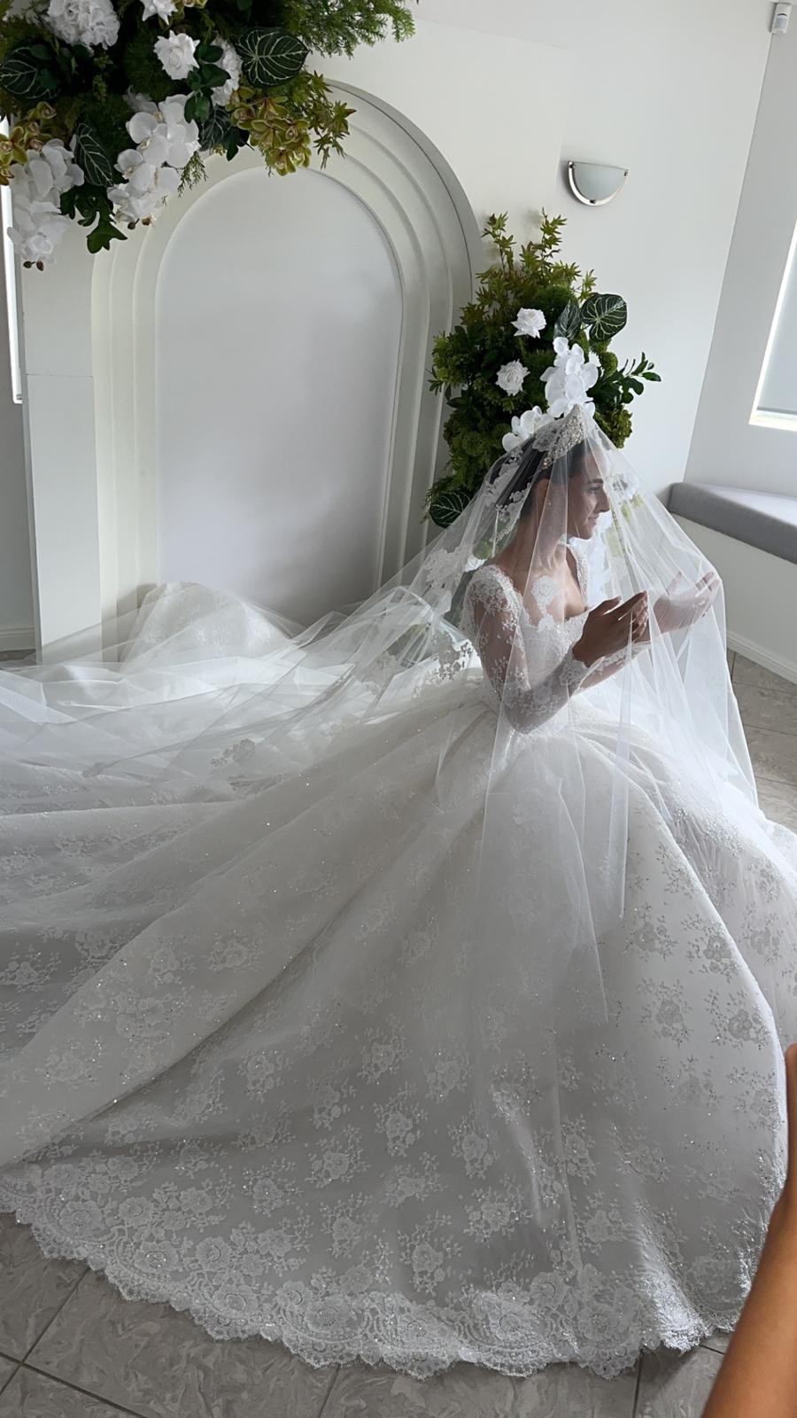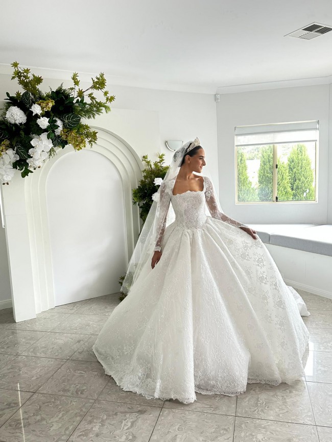 This wedding dress is an elegant, full-skirted ball gown featuring intricate timeless French lace detailing throughout. It has long sheer lace sleeves and a structured bodice with a square neckline, creating a timeless and regal look. The voluminous skirt flows beautifully with delicate embroidery and a scalloped lace hem. The bride completes the ensemble with a long lace-edged veil and a sparkling tiara, enhancing the dress’s classic fairytale style.