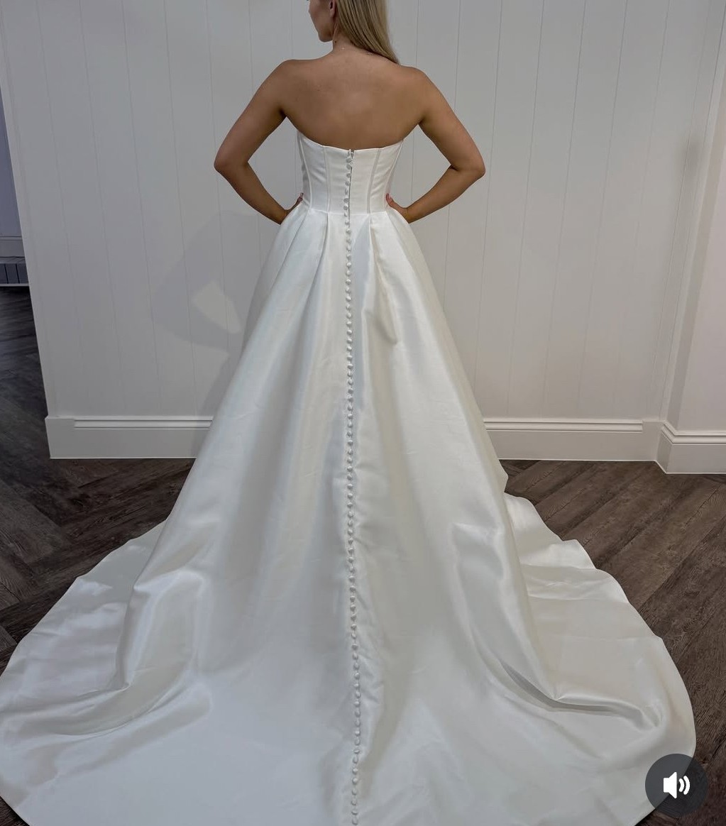 Has had internal straps added to offer two different looks. Internal arm strap and bustle. High leg split.