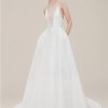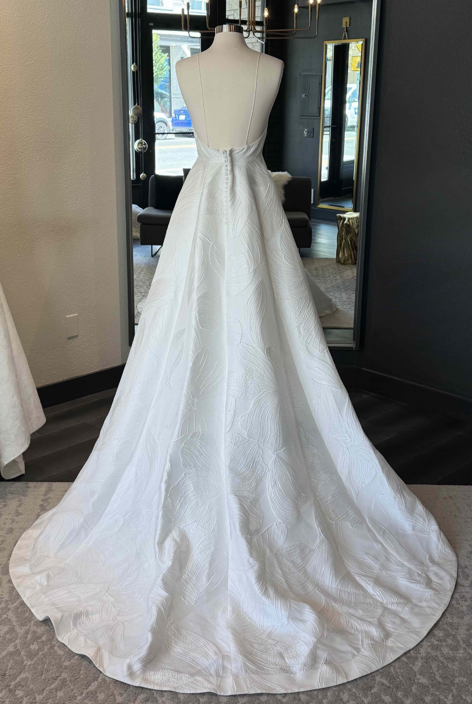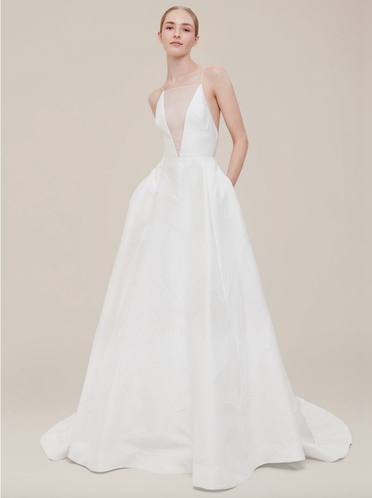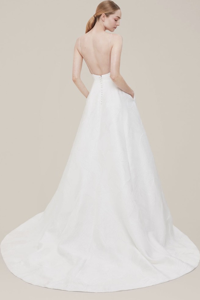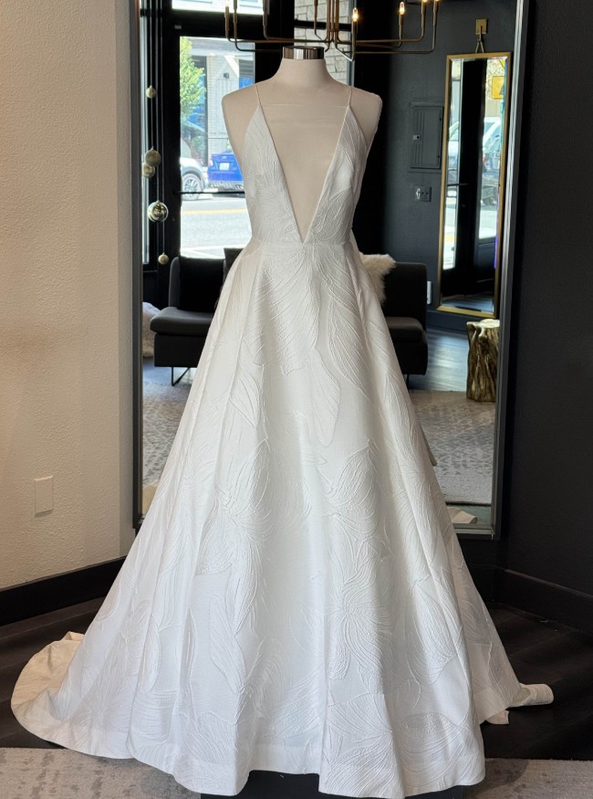 An orchid brocade a-line gown with a plunging illusion v-neckline, delicate spaghetti straps and open back; the gown has a natural waistline and soft flowing skirt with chapel-length train. The fabric features a subtle, tonal metallic thread running through it, for a slight sheen/shimmer as the dress moves.