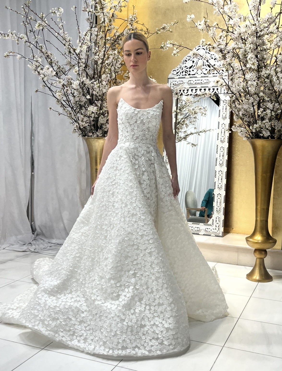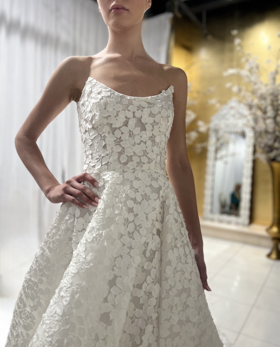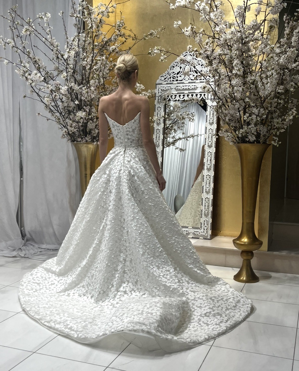 A strapless 3D floral embroidered gown featuring a scoop neckline, scoop back, a natural waistline, and grand a-line skirt with a cathedral-length train. The gown is sampled in the same colorway the designer presented and photographed it in: cream tulle and 3D floral embroidery + nude lining. (*Please note it is very light nude color.)