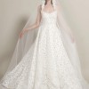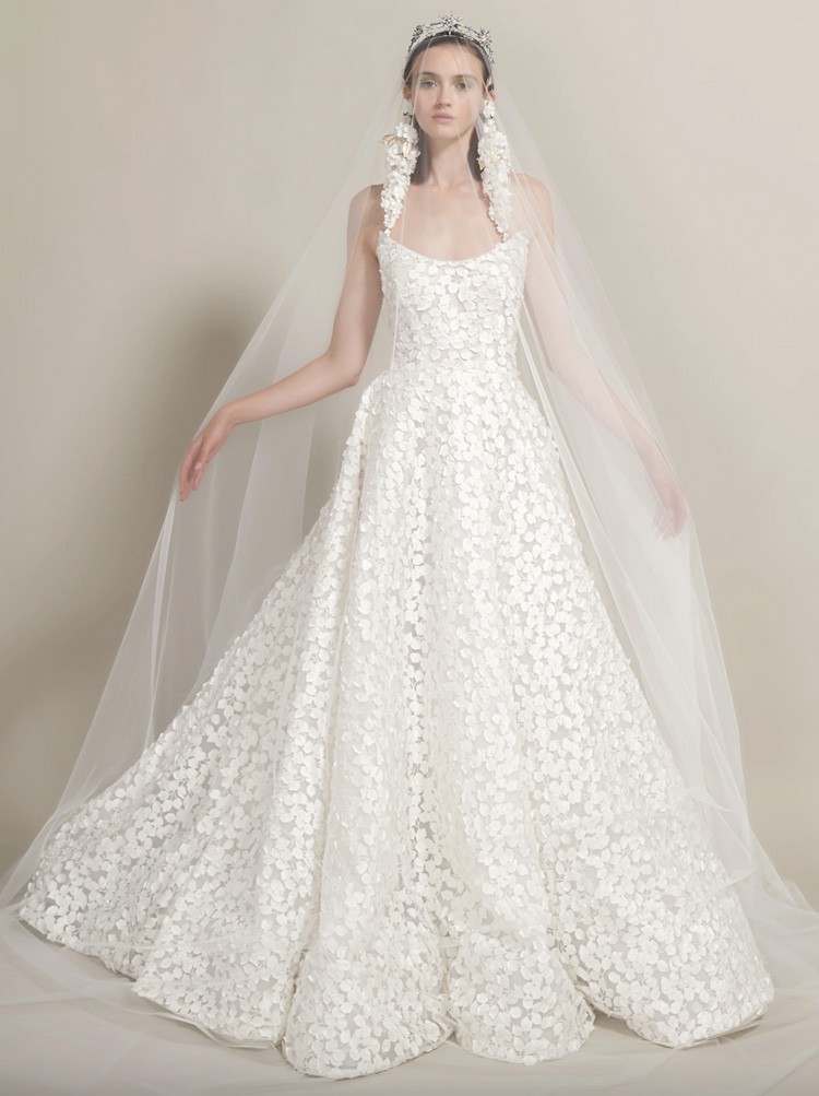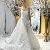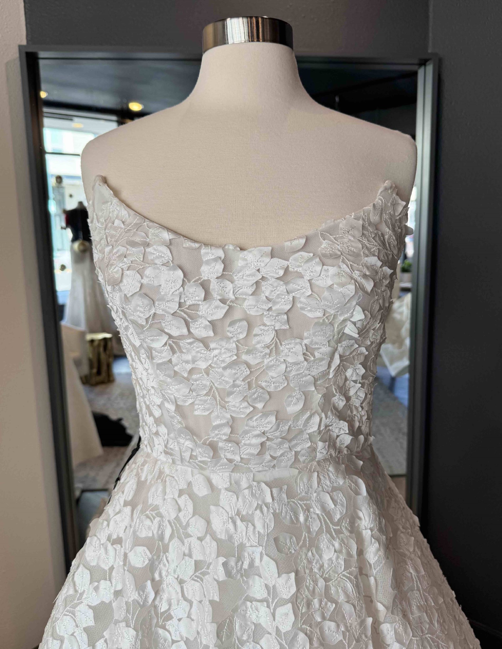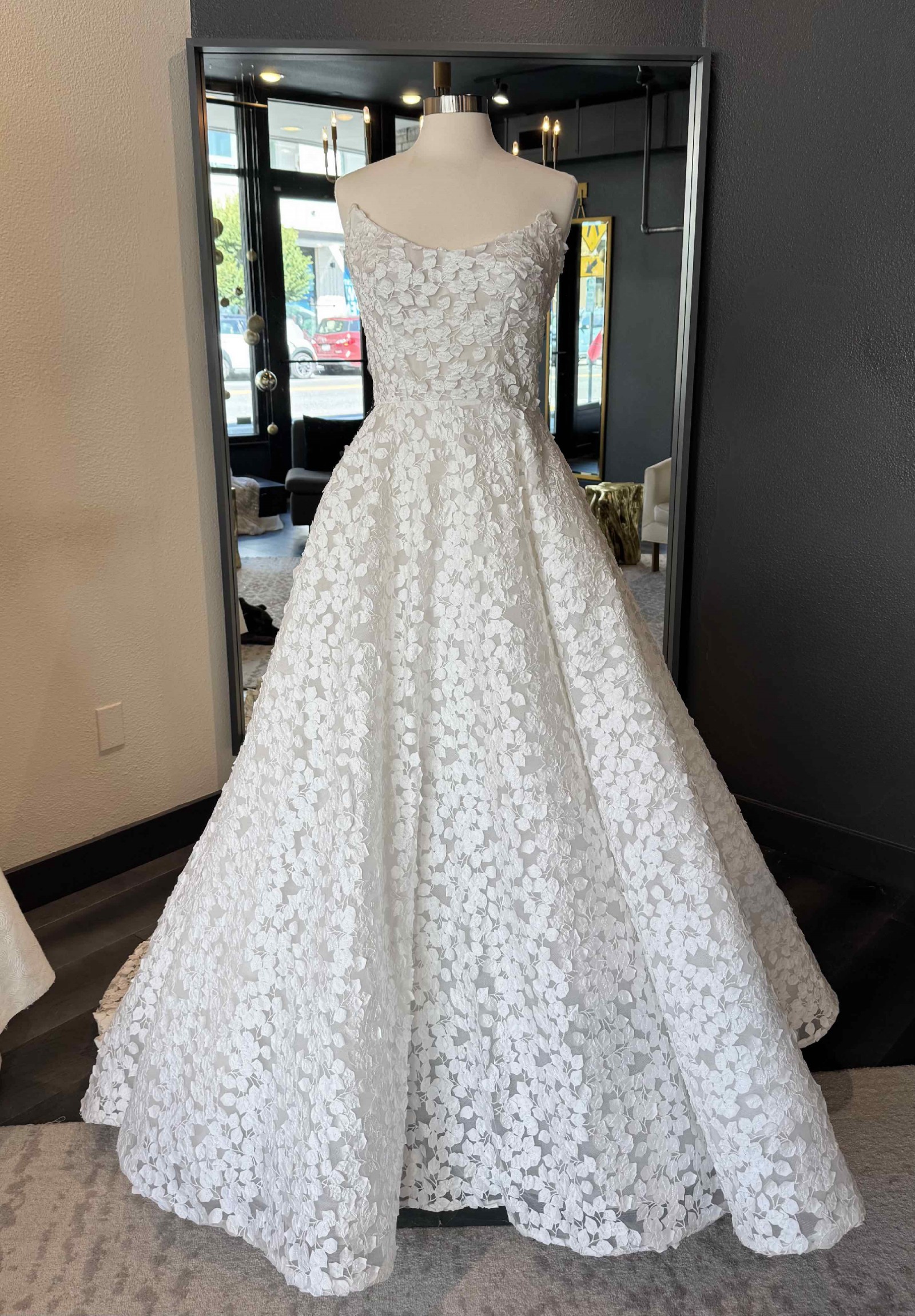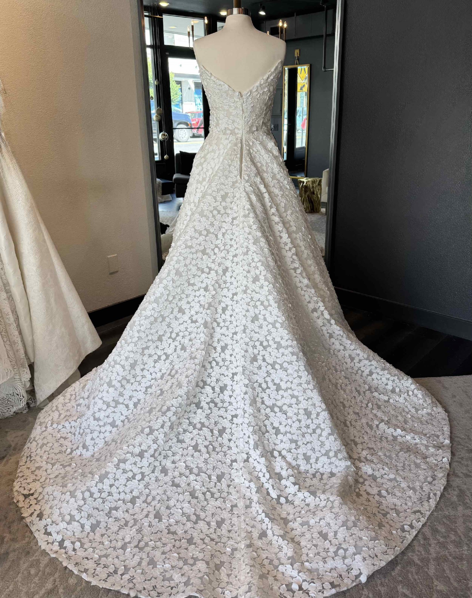 A strapless 3D floral embroidered gown featuring a scoop neckline, scoop back, a natural waistline, and grand a-line skirt with a cathedral-length train. The gown is sampled in the same colorway the designer presented and photographed it in: cream tulle and 3D floral embroidery + nude lining. (*Please note it is very light nude color.)