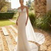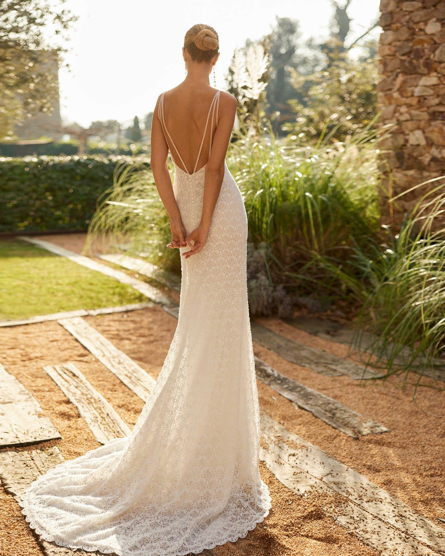Lace and beading all over, wedding dress. It´s a soft mermaid, almost sheath figure. Thin straps with a low back and sweetheart neckline. The train is short. It´s a dress for the bride who is not afraid to shine.