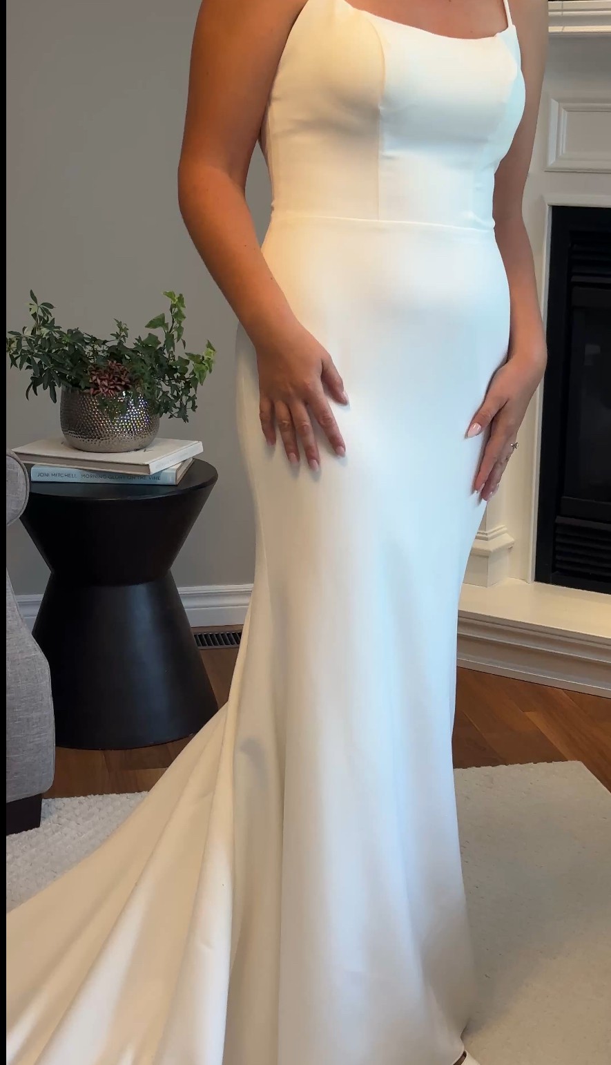 This Justina dress from Mon Bijou Bridal is nothing short of a dream come true. With its fit and flare silhouette, it hugs my curves in all the right places, creating a timeless elegance that I felt truly special in on my big day. The square neckline adds a modern touch while still capturing that classic bridal essence, and the low back elegantly reveals a hint of skin, making it the perfect combination of sexy and sophisticated.