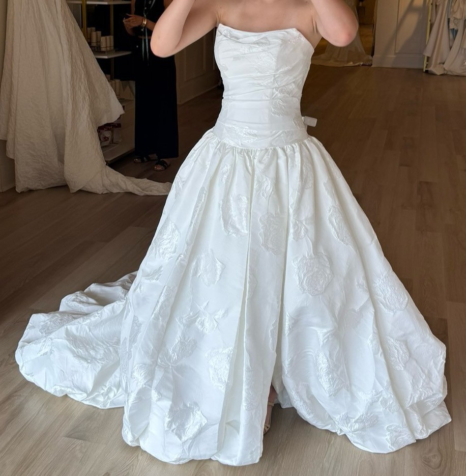 A beautiful drop waist dress with a bubble hem and slit on the side. Jacquard fabric with roses. I LOVE this dress - I am still getting married I just changed my mind on what style I wanted.