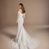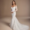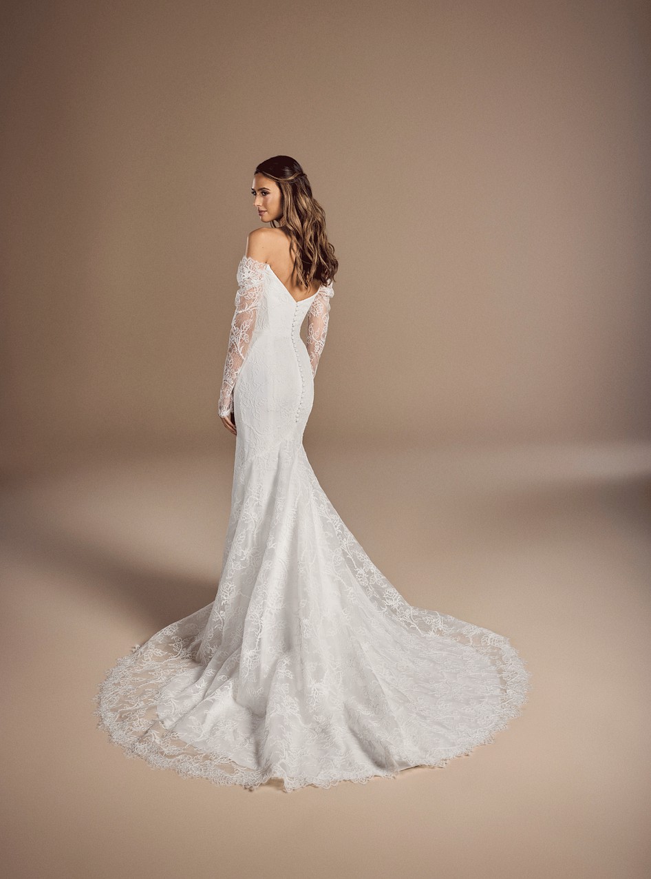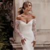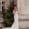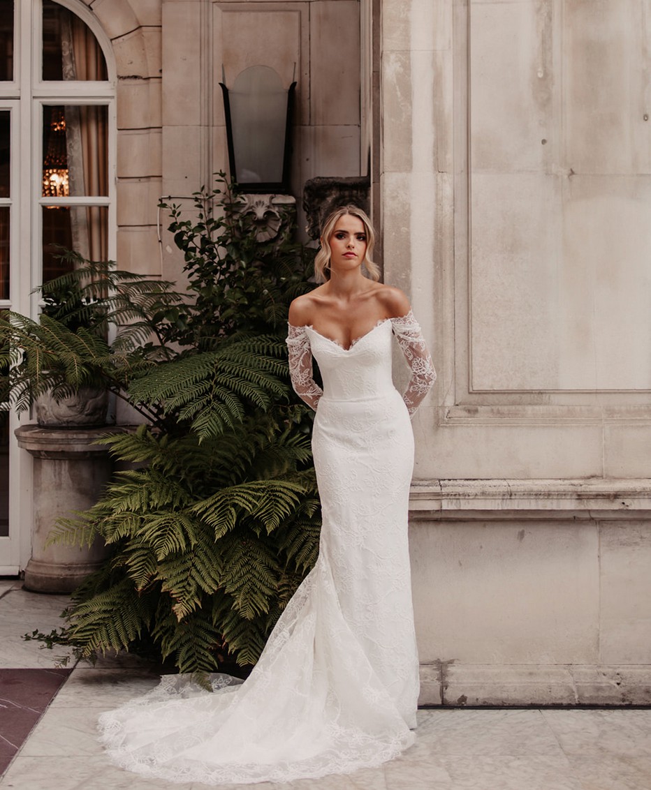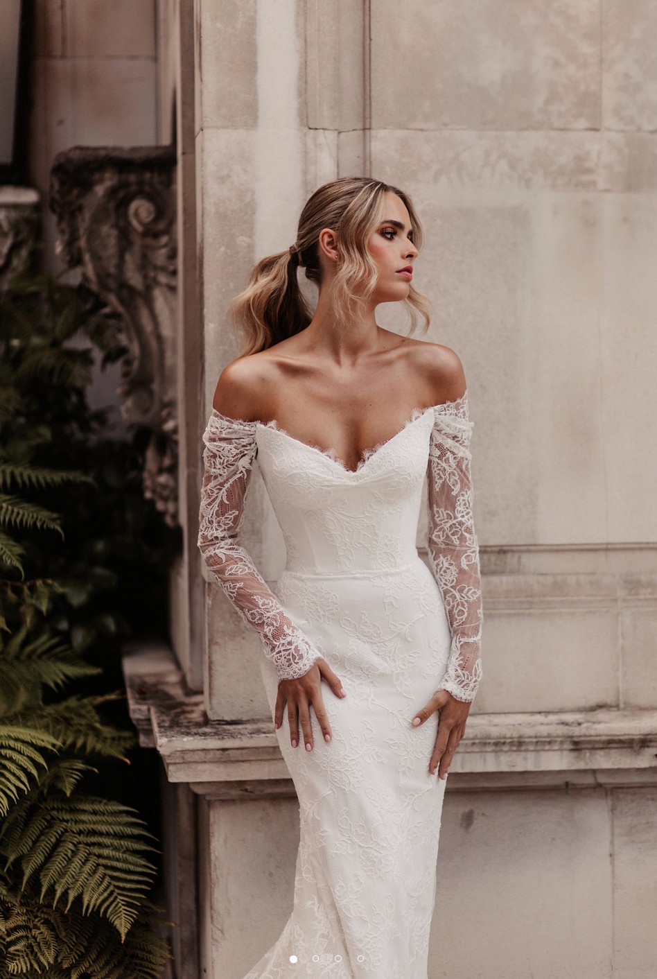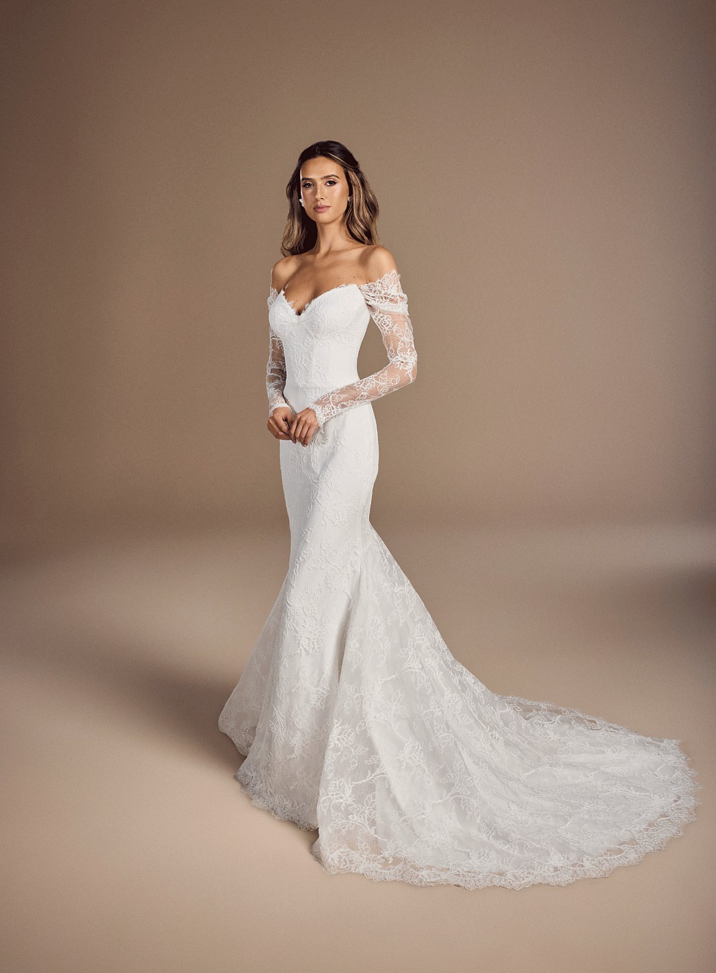 Corseted gown with off-the-shoulder bodice, detachable long lace sleeves, and fitted lace skirt. More photos and videos availble upon request.