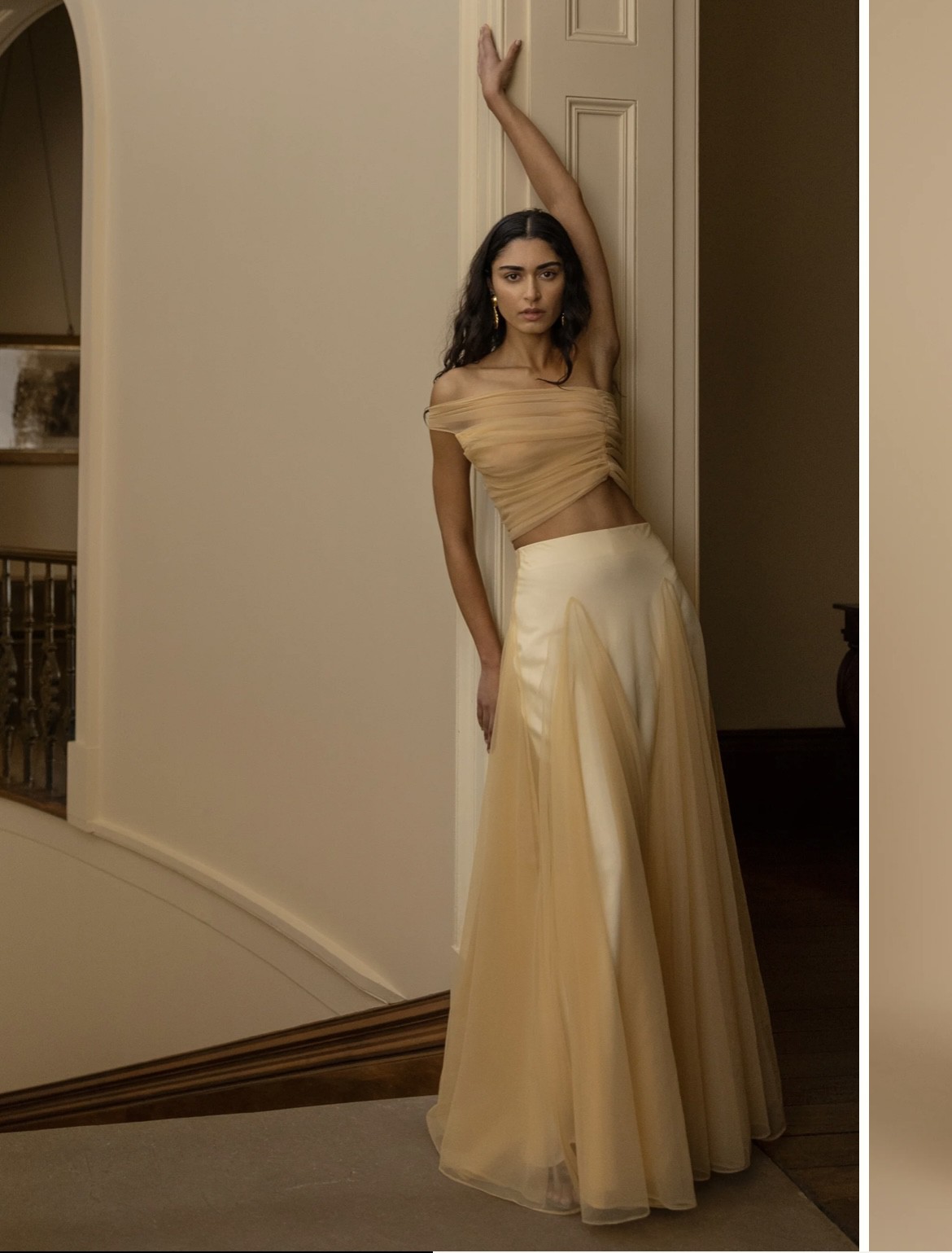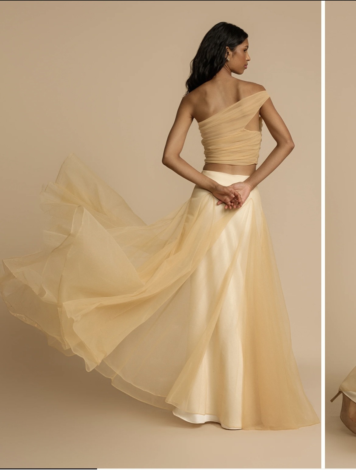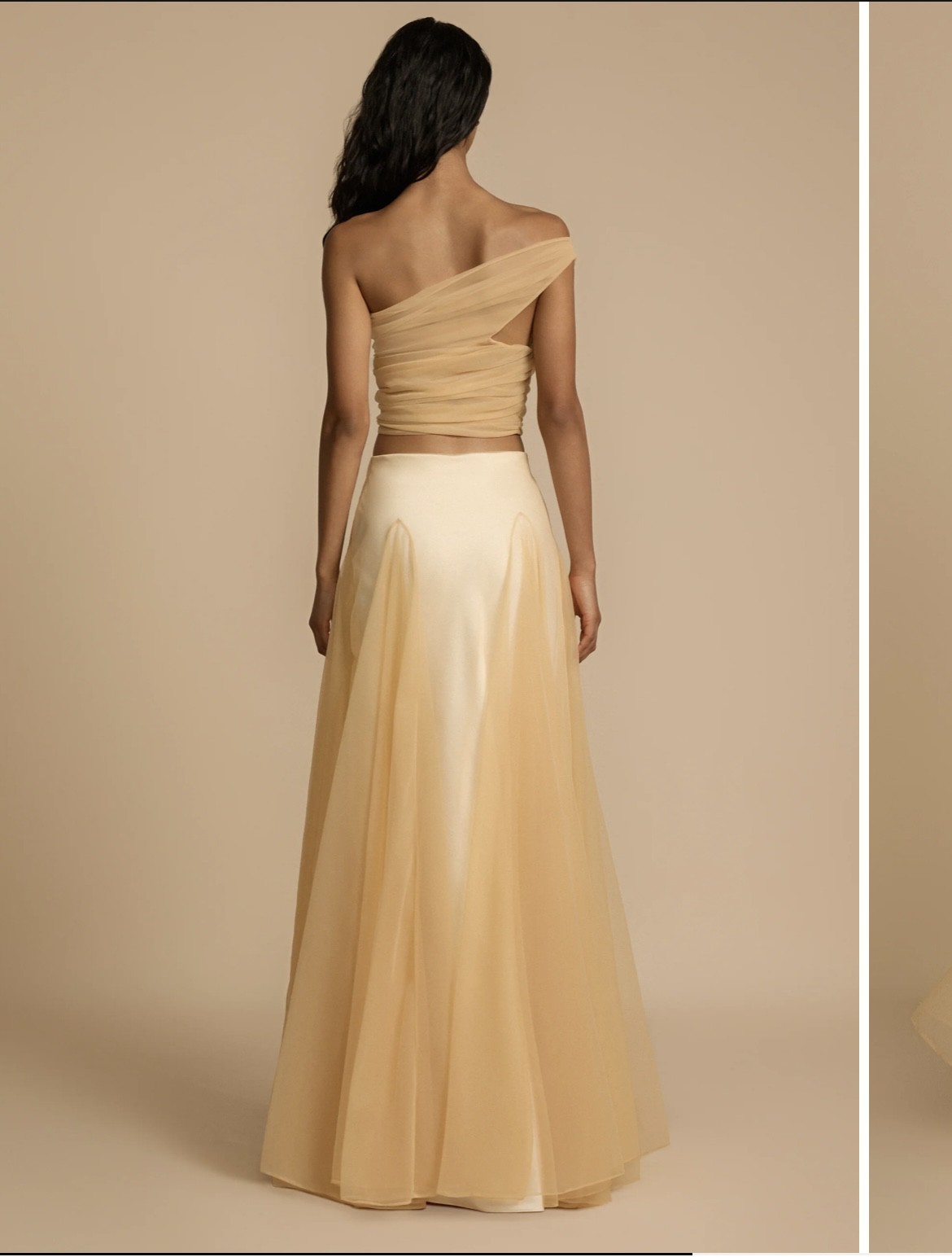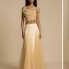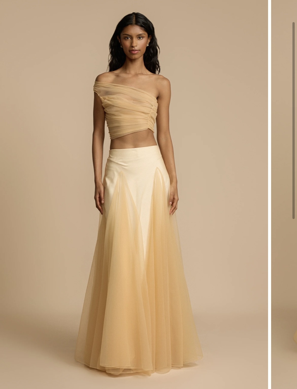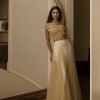 New with tags. Bought it for rehearsal dinner but decided to go with a different dress. Beautiful set Violetta top, crafted with soft bridal tulle featuring a semi-sheer finish for a touch of sensual elegance. Made to drape over your bust and effortlessly sit off the shoulder to highlight your décolletage. Violetta features a hand tacked ruching technique that finishes at the waist. Lined Invisible zip Top offers slight stretch A-symmetrical one shoulder Champagne bridal tulle Violetta skirt, crafted with soft bridal tulle featuring voluminous godet panels for grace in your movement. Lined with a cream bias skirt, Violetta effortlessly blends vintage charm with contemporary sophistication. Lined with a satin slip Elasticated waist band Skirt offers slight stretch Invisible side zip Floor length A-line silhouette Champagne bridal tulle & Cream silk satin