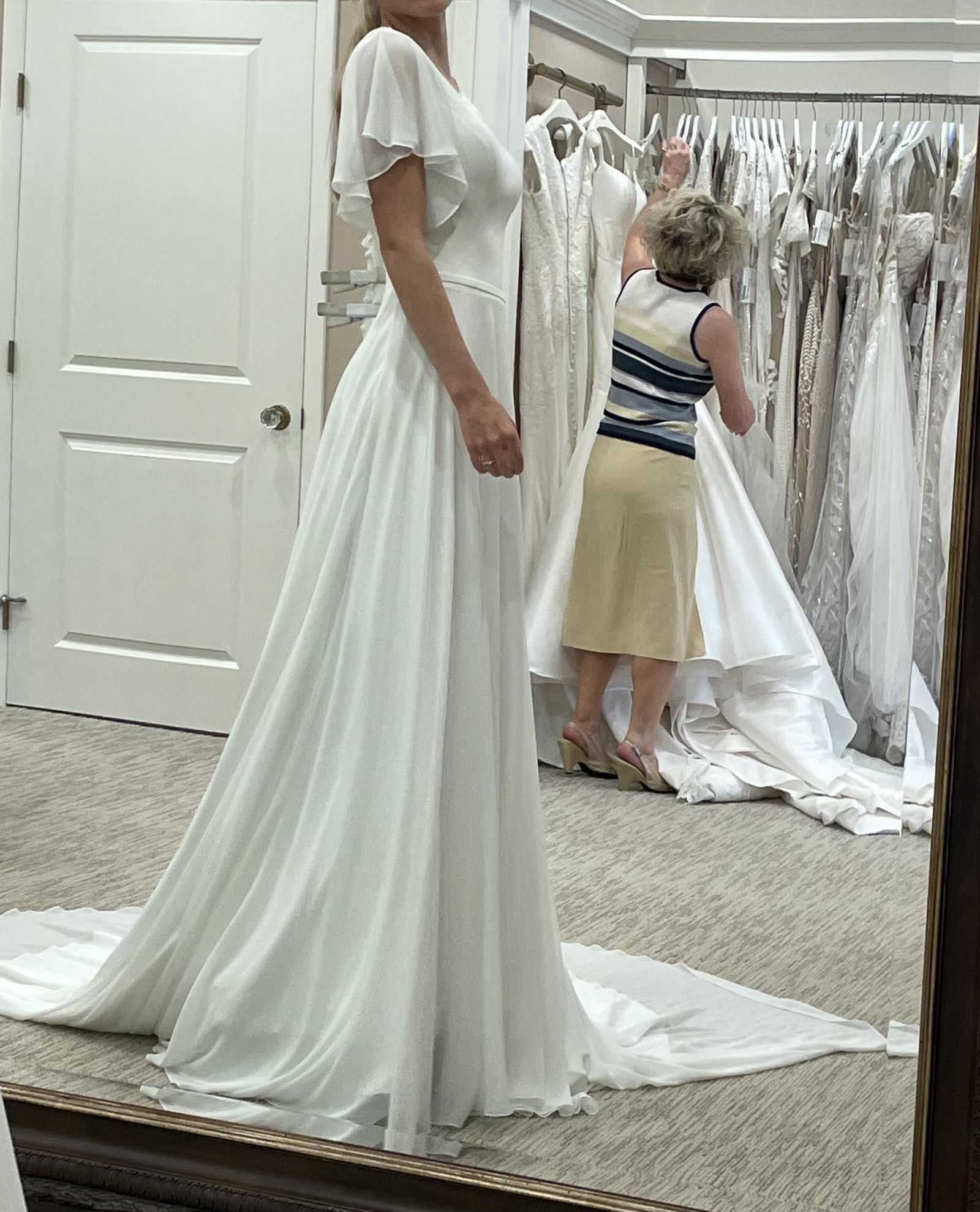 Beautiful Flowy Ivory Chiffon Wedding dress Buttons down back Unaltered, never worn, perfect condition Bride decided to go with a different option