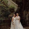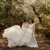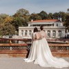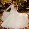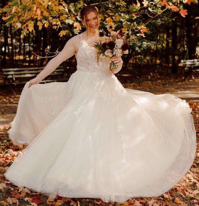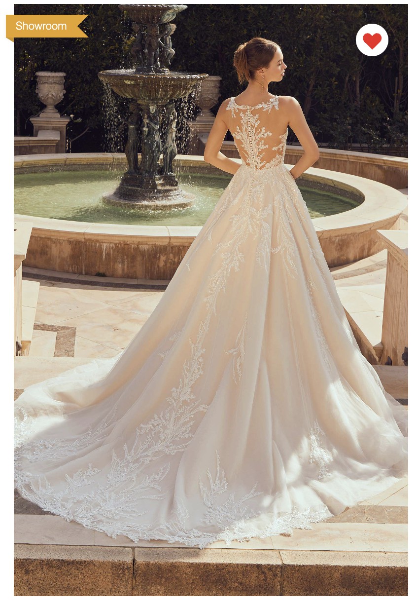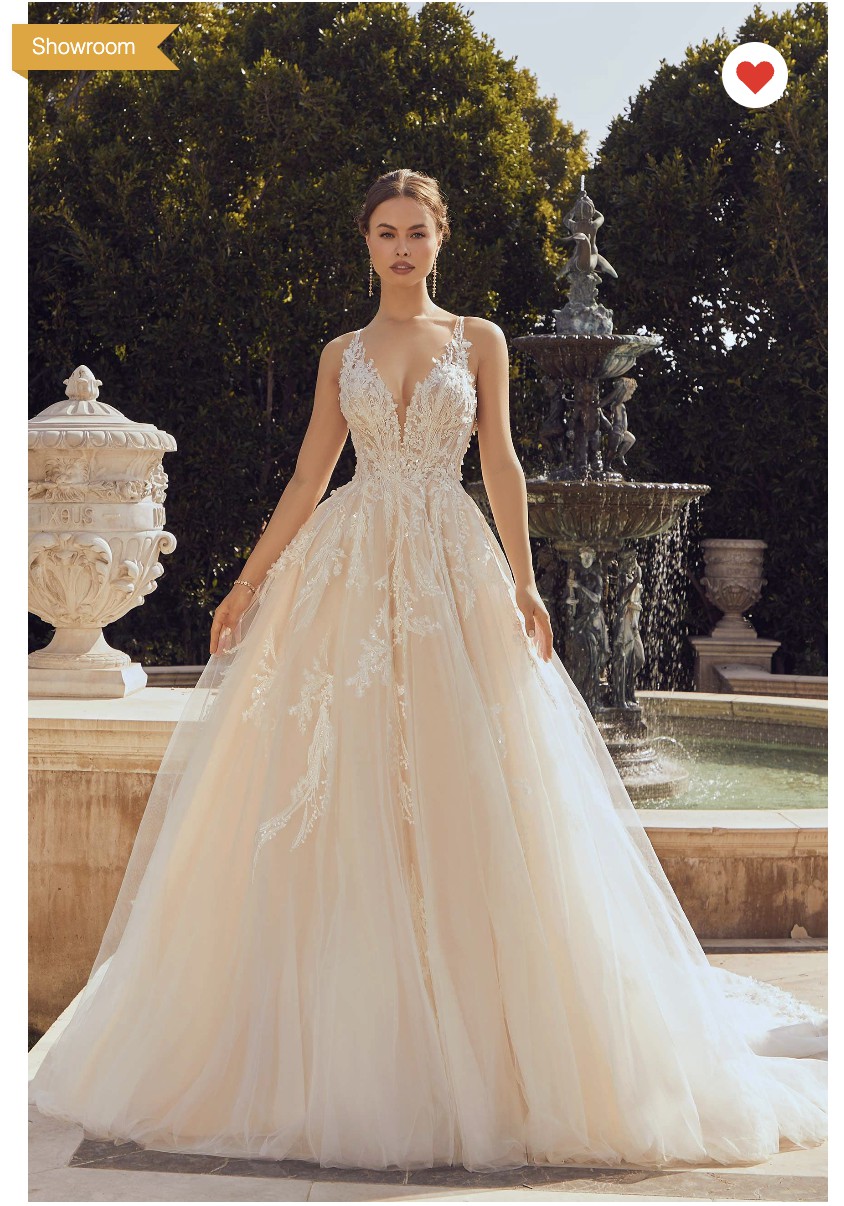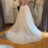 Dream dress with a dramatic train that sparkles in the sunlight. This v-neck a-line masterpiece of a dress has gorgeous beading and lace that curves up the skirt and up the sheer back with an almost feather-like pattern. It served me very well on my wedding day October 19, 2025 and is ready for a new life with someone who will love her just as much as I did! The dress is an extraordinary dream-come-true for someone who embraces words like "cupcake" and "princess" on their big day. I got so many compliments for what a magical choice it was.