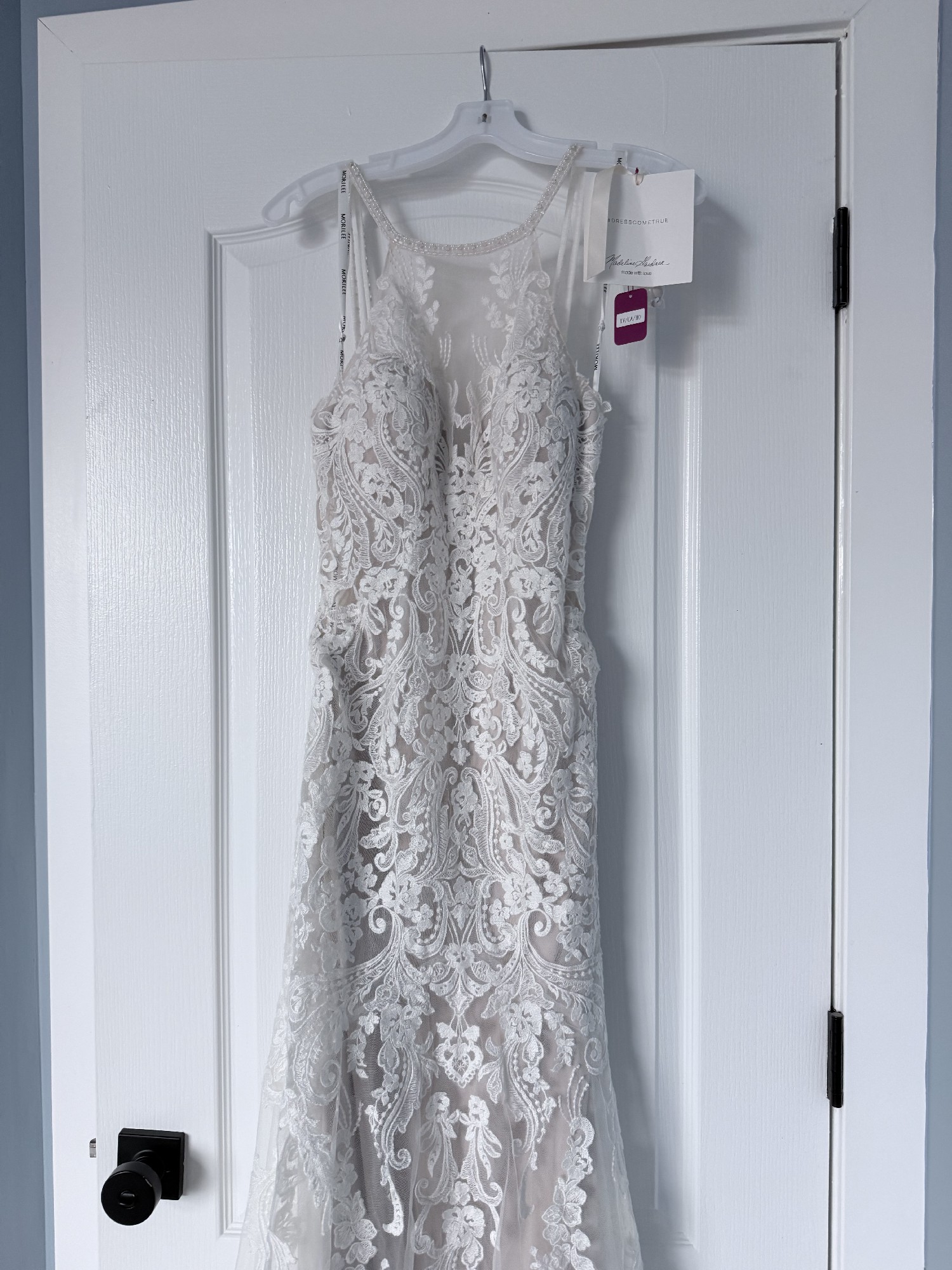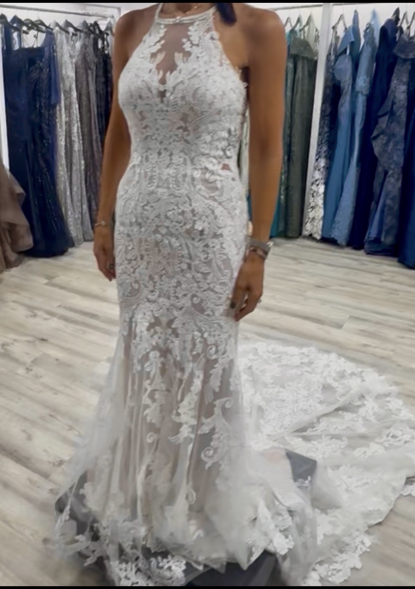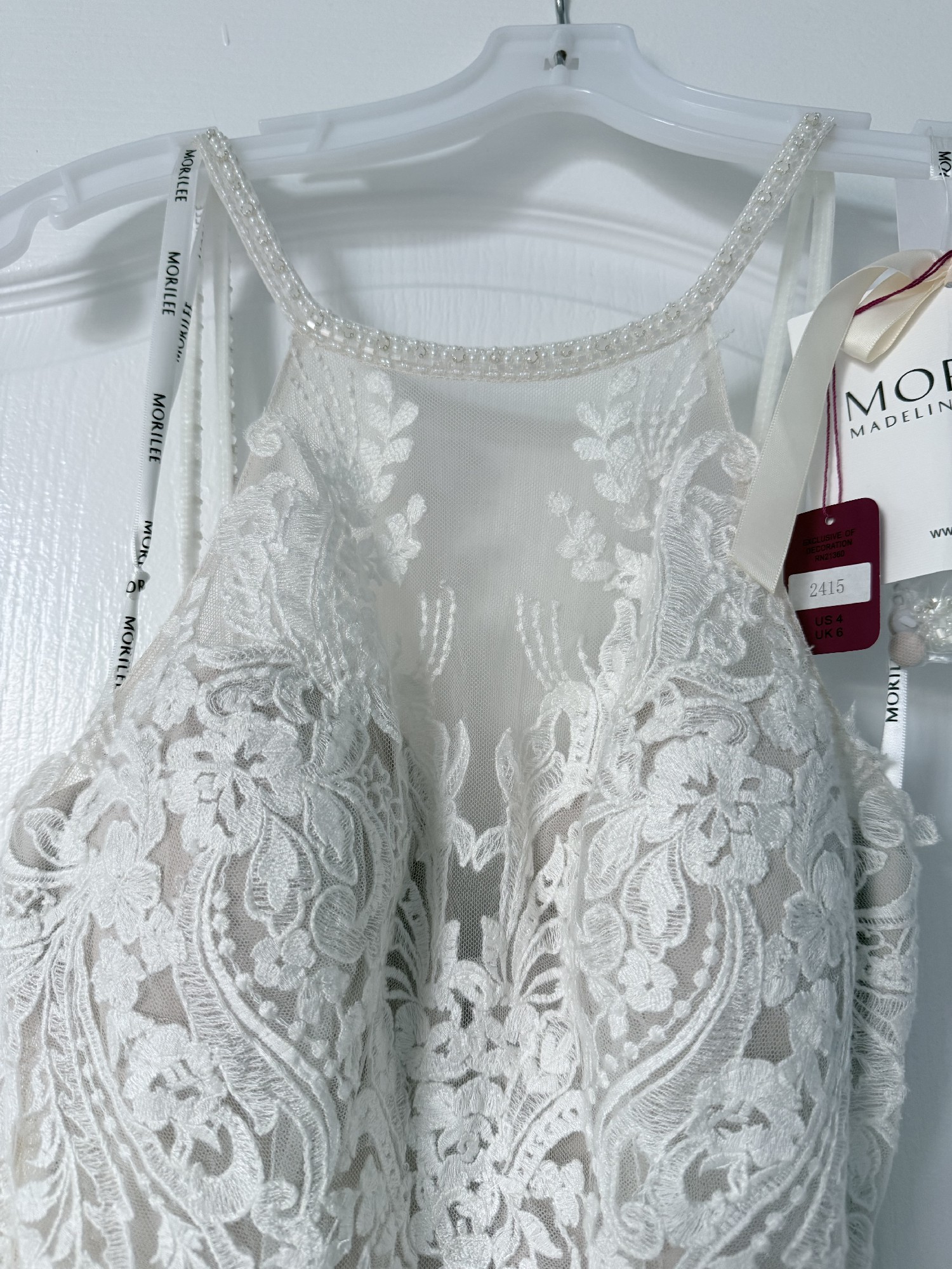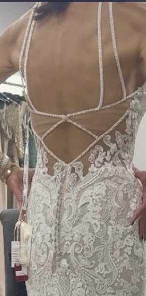 Brand New NEVER WORN- tags still attached. Mori Lee 2415 Danielle- Fit and Flare gown, Champagne / Ivory. Features a beaded halter neckline and a strappy illusion back with a keyhole. Stunning Stunning Stunning!!