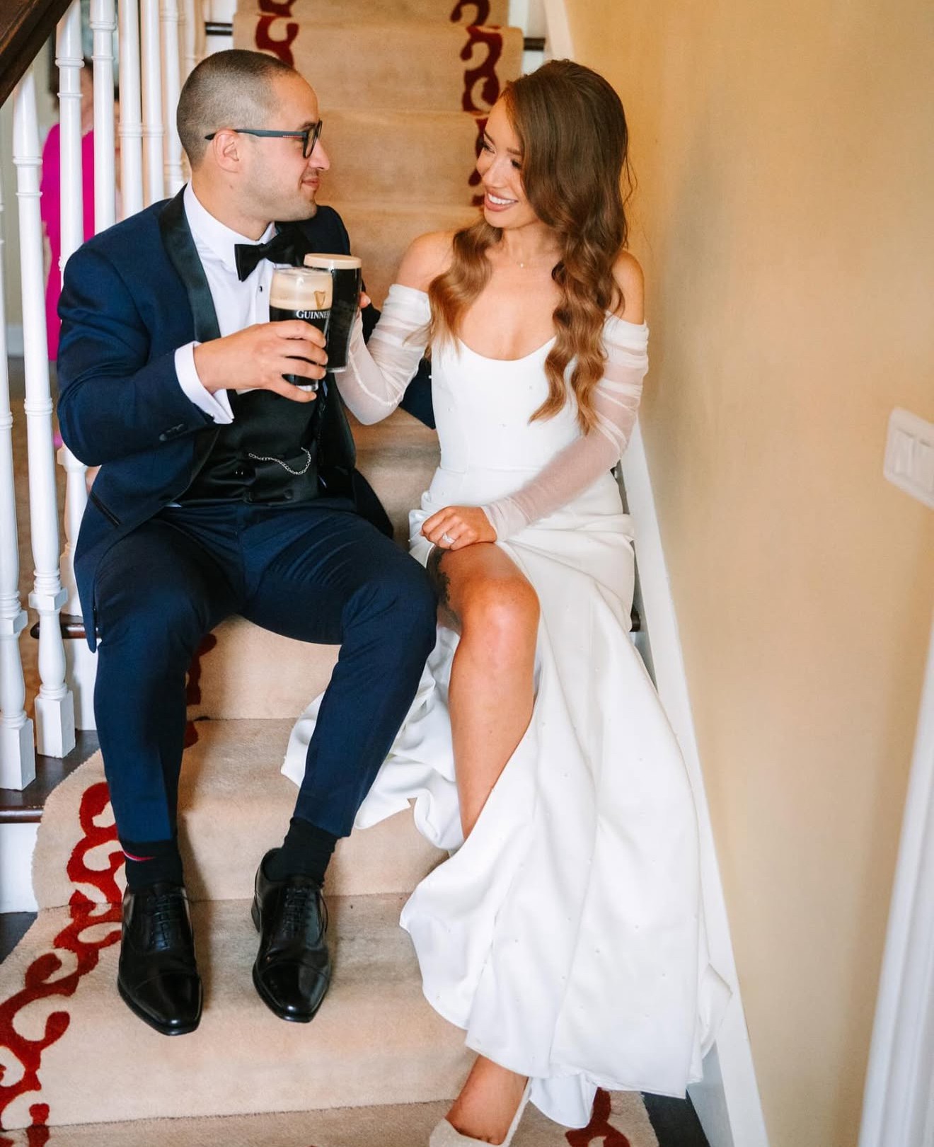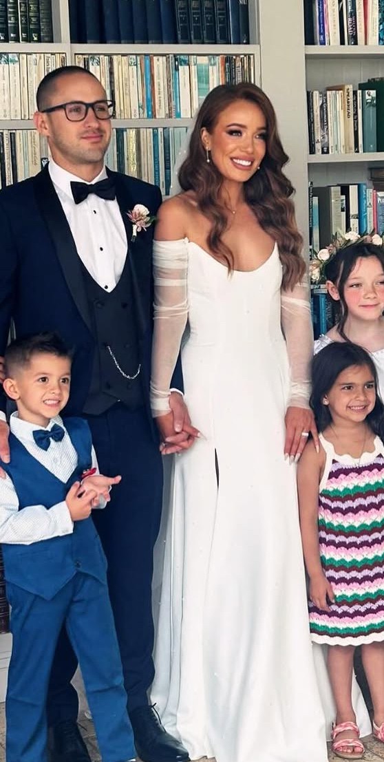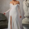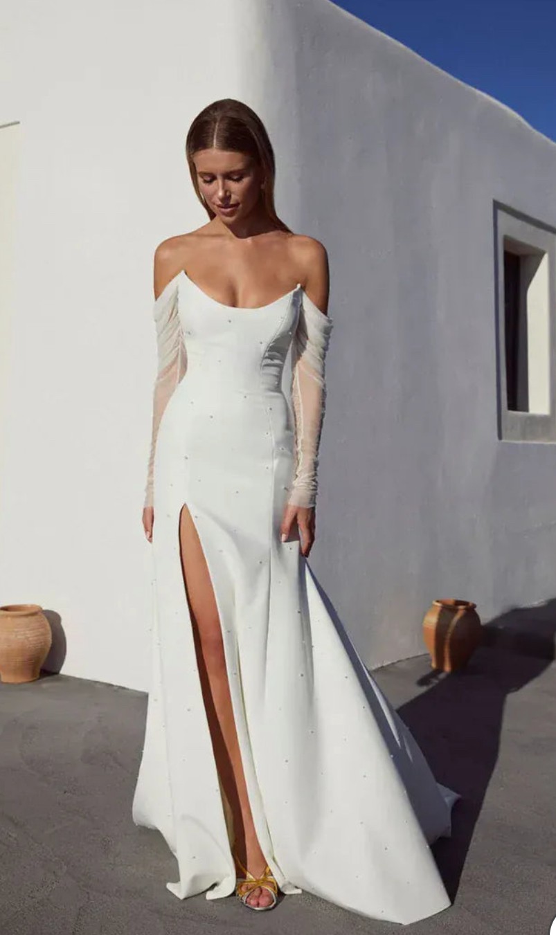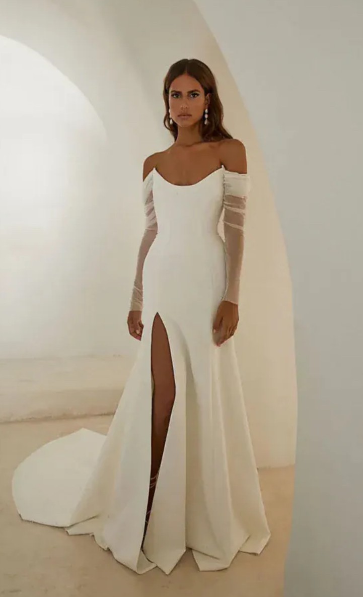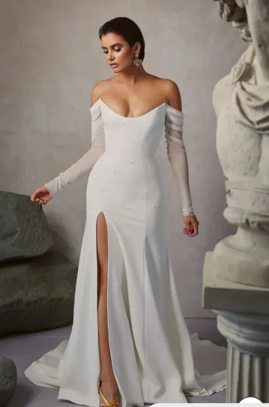 Modern crepe sheath wedding gown by Sarah Seven in the popular Brontë style. Features a wide scoop neckline, elegant fitted shape, subtle train, and a high slit for movement and edge. The clean lines and luxe crepe fabric give this dress a minimalist yet fashion-forward feel, ideal for a bride who wants refined chic with a bit of wow Willing to compromise on the price, just shoot me a message $900 worth of alterations was done at a beautiful seamstress 'sew elegant' in NYC. She maintained the integrity of the dress while also adding a beautiful bustle to the back