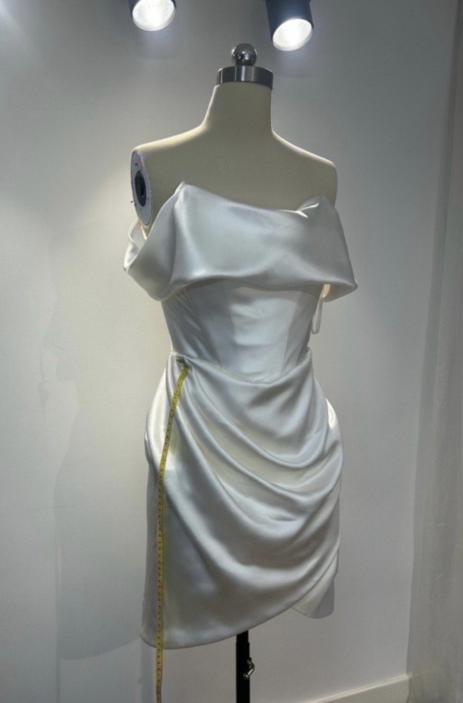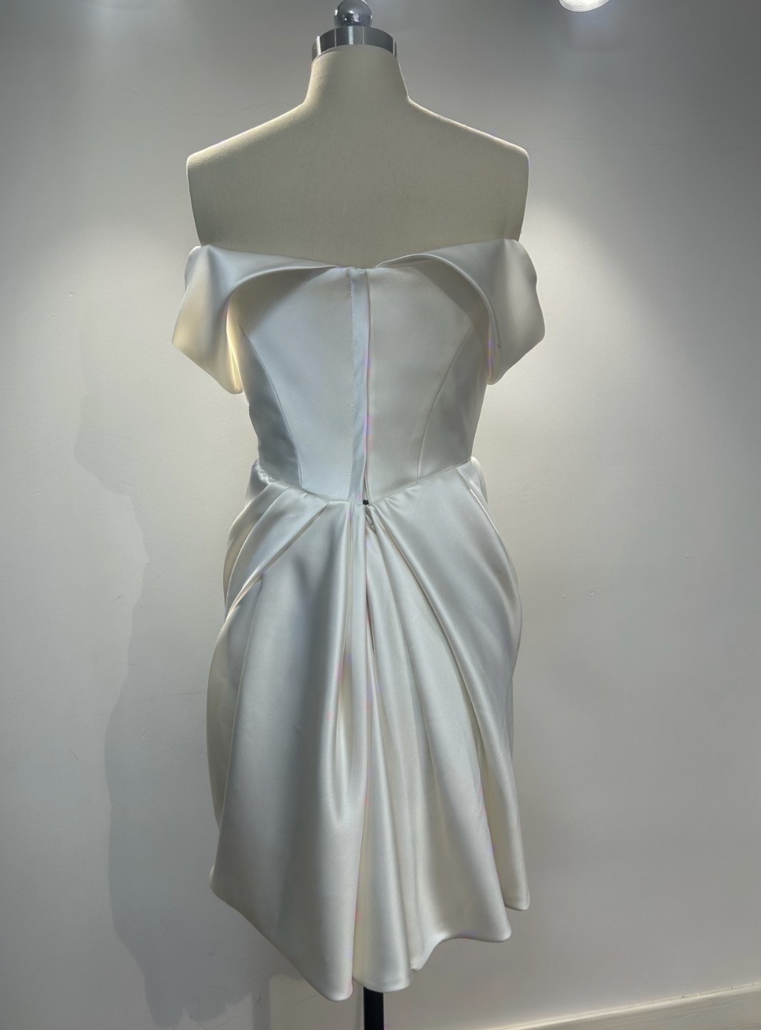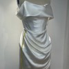 Vivienne Westwood-inspired off the shoulder custom-made as a second look wedding dress, fits as a US size 4. Lots of internal boning and structure, material is satin. Has been professionally dry cleaned and worn only once for my wedding. Would love to pass along this beautiful dress to another bride for a first or second look.