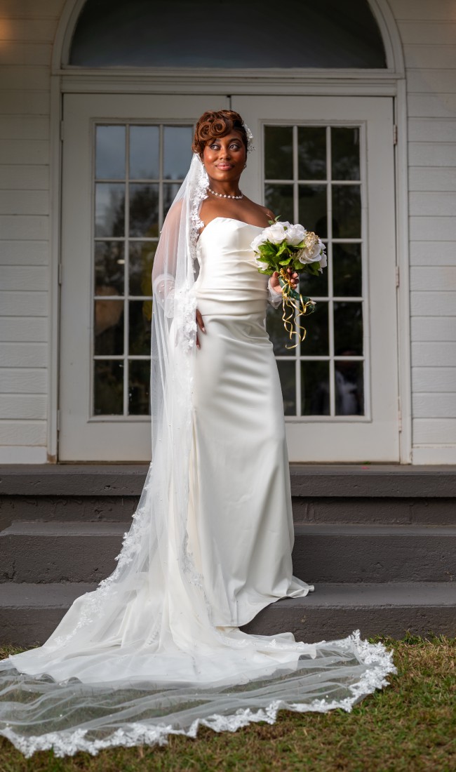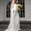 Strapless stretch satin fit to flare gown and draped bodice detail.