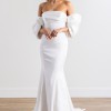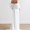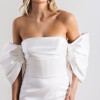 The Mercedes gown, a sheath silhouette with a princess waistline, large bow sleeve detailing, and a removable bow train for two looks in one. The bow sleeves can be worn either on the top of your shoulder or off the shoulder.