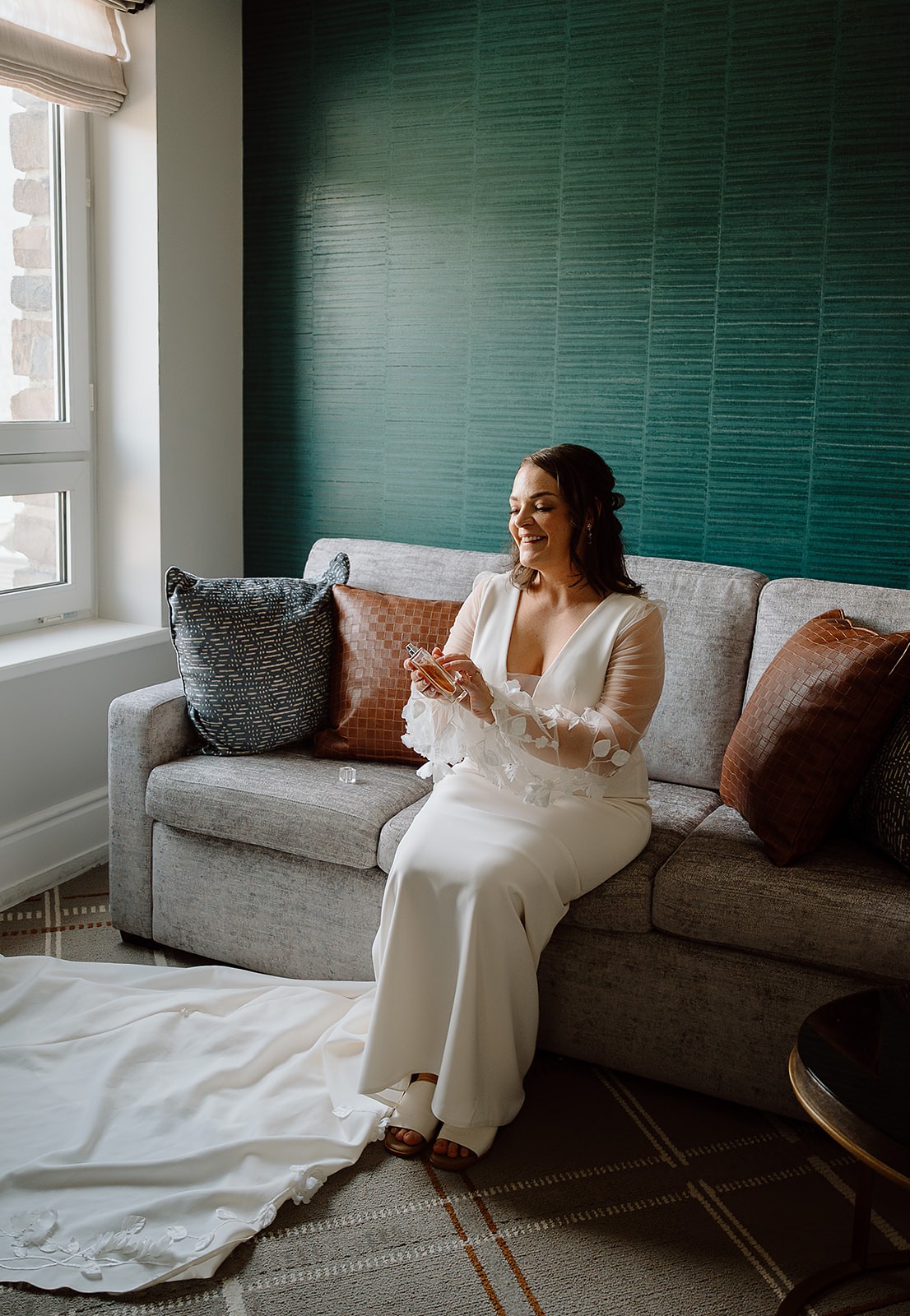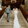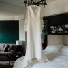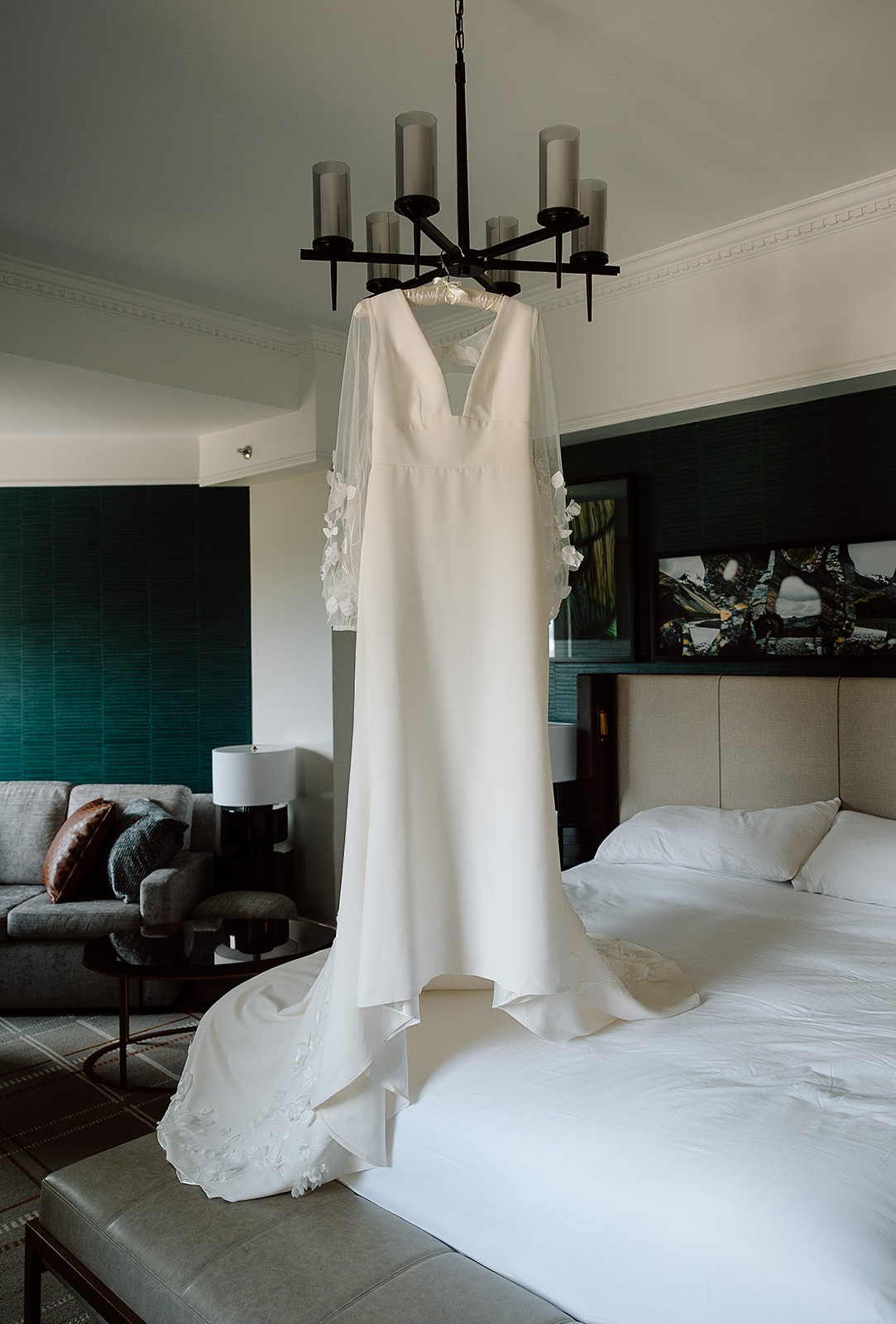 Dress is by Tara Lauren, from there classic collection. It is a fitted Stretch crepe gown with a figure flattering silouhette. It features a v-neck and bishop sleeves with laser cut floral embellishment. The dress has a key hole back, and cascading floral train detail. Ivory in color. The design of the dress closely hugs the body and then flows into a cascading train. It blends romantic elements with contemporary minimalism and an elevated bohemian aesthetic.