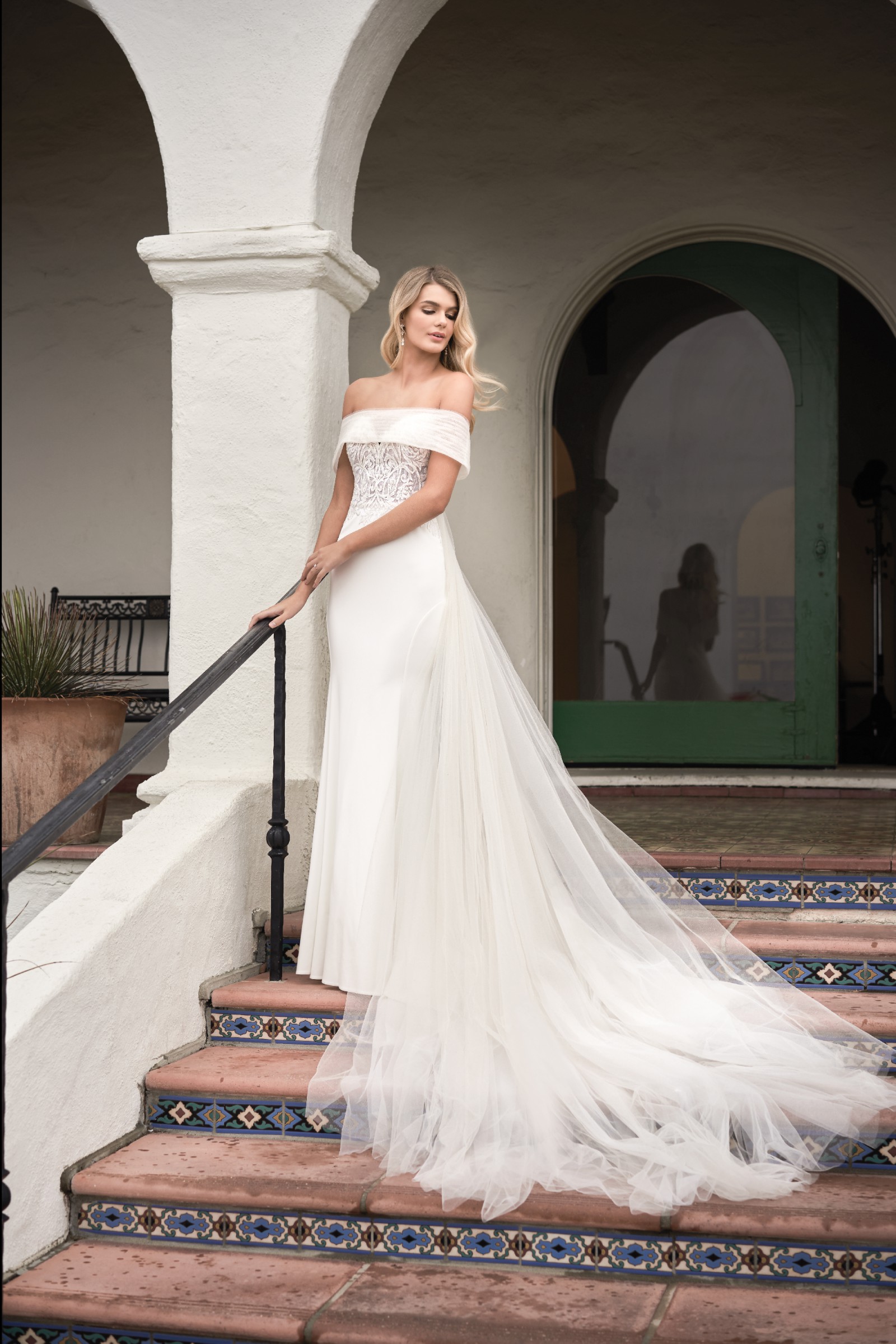 Crafted from crepe fabric in a soft ivory hue, this floor-length gown flows gracefully with every step, creating an enchanting aura. The low back adds an alluring detail, while the strapless design ensures you're comfortable and confident throughout your special day. Add to this a beautiful detachable cape that creates a dramatic shimmering draping train in flecks of ivory and gold, it makes for a unique whimsical touch of class and elegance. The overall design of this dress combines classic elements with a contemporary twist, making it an ideal choice for both traditional and modern weddings.