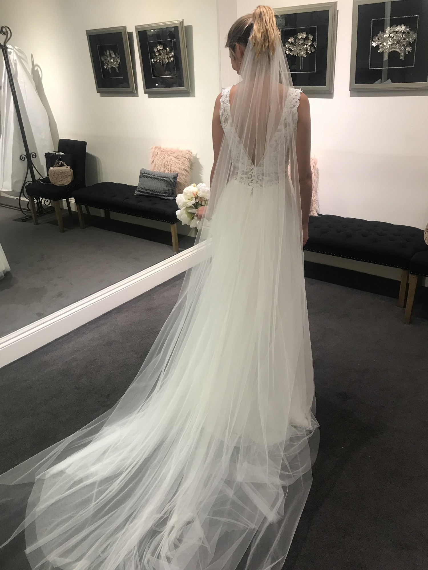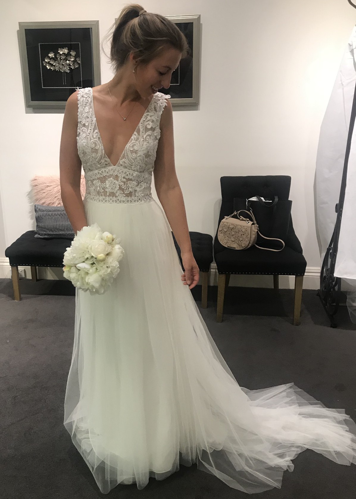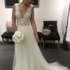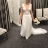 This stunning Maggie Sottero Maureen gown combines romantic elegance with effortless comfort. The bodice features a deep V-neckline with beautifully detailed lace, offering a flattering and feminine silhouette. The soft, flowing tulle skirt falls gracefully to the floor, creating a light, airy movement—perfect for both indoor and outdoor weddings.