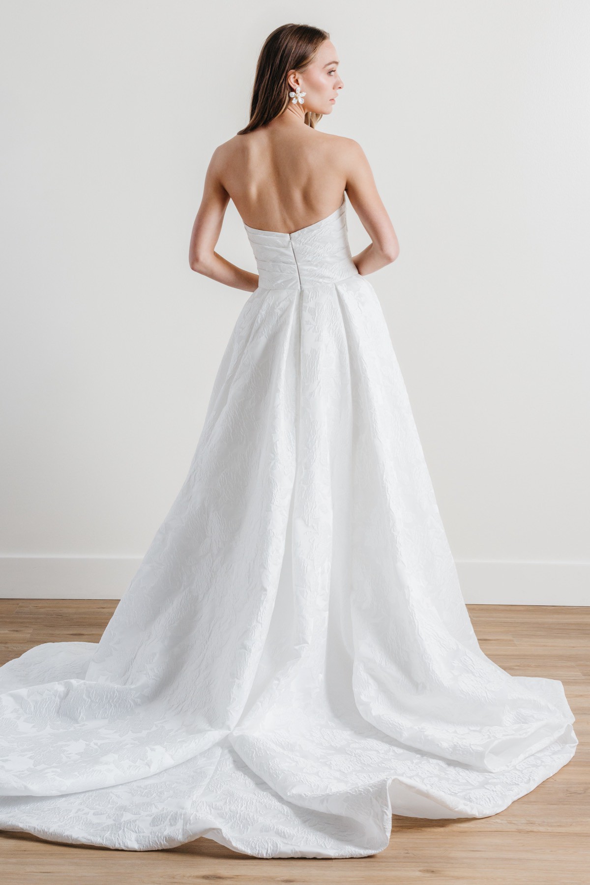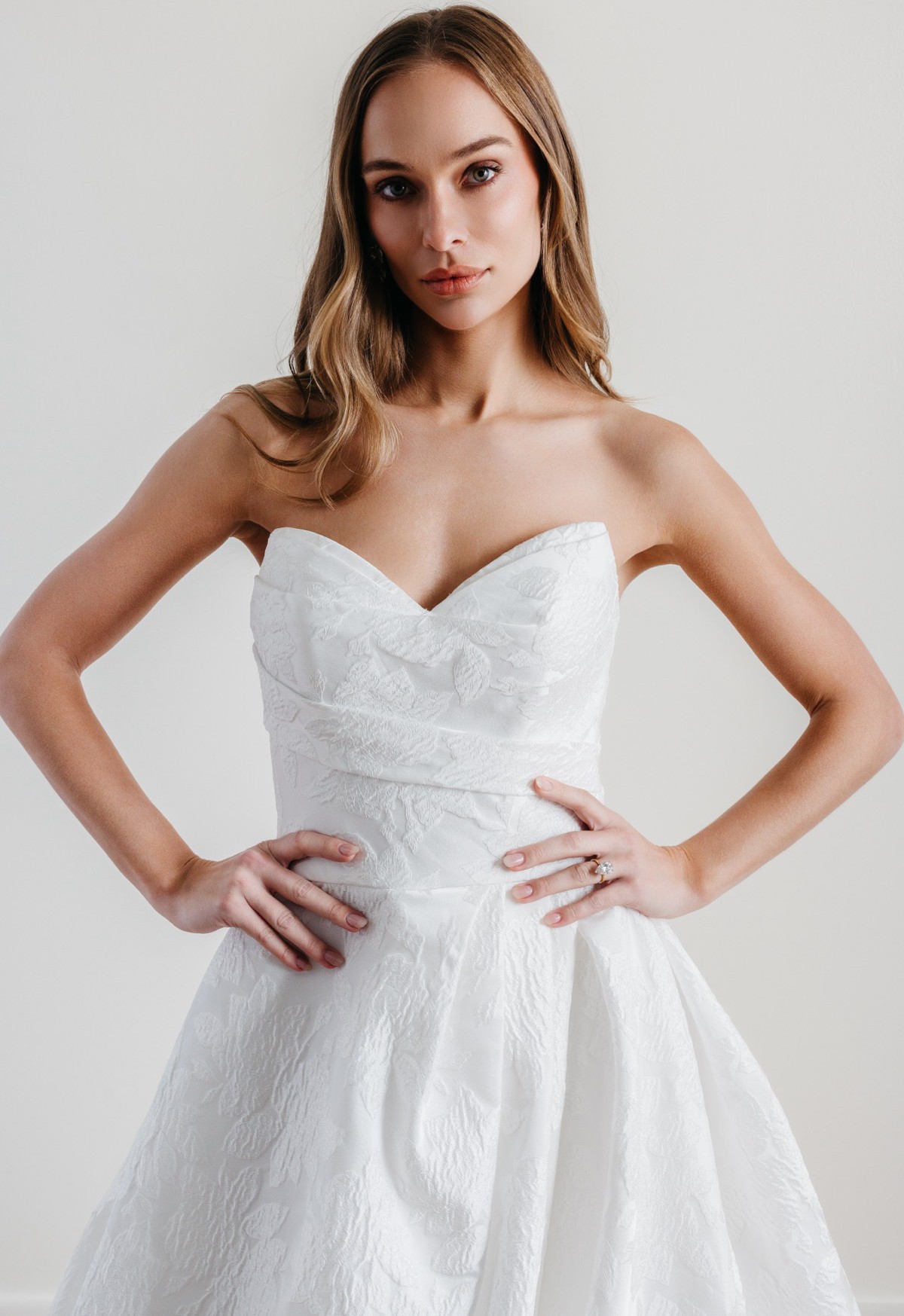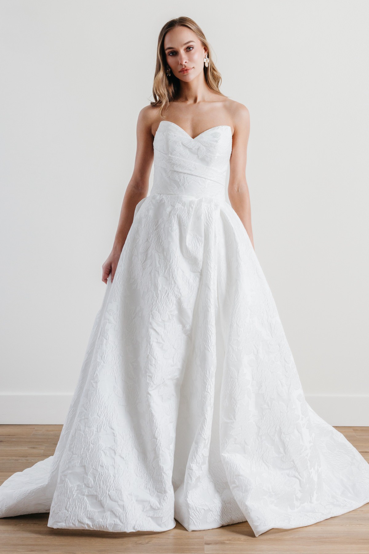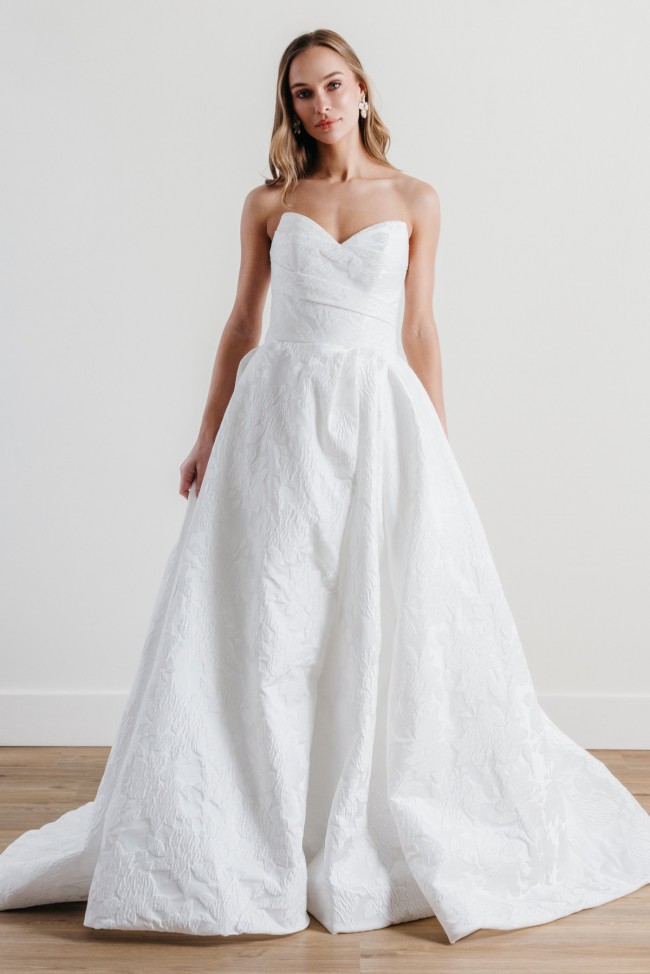 A stunning fusion of modern and classic, Treasure features a sweetheart neckline and an A-line silhouette that flatters every figure. The strapless design is bra-friendly, while the pockets in the skirt offer both style and practicality. With its luxurious brocade fabric, this gown is a true treasure for the fashion-forward bride.