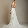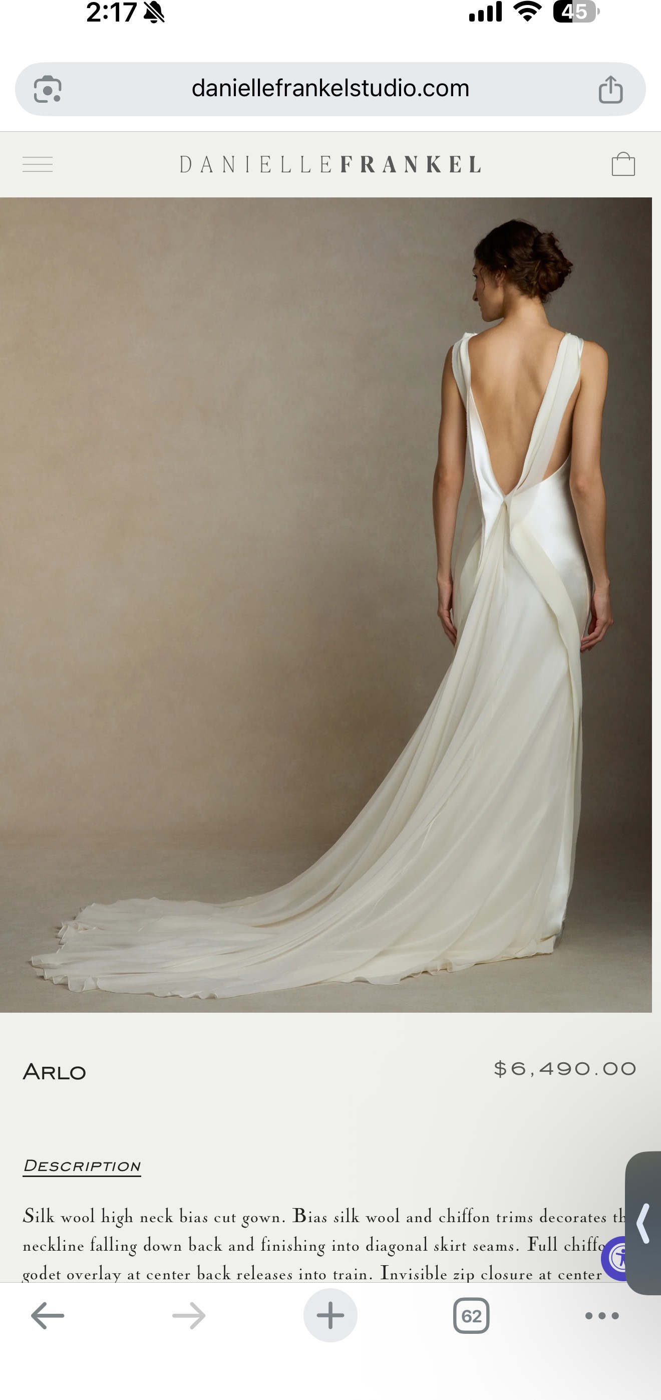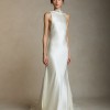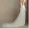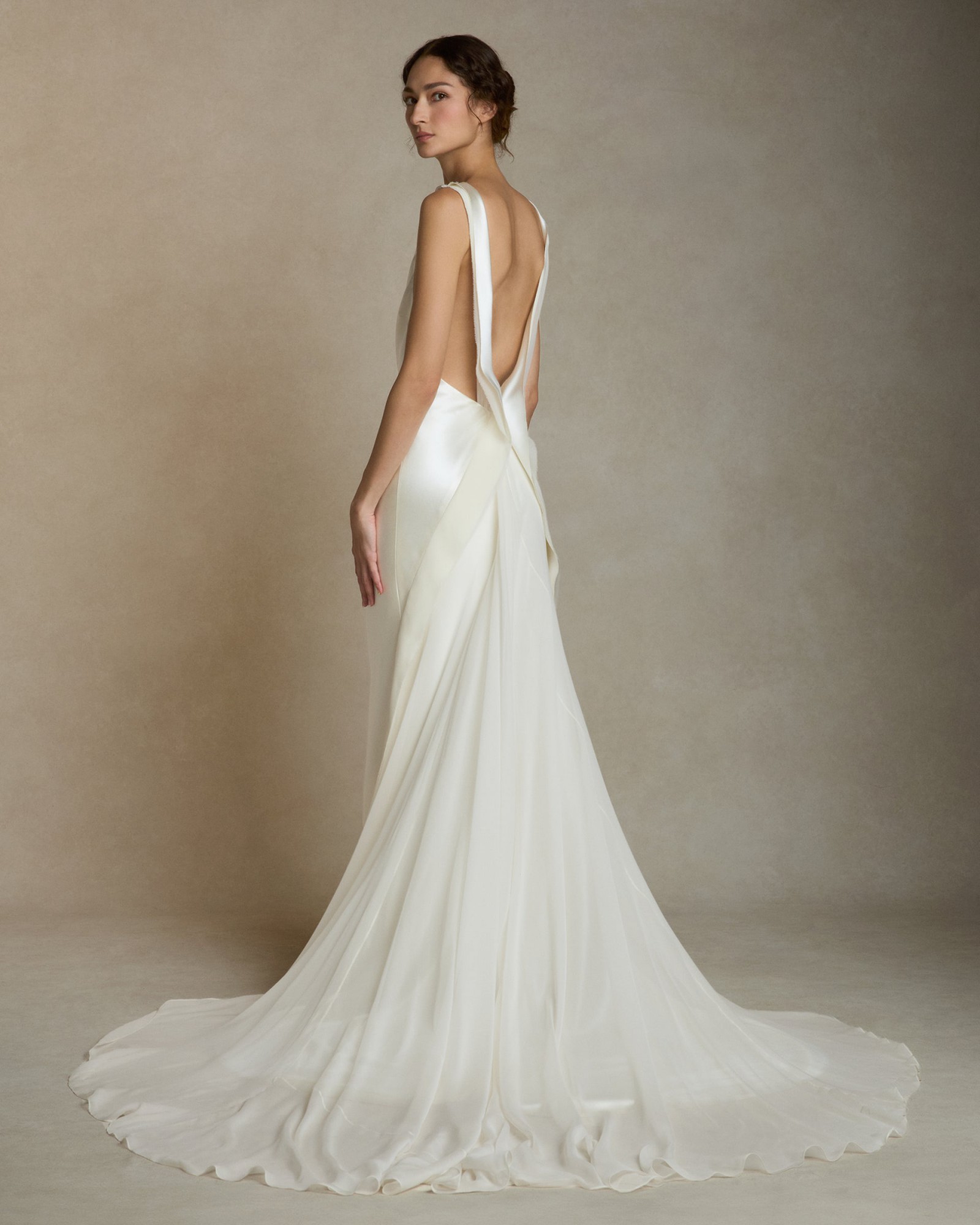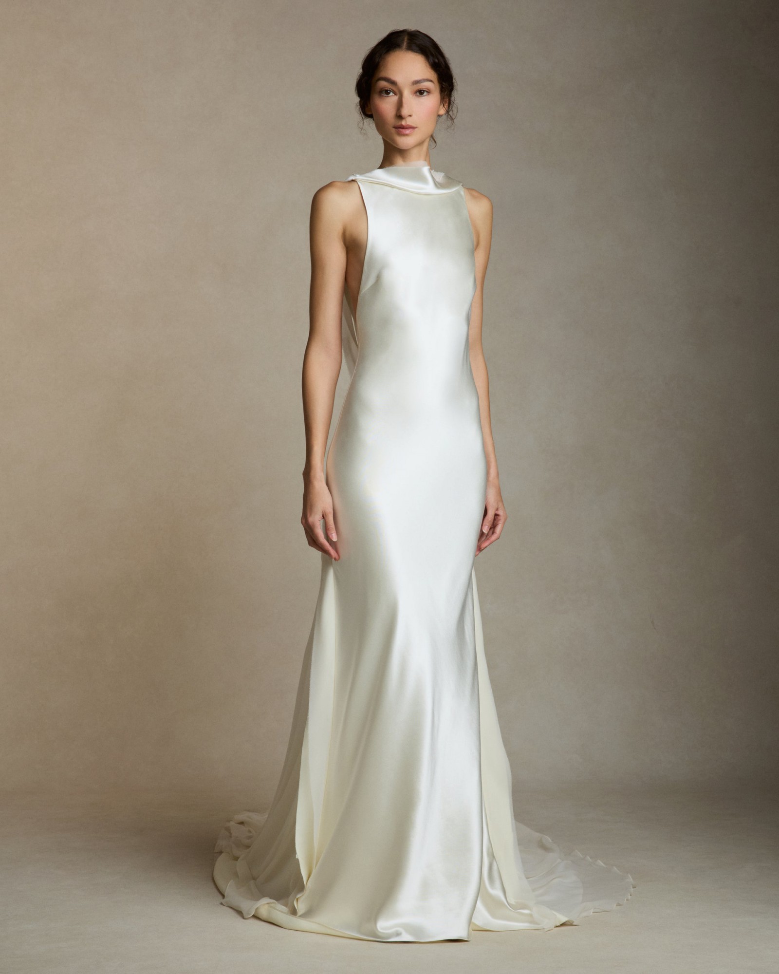 Silk wool high neck bias cut gown. Bias silk wool and chiffon trims decorates the neckline falling down back and finishing into diagonal skirt seams. Full chiffon godet overlay at center back releases into train. Invisible zip closure at center back.