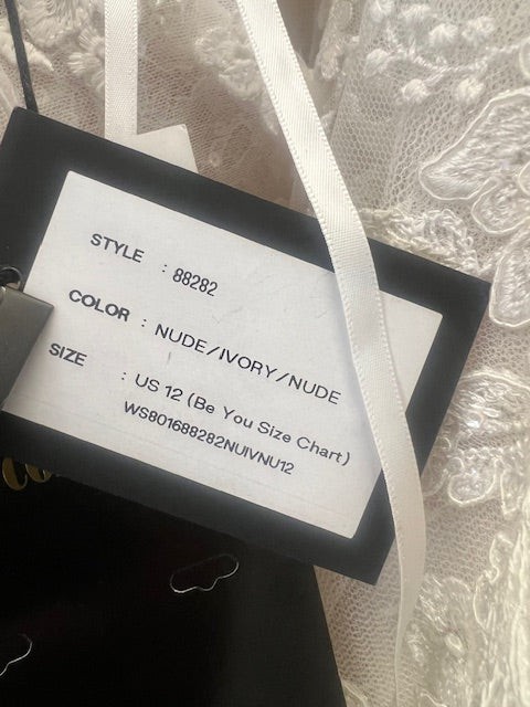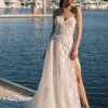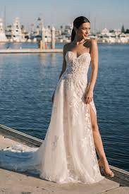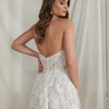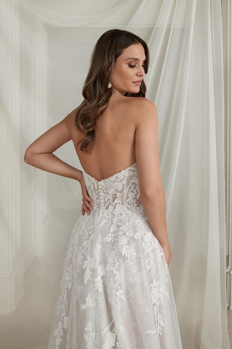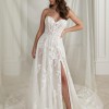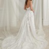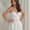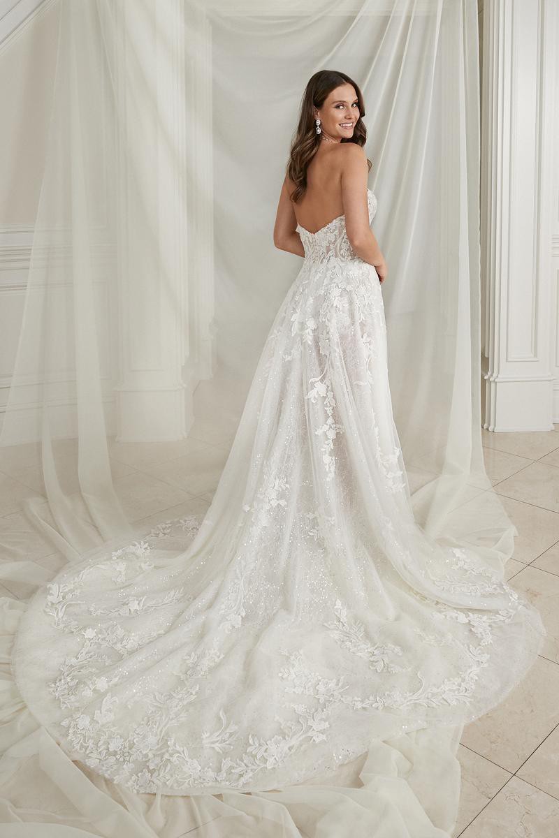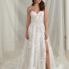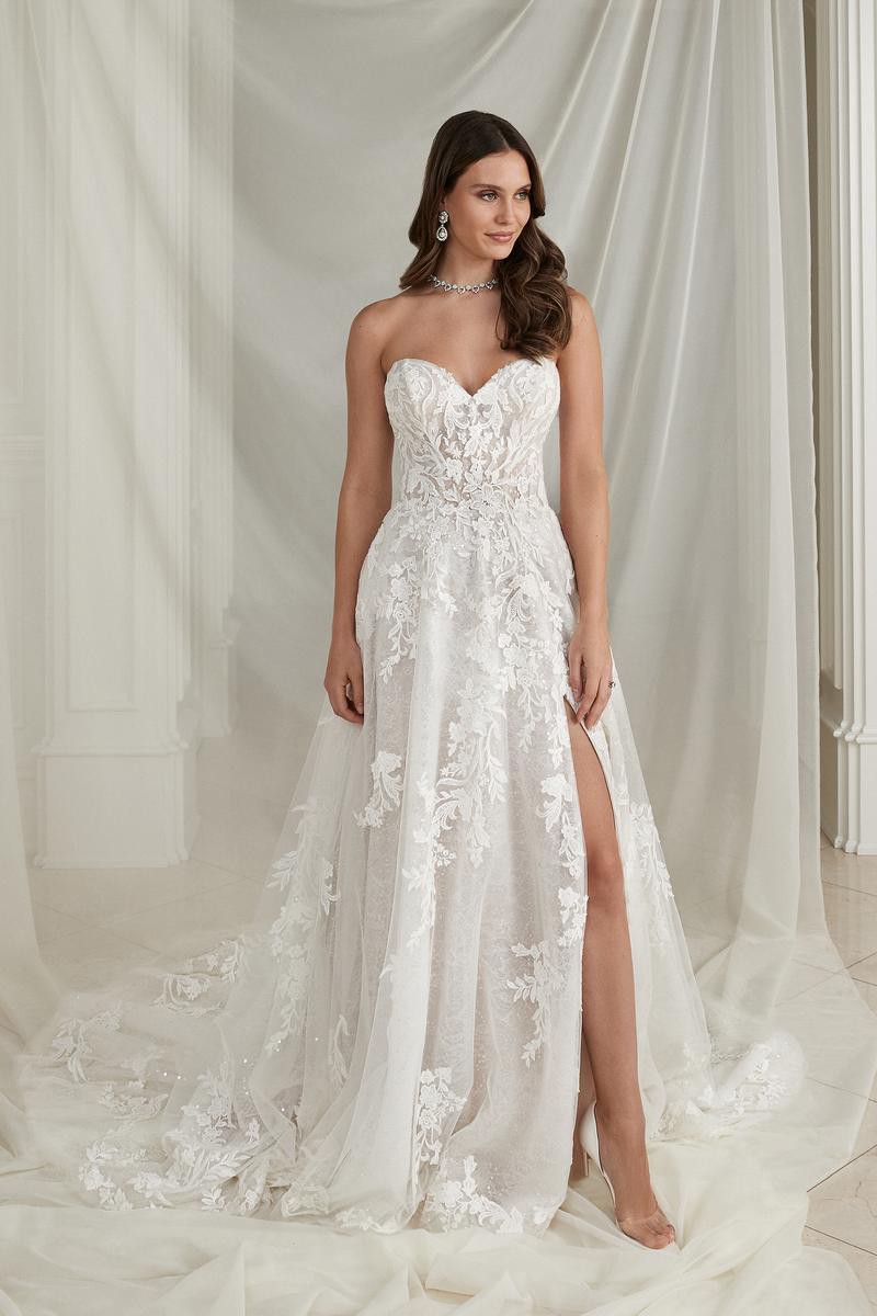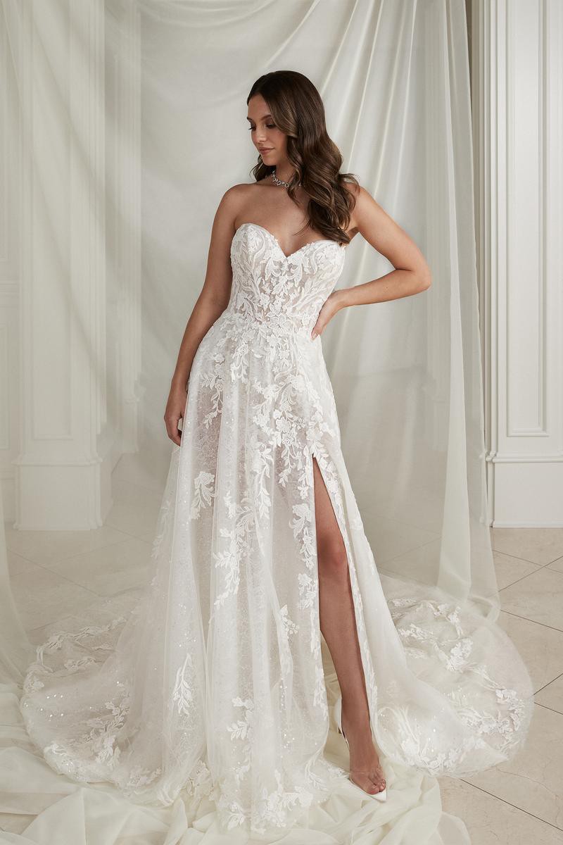 Sparkly A-line. Glistening from every angle, classic strapless sweetheart neckline features an illusion bodice adorned with lace appliqués. The appliqués cascade onto the A-line skirt and are met with a layer of sequined tulle blended with a Chantilly lace layer. The skirt includes a detachable snap-in lining complete with a slit for a sexy touch, and as a flirty look for the reception,