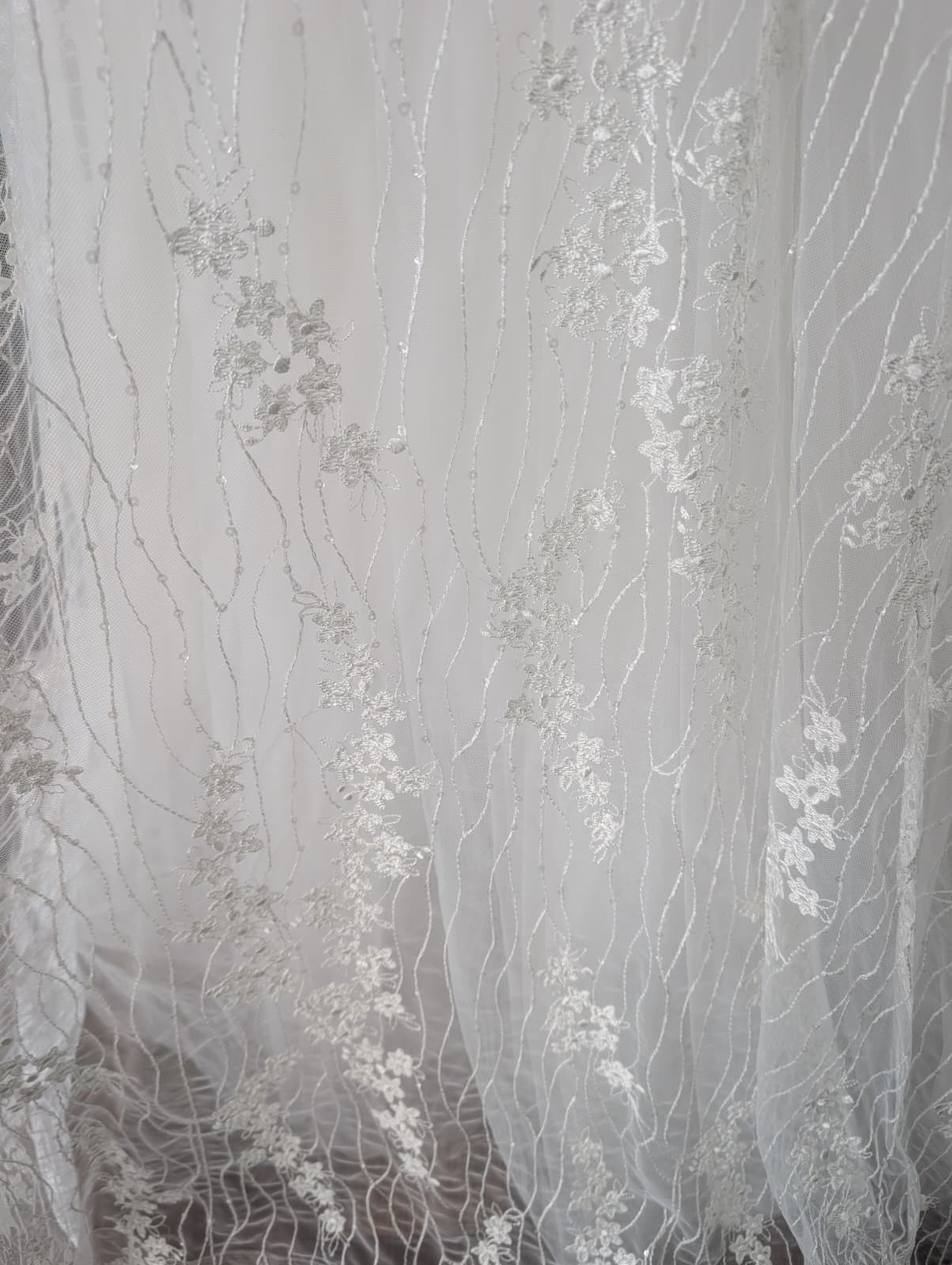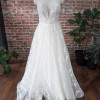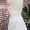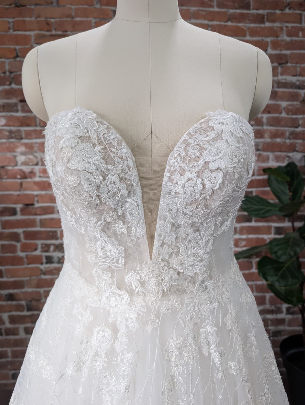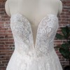 Soft and romantic plunging strapless sweetheart neckline. Dont worry, it WILL stay up if it fits properly because its a Pronovias, and these babies have great structure. Wispy, lace pattern thoughout the large (but not heavy) ball gown skirt.