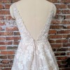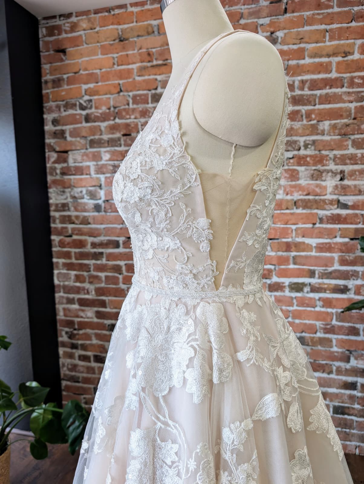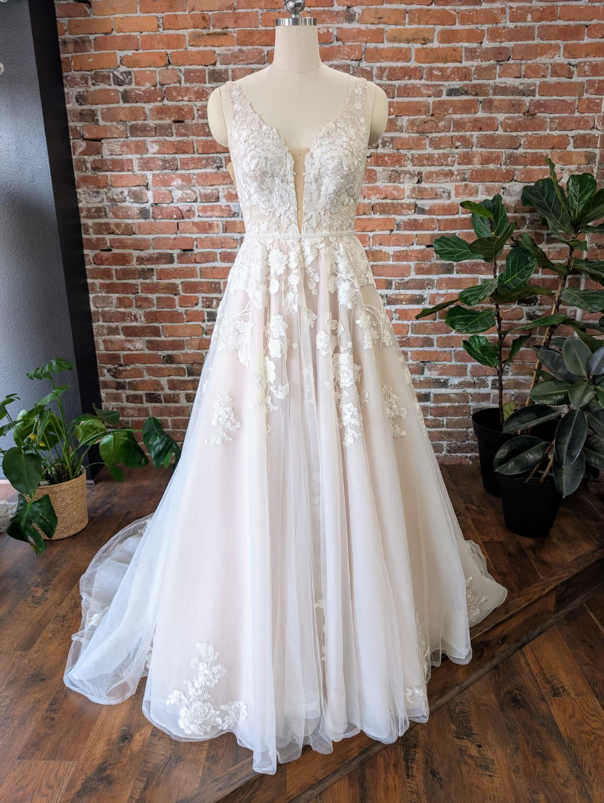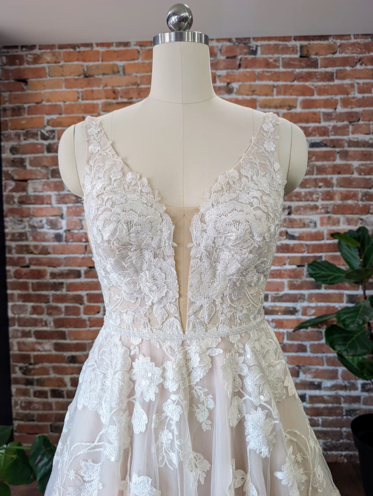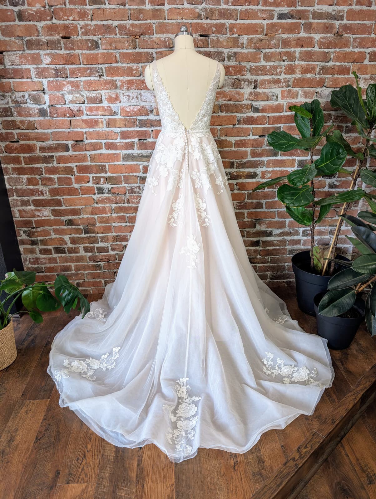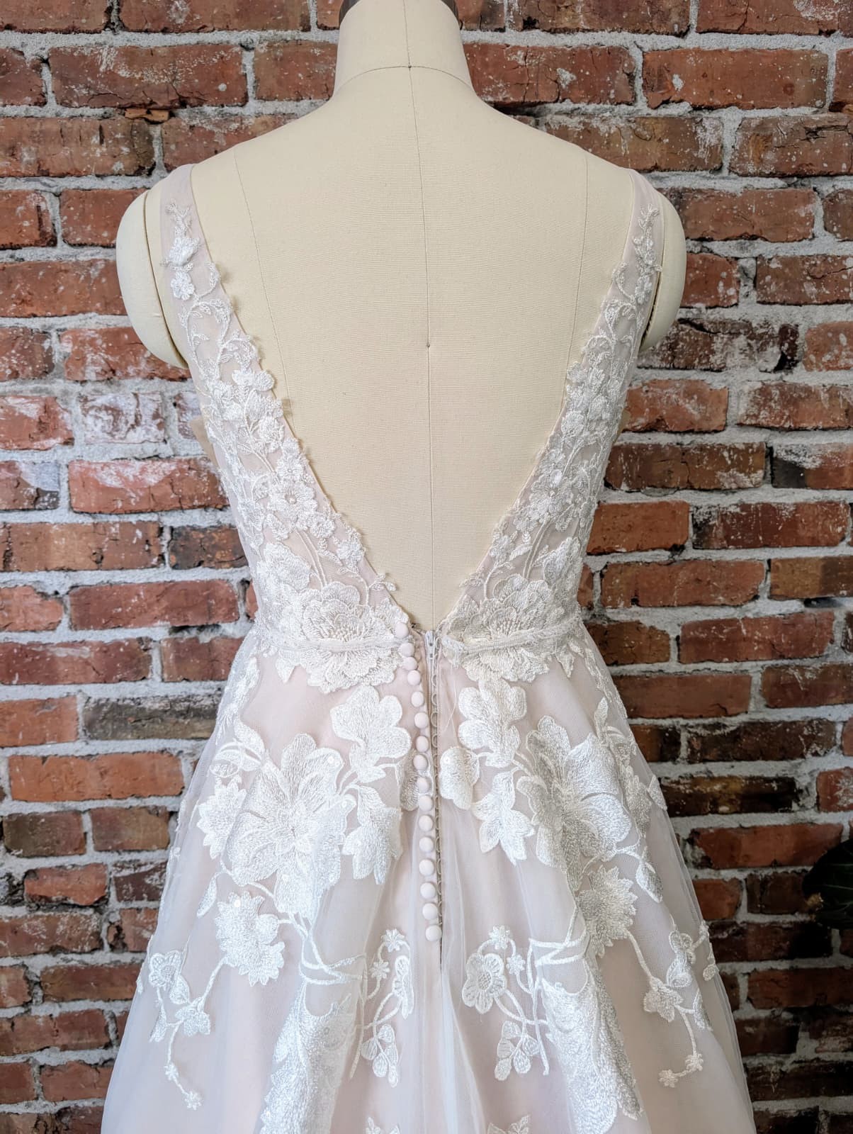 Bring the romance to your wedding day in this full A-line wedding dress with floral details from Essense of Australia. The gown's sheer bodice features a slim V-neckline with a fabric band and romantic, floral lace detailing. From the bodice, the botanical-inspired lace continues down the skirt in a unique mix of flowers, leaves and vines. The gown's V-back is highlighted with lace appliques that cascade down the tulle skirt and train. The back of this full A-line wedding dress with floral details zips up beneath fabric-covered buttons.
