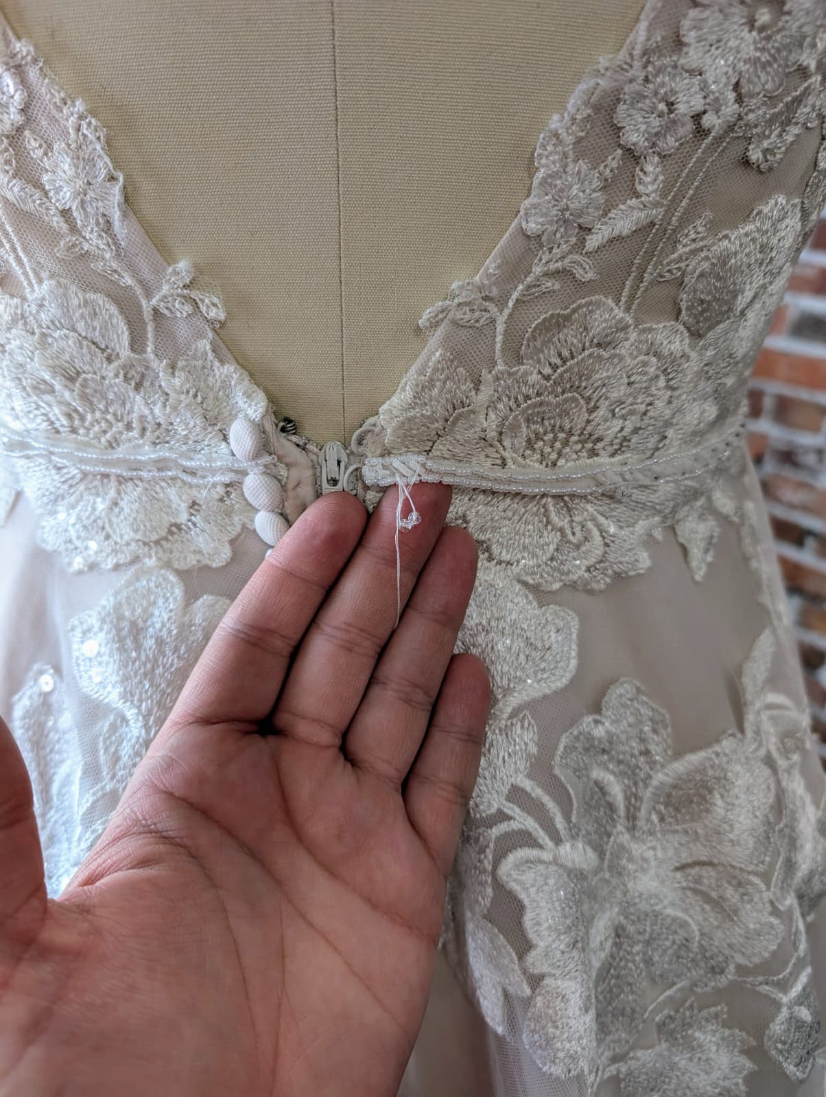 - Tear in tulle on edge of train and minor beading issues