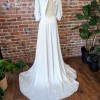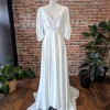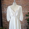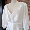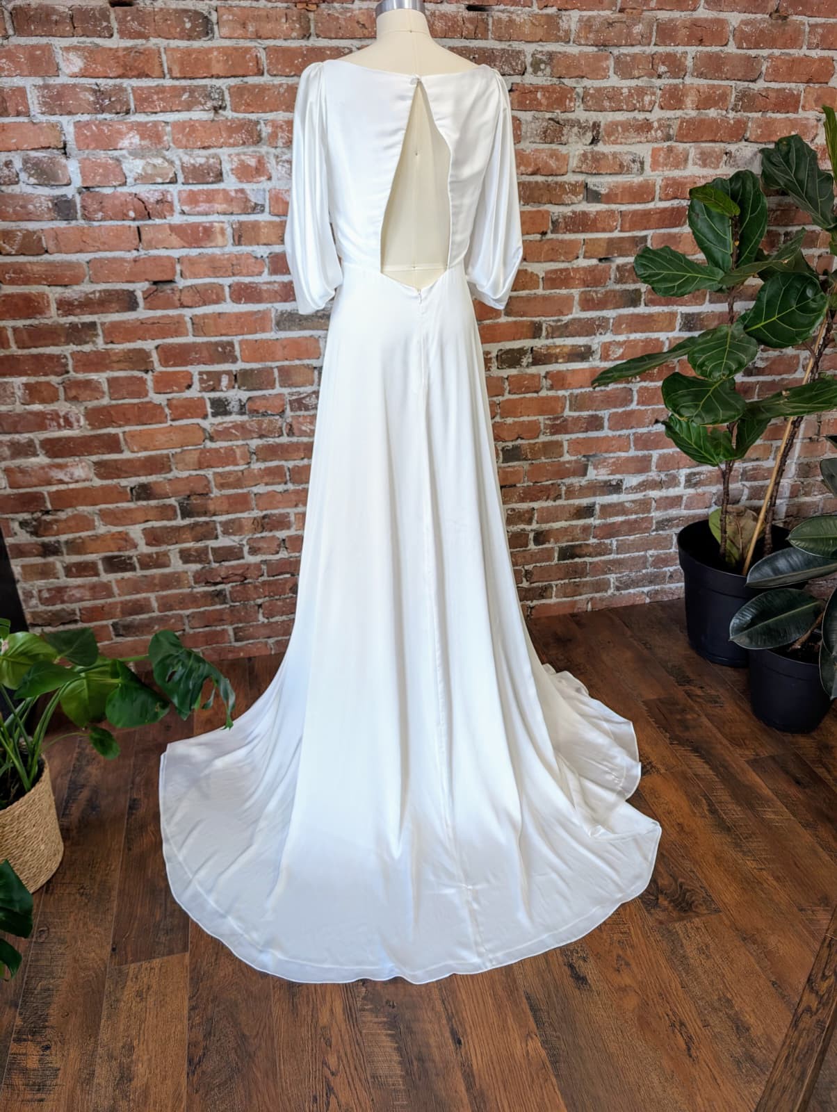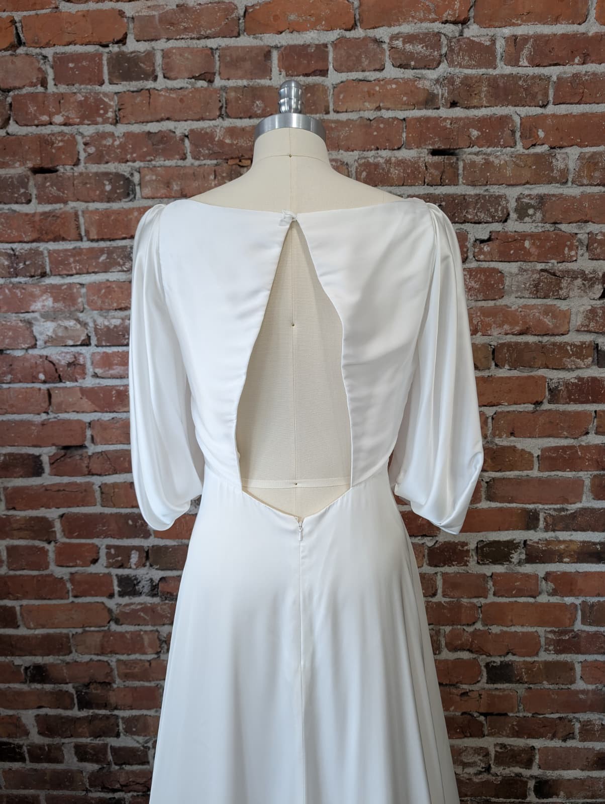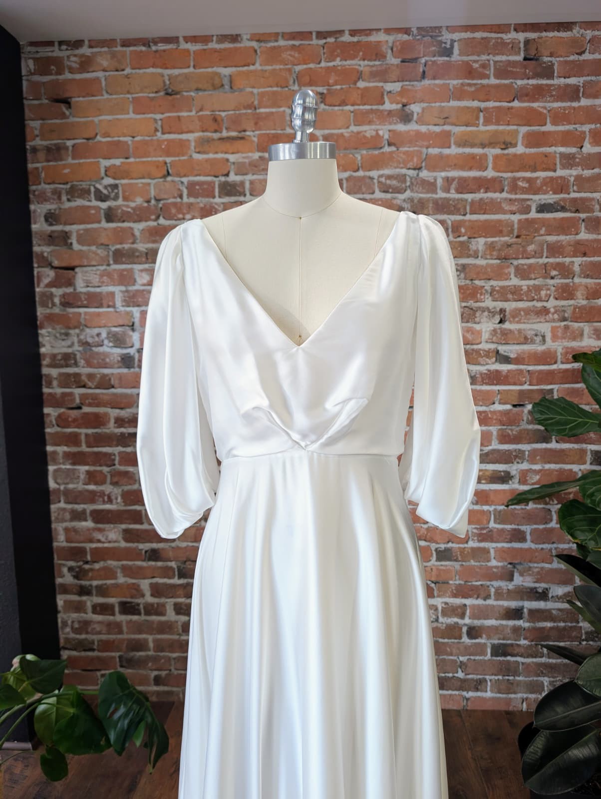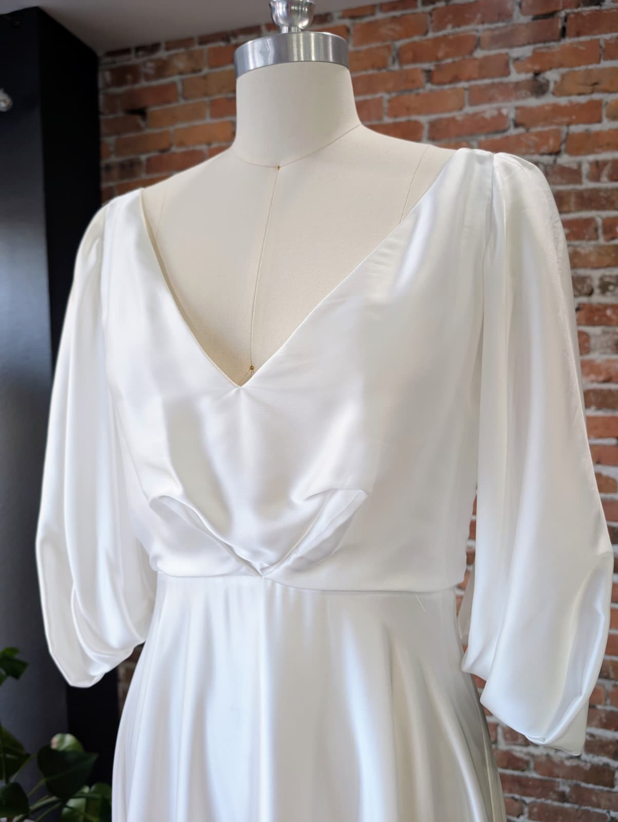 V neck, 3/4 bishop sleeve, blousy pleated bodice and flowy circle skirt. The bodice is lined in breathable organic bamboo charmeuse, but the most exciting secret of this gown is the fact it is made from luxury charmeuse satin which is spun entirely from recycled bottles reclaimed from the ocean.