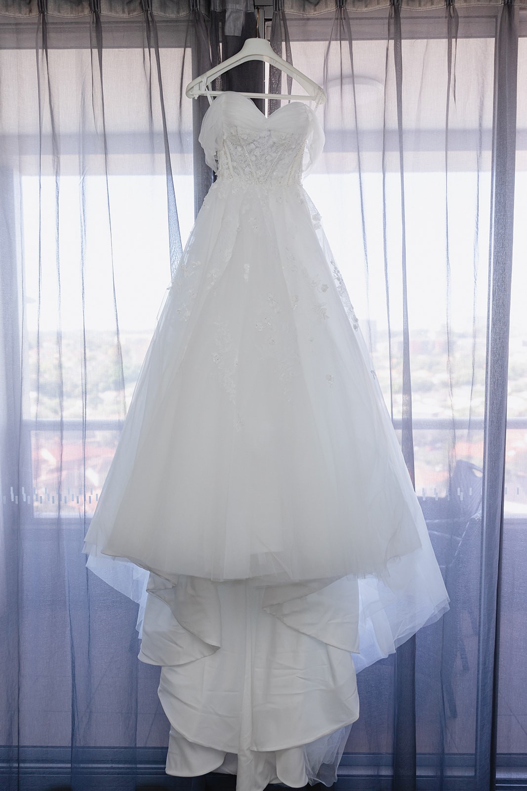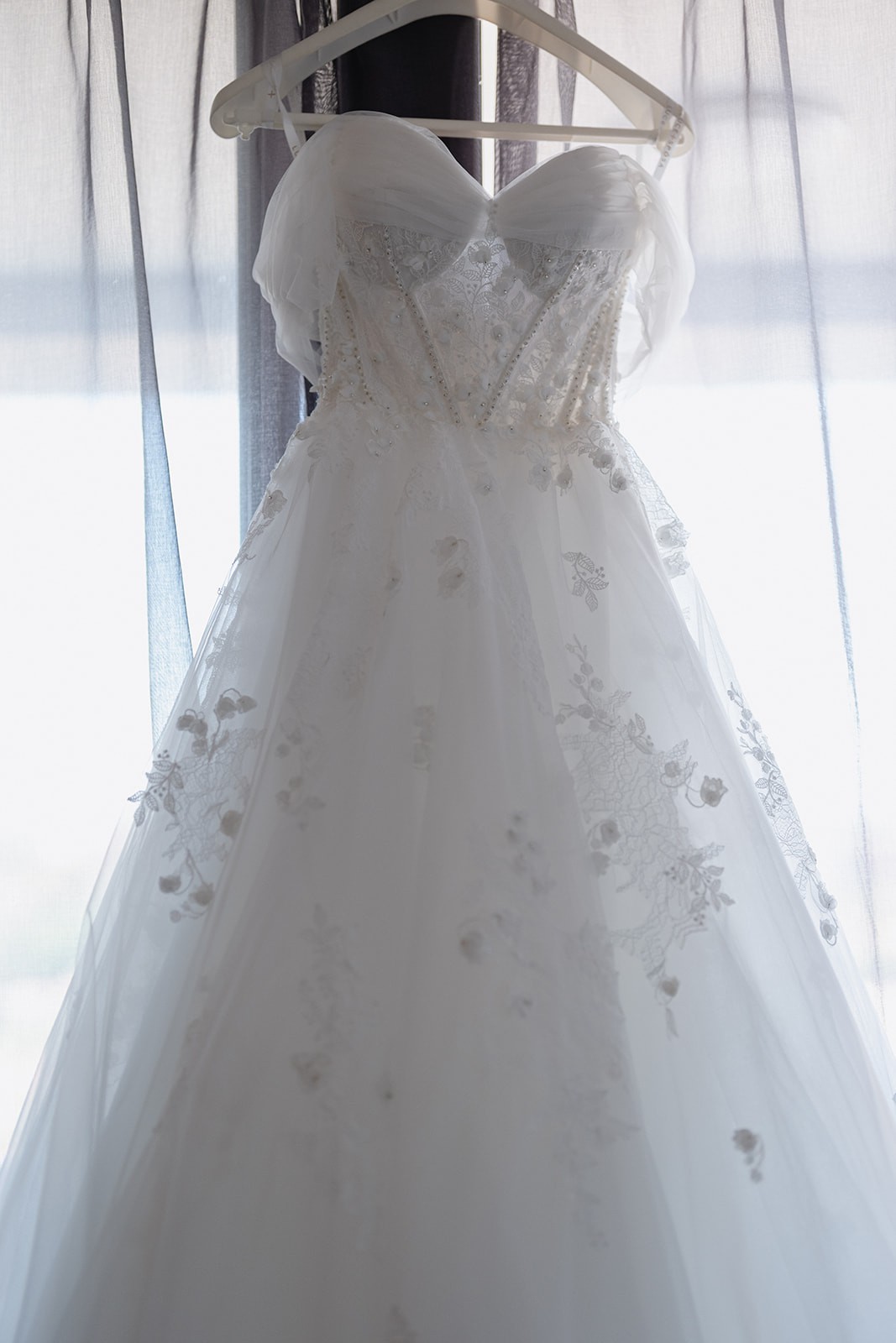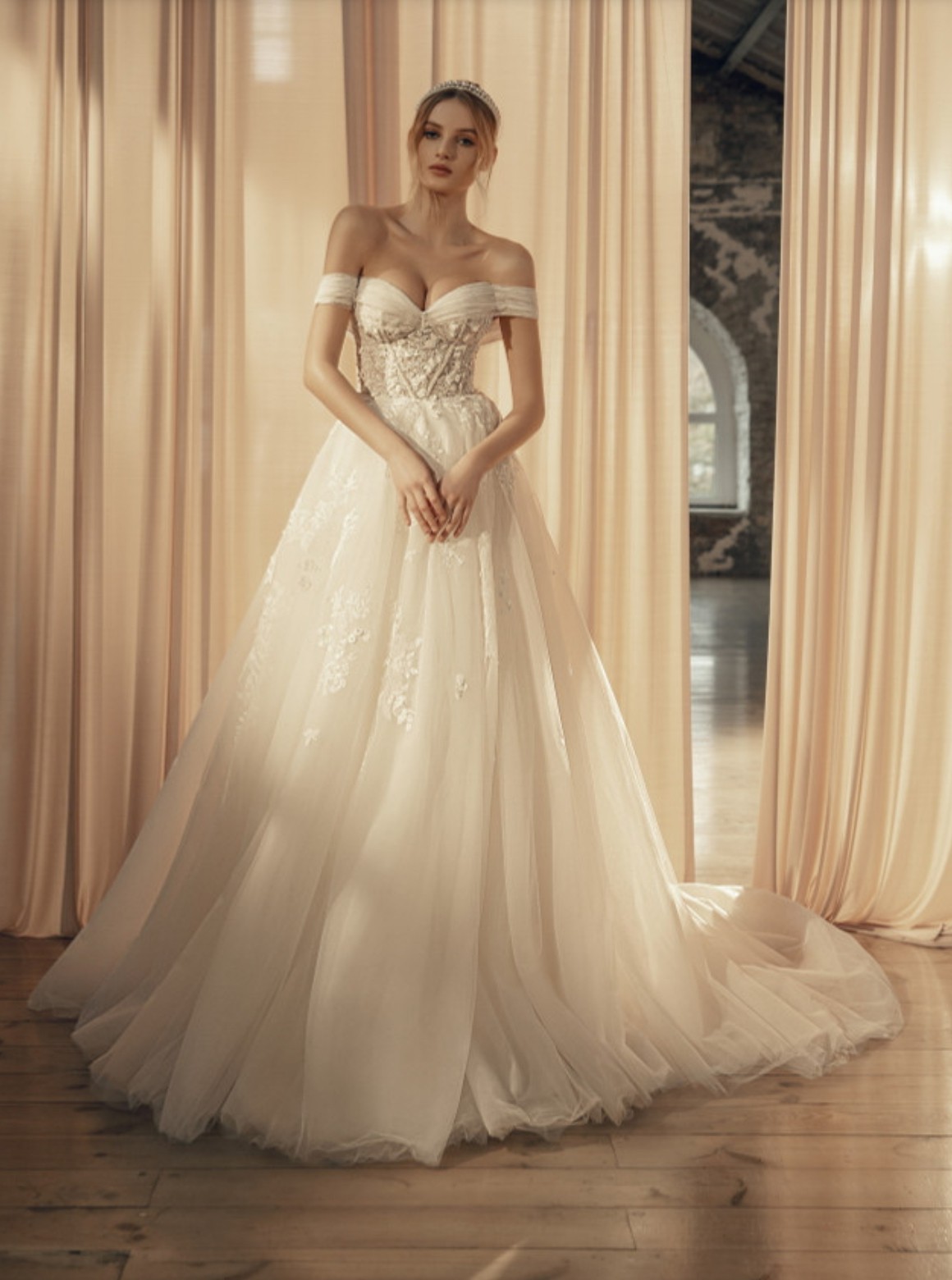 This stunning Megan A-Line Beaded Sequin wedding dress from Luce Sposa is truly a dream come true for any bride. With a mesmerising silhouette that flatters every curve, this size 6 gown features an enchanting off-the-shoulder neckline that adds elegance and grace to your wedding day look.