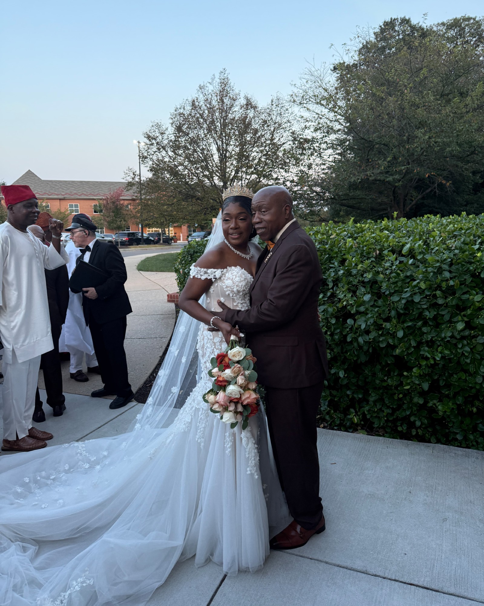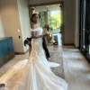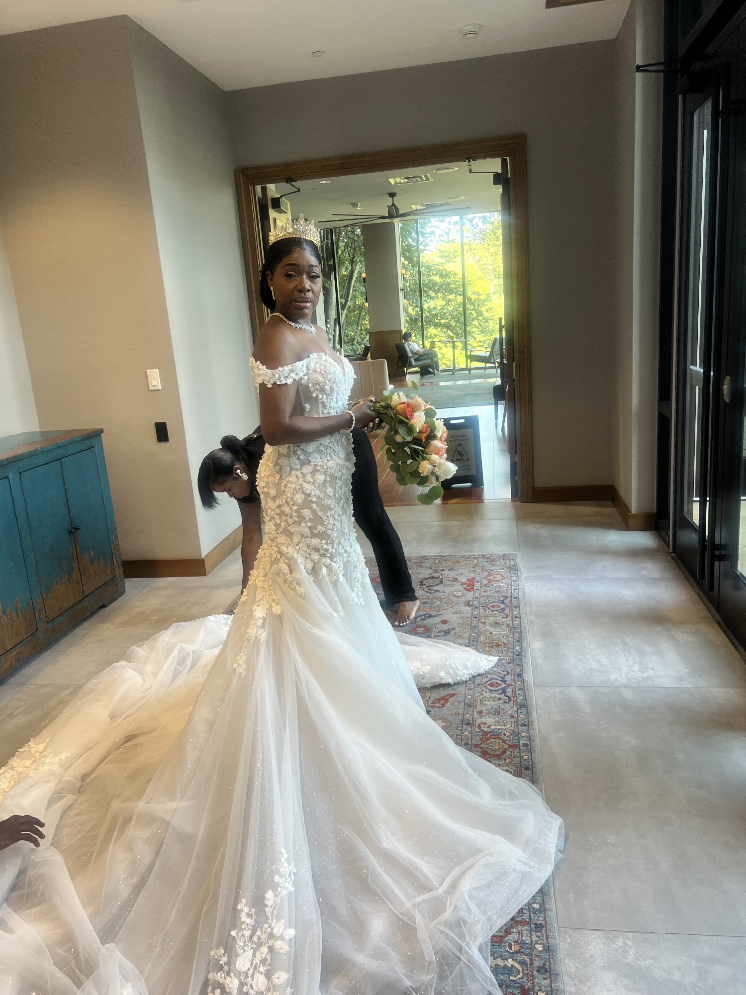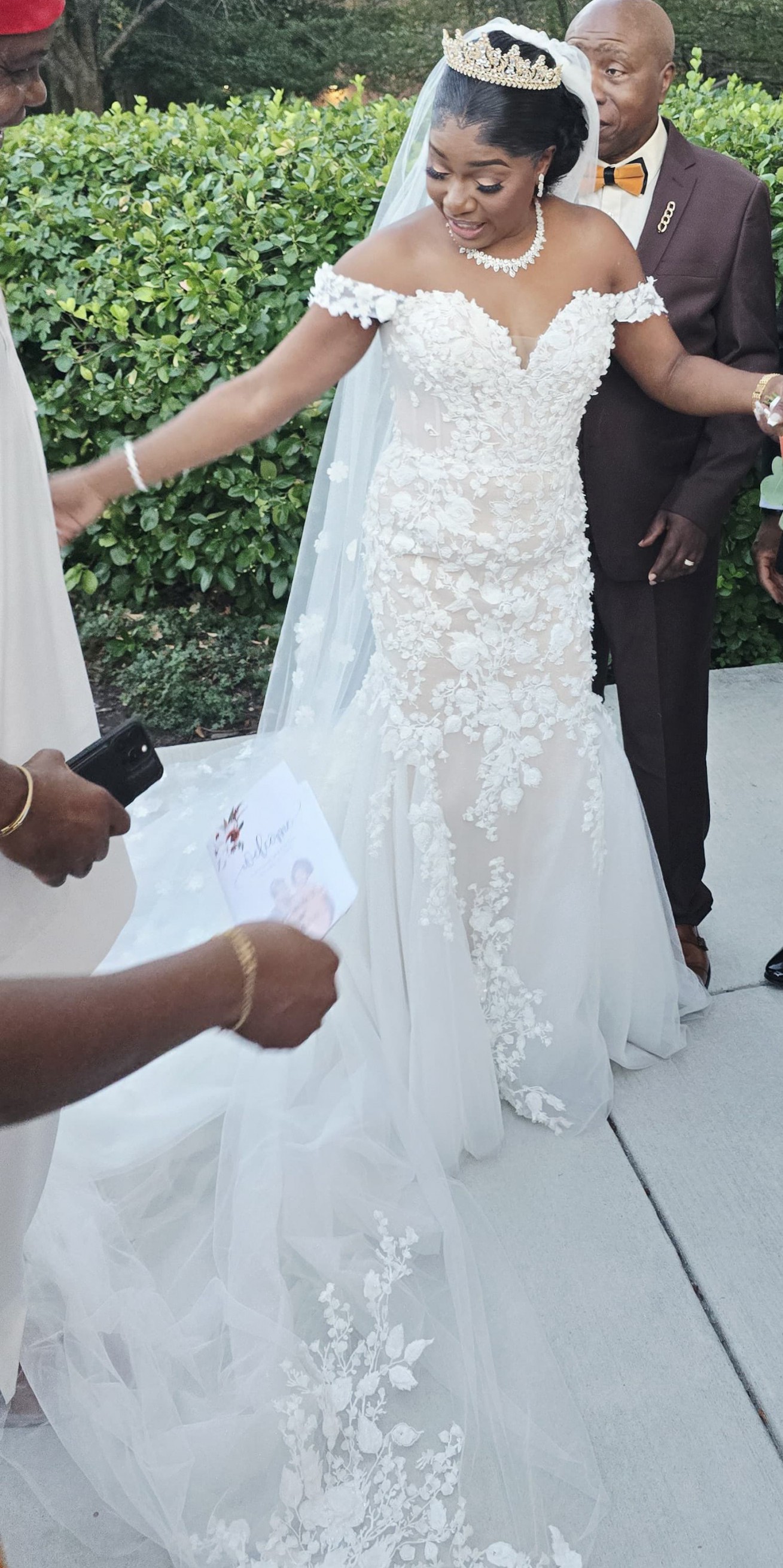 Beautiful fitted off the shoulder ivory and nude dress with petal attached.I have the veil with petals which was bought separately but I will give one price for the dress. I got married in September