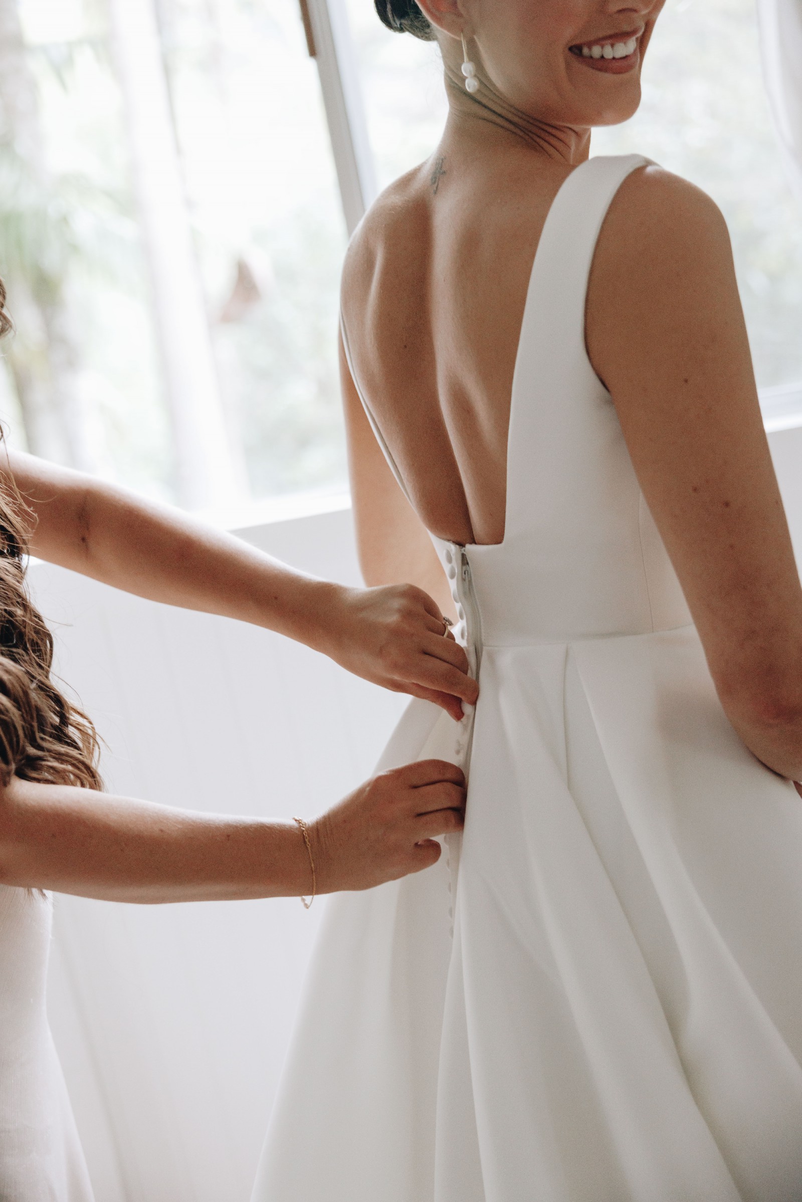 - Dress was brought in at the waist & very slightly up at the shoulder to fit my measurements as stated in ad